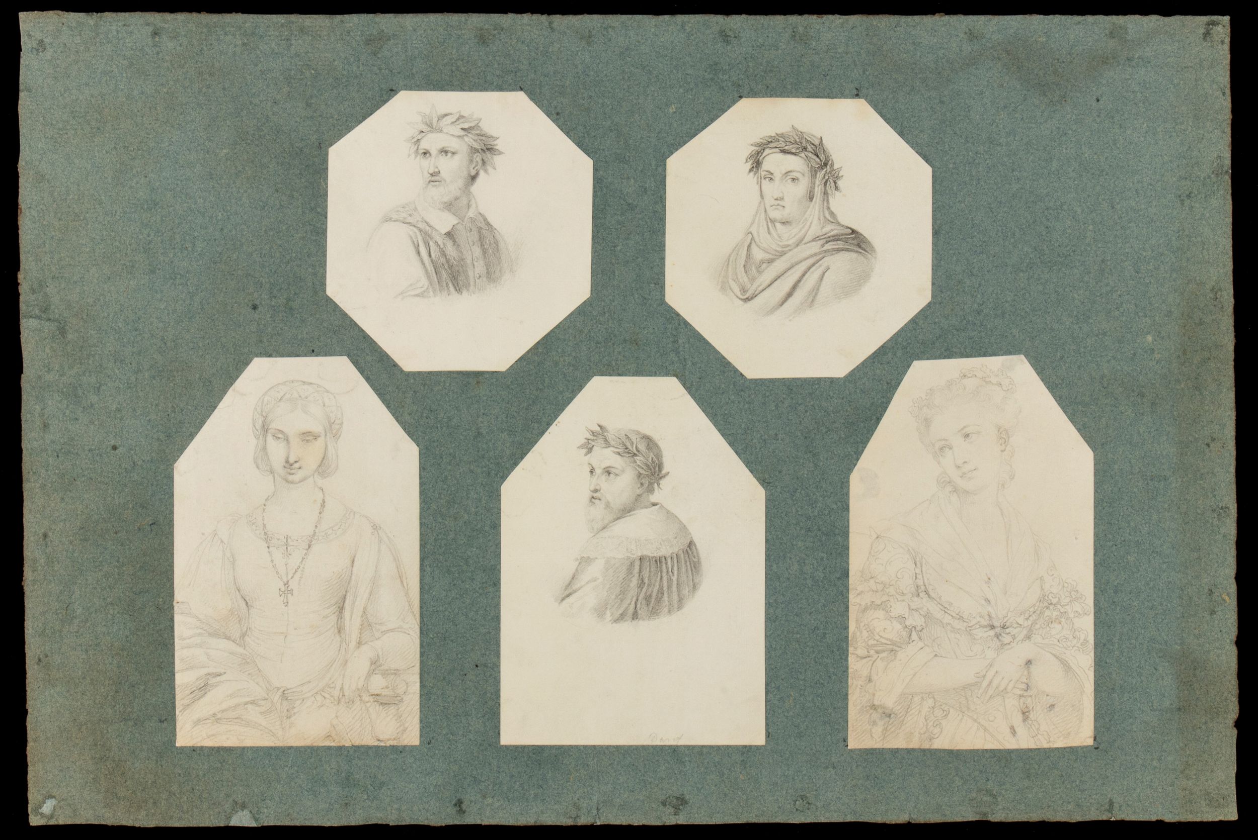 Serie di cinque ritratti: tre poeti coronati di lauro e due figure femminili