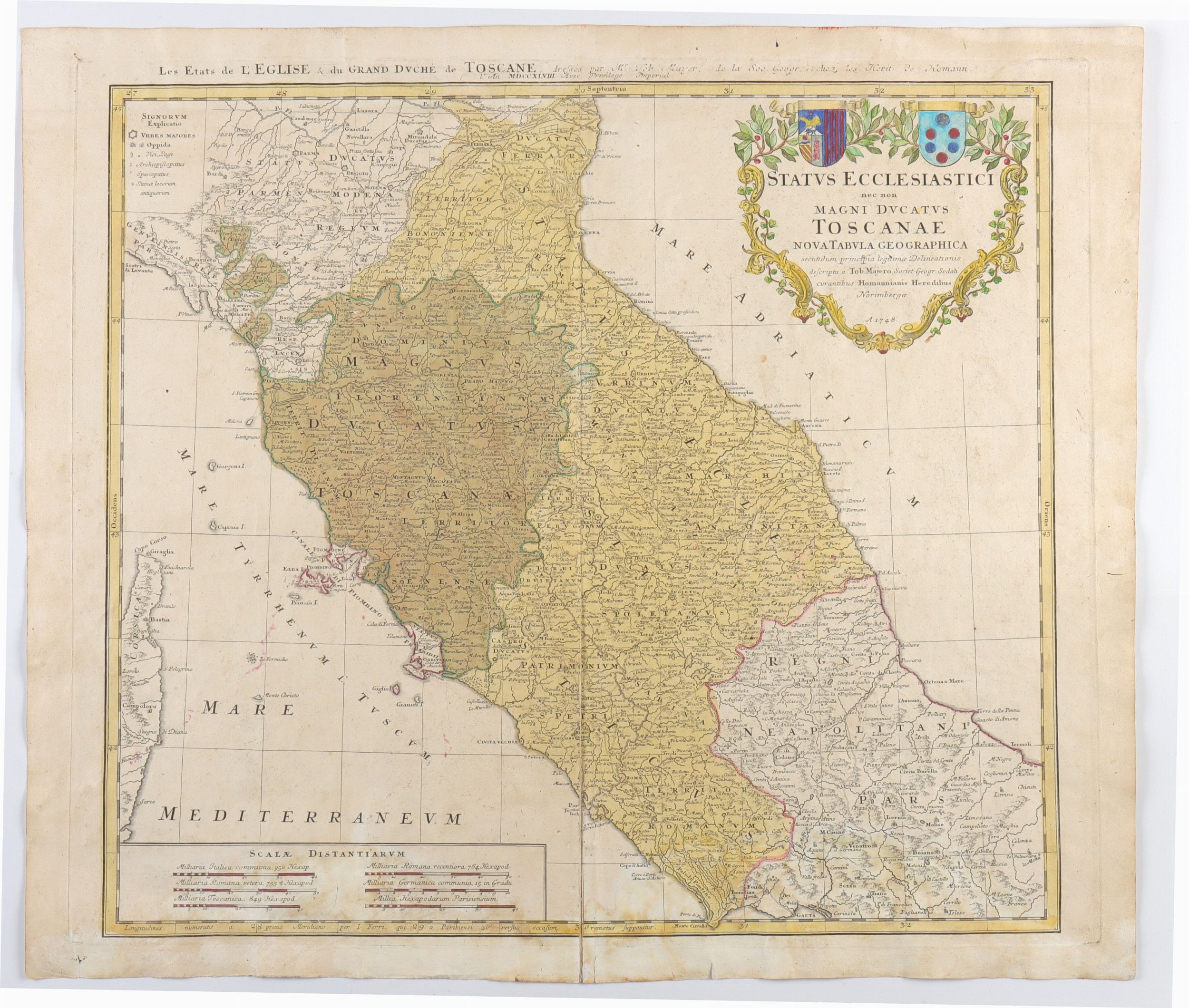 Acquaforte, 525 x 710 mm (foglio). Mappa dello Stato della Chiesa con la Toscana tratta da Atlas Compendiarius Quinquaginta Tabularum Geographicarum Homannianrum.
