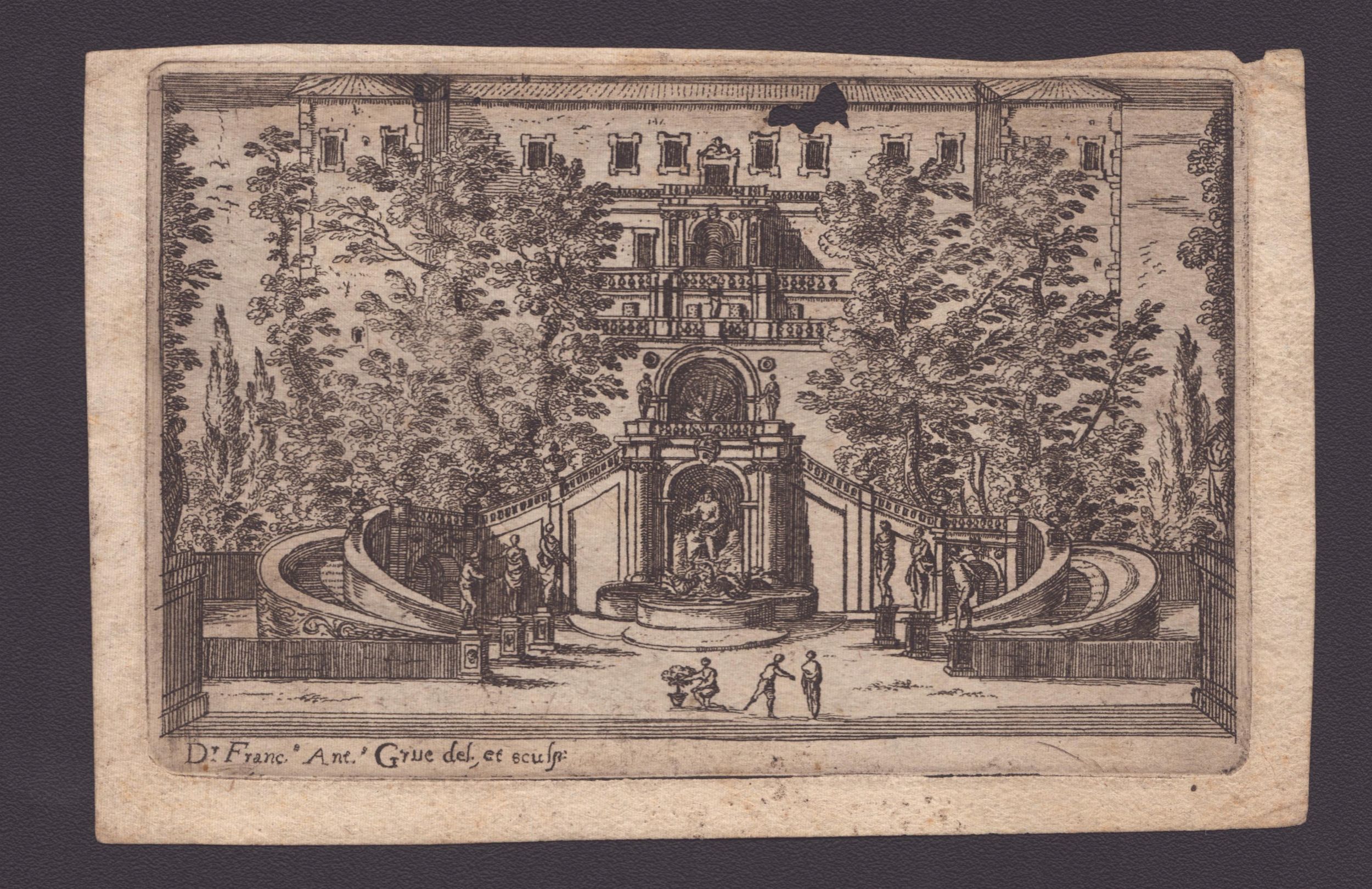 Acquaforte, 80 x 123 mm (lastra), 88 x 136 mm (foglio).Rara impressione. Iscritta: D.r Franc.s ant.s Grue del. et sculp.:Bella, fresca impressione su carta vergata. In ottimo stato salvo quattro fori in alto.