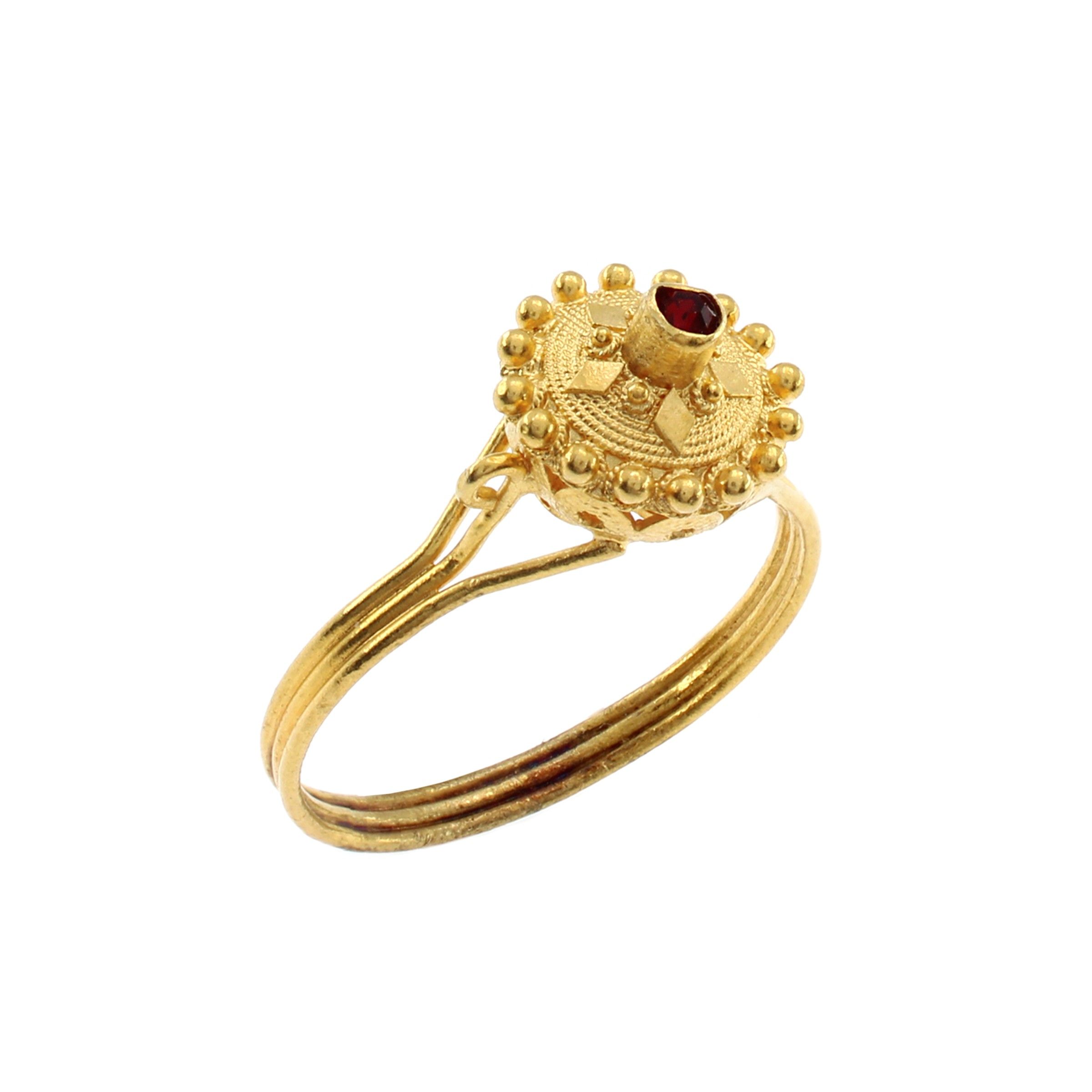 Anello in oro giallo 18kt in filigrana sarda con granato