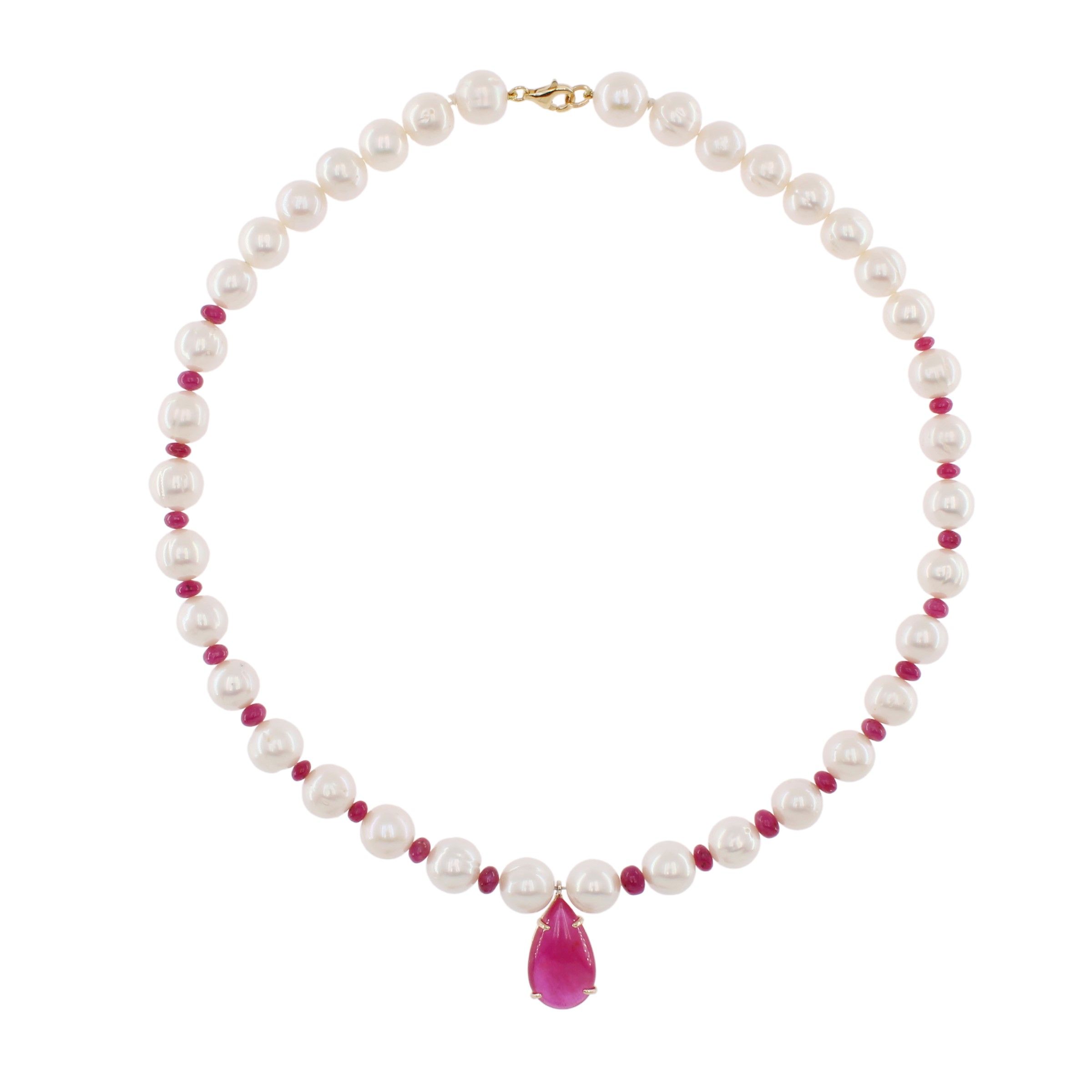 centrata da pendente con rubino a goccia, perle 10 mm. circa, chiusura in oro giallo 18kt, lunghezza 46 cm.