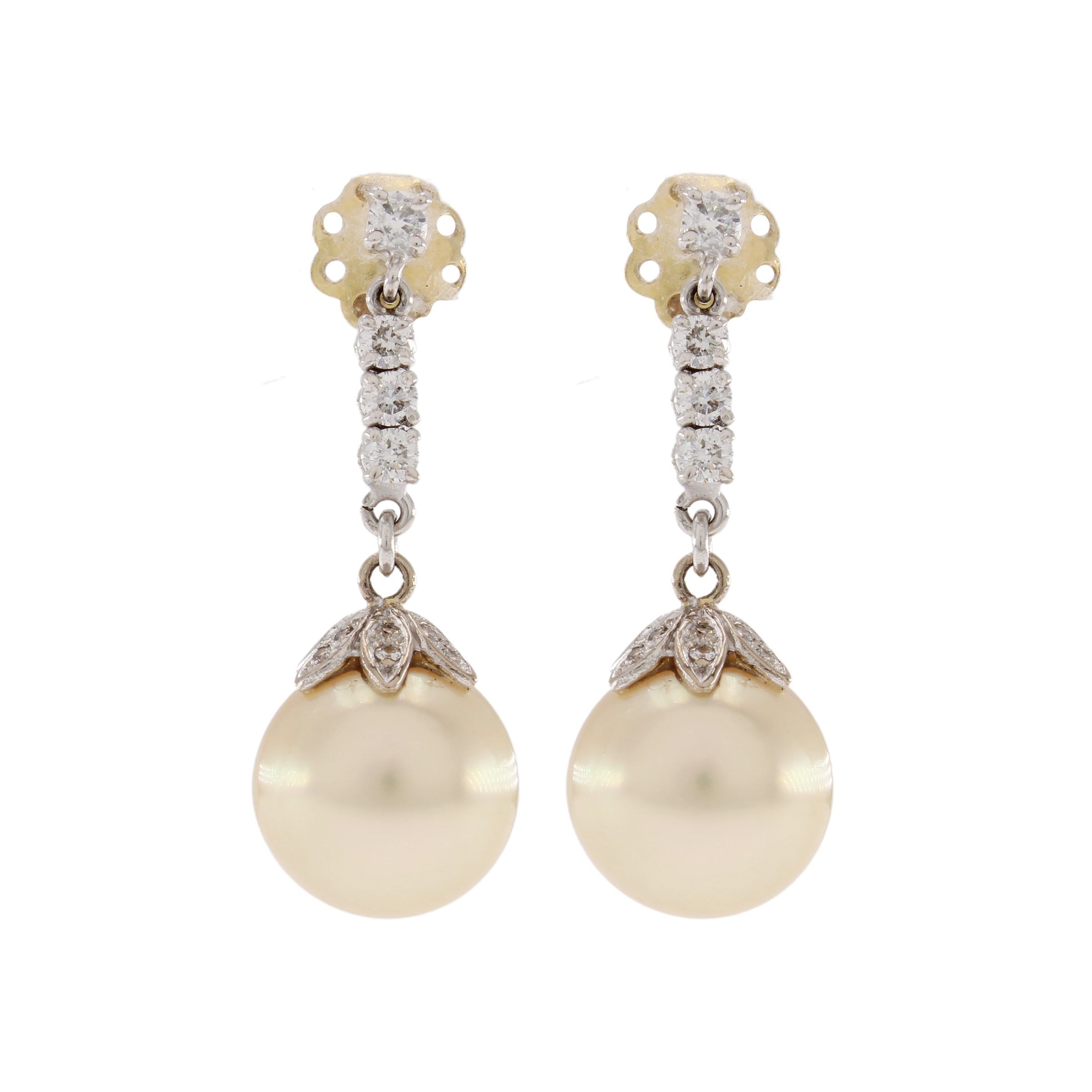 Orecchini pendenti in oro bianco 18kt perle golden e diamanti