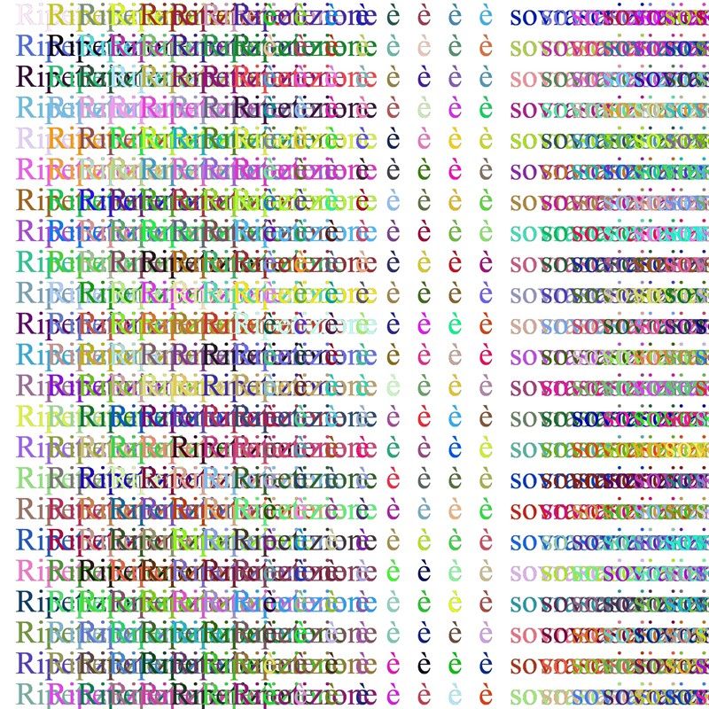 L’unico elemento leggibile senza sforzo nel pezzo è “è”. Questa scelta è dovuta al fatto che il verbo fa da collegamento fra la parola e il suo riferimento specifico.