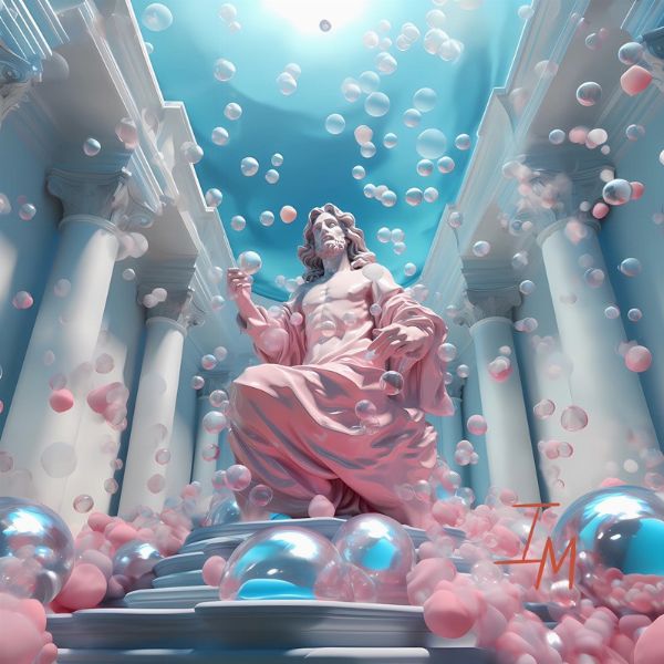 Il mondo di Gesù fa parte della collezione "Gateway to paradise". La porta dei regni celesti assomiglia al mondo dei sogni, quello in cui si entra quando si chiudono gli occhi. Gesù e la religione sono simboli di onestà con se stessi, onestà di fronte ai propri sogni. Le bolle, come simbolo dell'artista, rappresentano la forma perfetta del mondo e dei sogni.