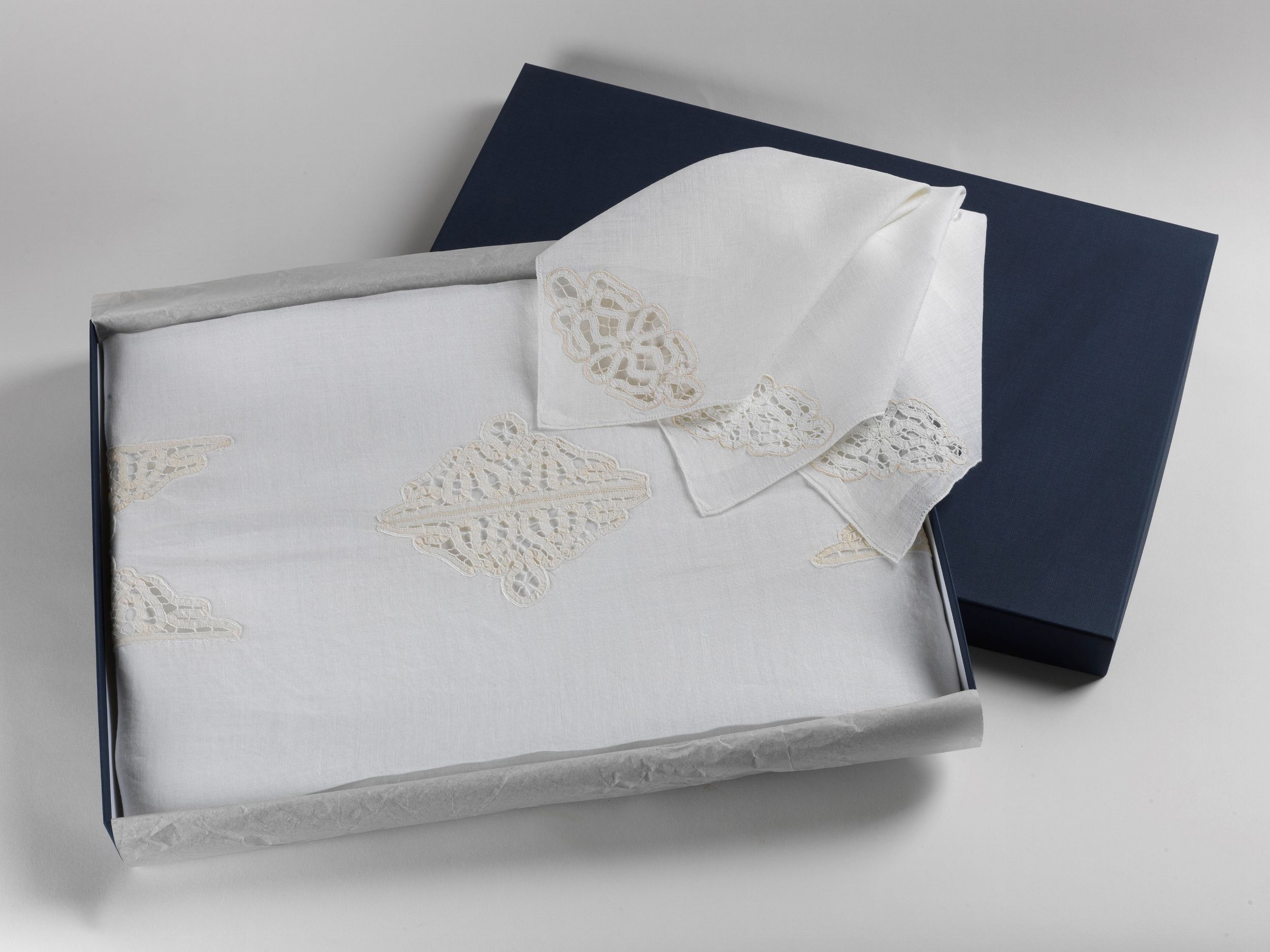 Tovaglia con dodici tovaglioli in lino bianco