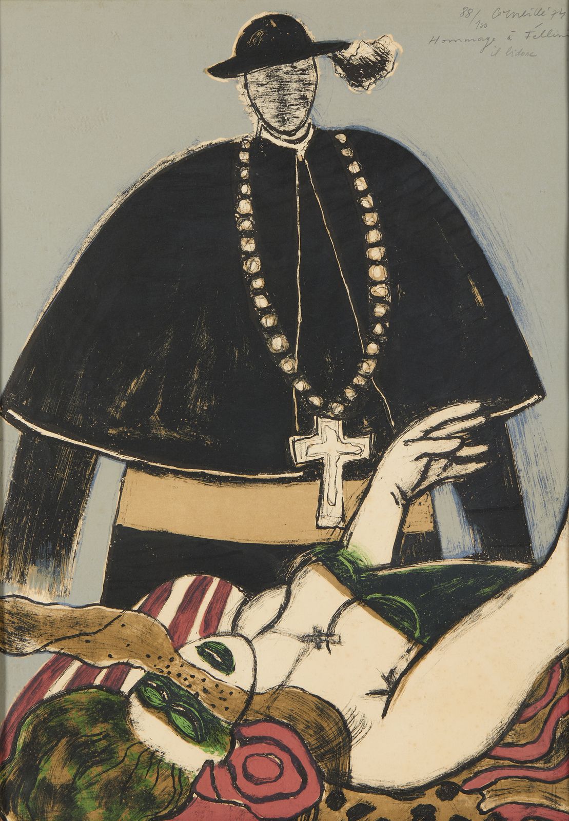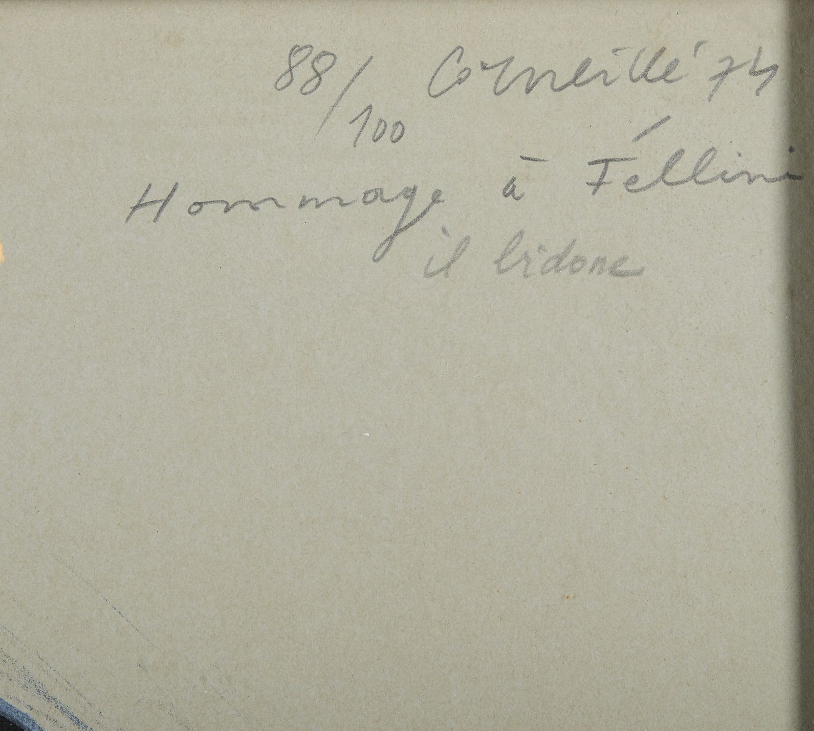 88/100. Tiratura, firma, titolo e anno in alto a destra a matita. Il foglio fa parte della cartella Hommage de 9 peintres de Paris a Federico Fellini (Corneille, Kijno, Labisse, Lindstrom, Messagier, Pignon, Prassinos, Singier e Zao Wou Ki). Edizione totale: 100 esemplari numerati con numeri arabi (riservata al mercato italiano) + 25 esemplari numerati con numeri romani (riservata al mercato francese). Editore: Edizioni Gregory, Roma.
