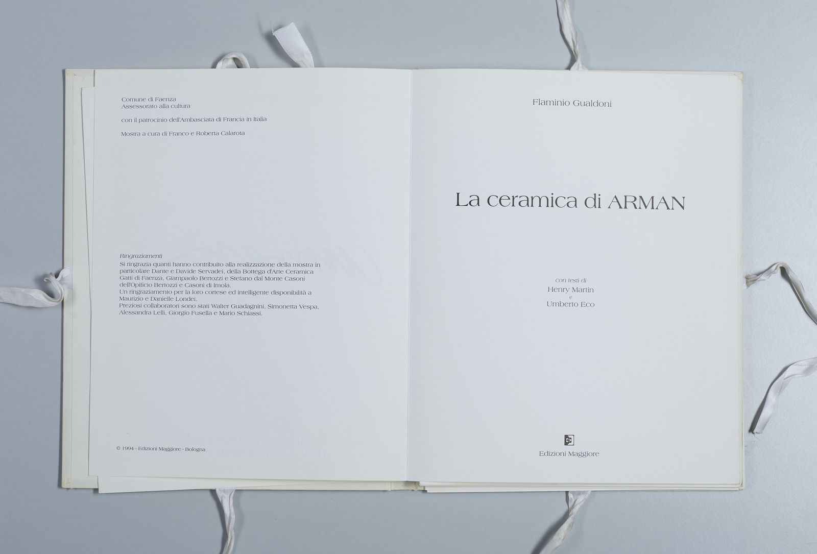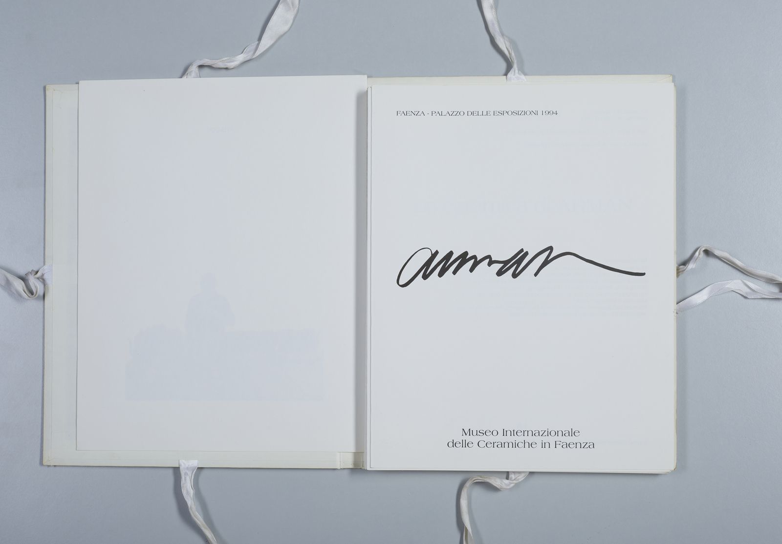 Catalogo della mostra ''La ceramica di Arman'', Museo Internazionale delle Ceramiche di Faenza, Palazzo delle Esposizioni, Faenza, 1994. Catalogo a cura di Flaminio Gualdoni, con testi di Henry Martin e Umberto Eco, Edizioni Maggiore, Bologna, 1994. Dimensioni libro aperto: 31x50 cm. Lievi difetti.