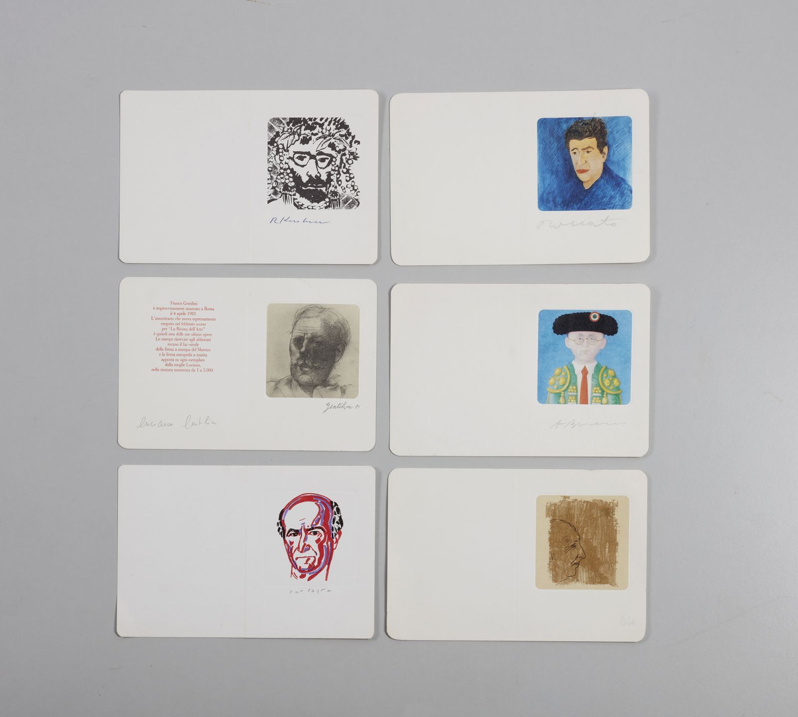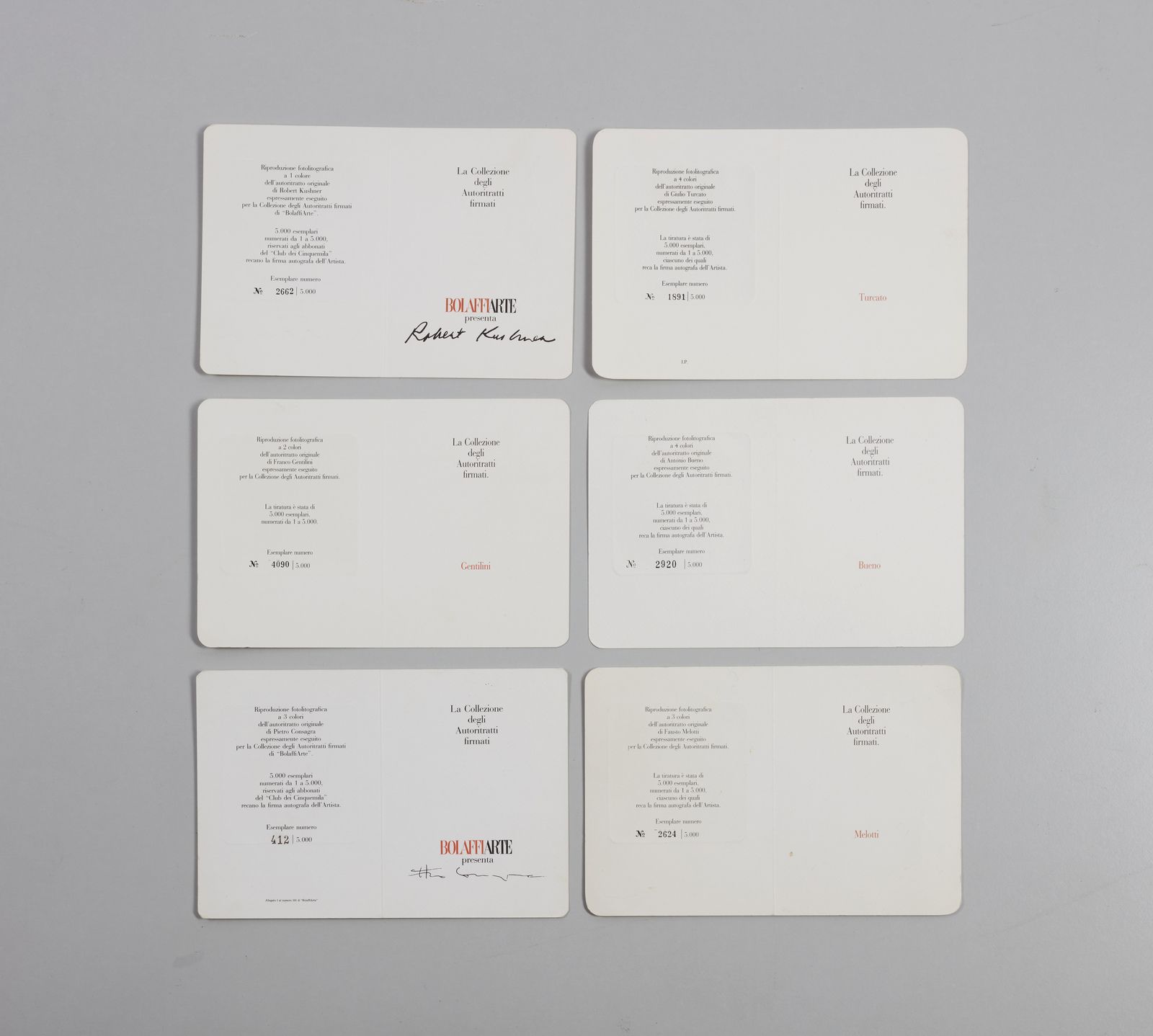 Edizione totale: 5000 esemplari firmati.1. Pietro Consagra. 412/5000. Firma in basso al centro a matita. Dimensione lastra: 7.6x7.6 cm.2. Antonio Bueno. 2920/5000. Firma in basso al centro a matita. Dimensione lastra: 7.6x7.6 cm.3. Robert Kushner. 2662/5000. Firma in basso a sinistra a penna. Dimensione lastra: 7.6x7.6 cm.4. Franco Gentilini. 4090/5000. Fiirma a lastra di Franco Gentilini in basso a destra. Firma di Luciana Gentilini a matita.5. Fausto Melotti. 2624/5000. Firma in basso a destra a matita. Dimensione lastra: 7.6x7.6 cm. Lievi difetti.6. Giulio Turcato.1891/5000. Firma in basso al centro a matita. Dimensione lastra: 7.6x7.6 cm.