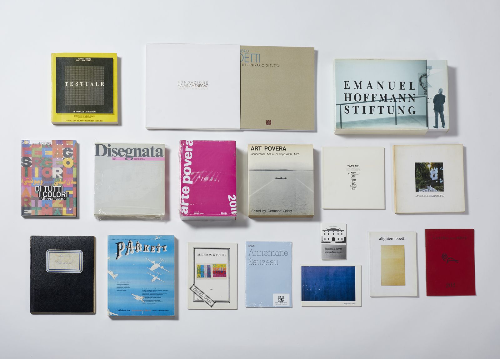 1) 30x27,5cm. Catalogo della mostra: ''Alighiero Boetti. tutto e il contrario di tutto'', Francesco Poli, Fondazione Malvina Menegaz per le arti e le culture, 2010.2) 29x22,5cm. Catalogo. ''Emanuel Hoffmann Stiftung'', Emanuel Hoffmann - Stiftung, Basel, Maja Oeri, Theodora Vischer, 1991.3) 21x22cm, ''Testuale, le parole e le immagini'' Flavio Caroli - Luciano Caramel, rotonda di via Besana, giugno-settembre 1979. Comune di Milano\ Mazzotta Editore.4) 21x25,5cm. ''Parkett'' N.24, Art Magazine, collaboration Alighiero Boetti, insert: Cindy Sherman, 1990.5) 21x23 cm. ''Art Povera, conceptual, actual or impossible art?'' Germano Celant, studio vista, Londra, Gabriele Mazzotta publishers Milan, 1969.6) 17,5x24cm. ''Arte povera'', Germano Celant, Electa.7) 22x23cm. ''Disegnata, percorsi del disegno italiano dal 1945 ad oggi''. Essegi Edizioni.8) 22,5x22cm. ''La traccia del racconto, 21 artisti italiani contemporanei'', rassegna d'arte figurativa a cura dell'assessorato al turismo, Villa comunale Ormond- Sanremo - dicembre '77 - gennaio '78, a cura di S. Beniamino, G. Marconi, R. Sanesi.9) 17x24cm. '' Grandi opera, di tutti i colori'', Alberto Boatto, Editori Laterza GLF, 2008.10) 20x20cm. Catalogo mostra: ''De Europa'', John Weber Gallery, april 29, 1972,11) 19,5x24,5cm. ''Man Ray, Clin d'Oeil'', Giuliano Martano, Galleria Il Fauno, Galleria Martano, Torino.12) 15x21cm. Catalogo della mostra: ''Alighiero Boetti'' 9 ottobre- 29 novembre 1997, Fabia Calvasina, Aete Contemporanea, Milano.13) 15,5x21cm. ''Alighiero & Boetti, A è il segreto e B è l'uscita'' testo di TommasoTrini, 1985, Galleria Chisel, Chisel Book.14) 19x13,5 cm. Esibizione: ''Alighiero e Boetti'' 25 gennaio - 6 aprile 2002, the arts club of Chicago.15) 16x21,5 cm. ''202'', inaugurazione della mostra- 31 marzo - 1977, Boetti, Galleria dell'Ariete, Milano.16) 14,5x 21 cm. ''Annemarie Sauzeau Alighiero Boetti's one hotel/ Alighiero Boettis one hotel'', n. 205, 100 notes-100 thoughts / 100 notizen - 100 gedanken.17) 8x12cm. ''Alighiero & Boetti, insicuro noncurante'' Museo Casabianca, Campanotto Editore.