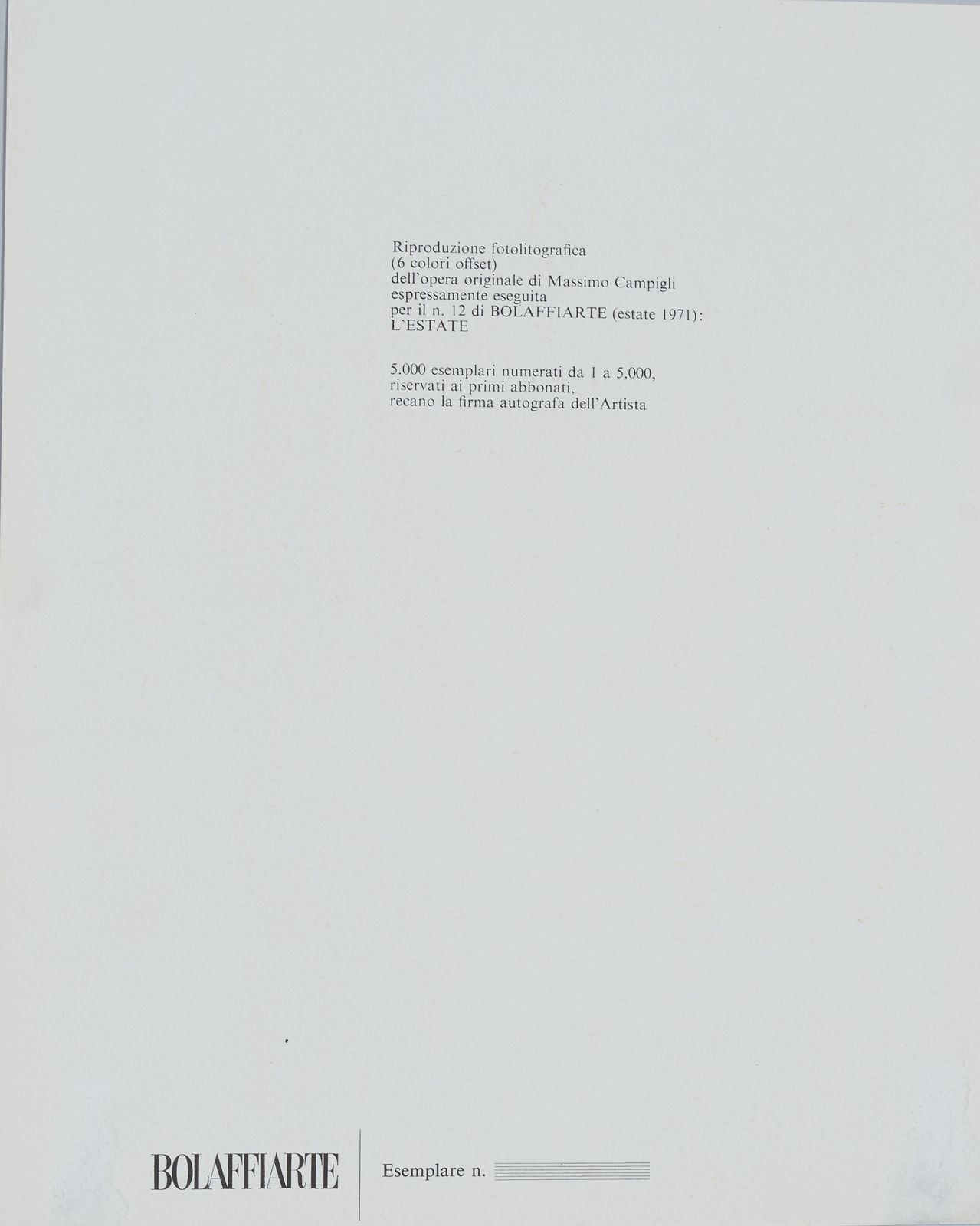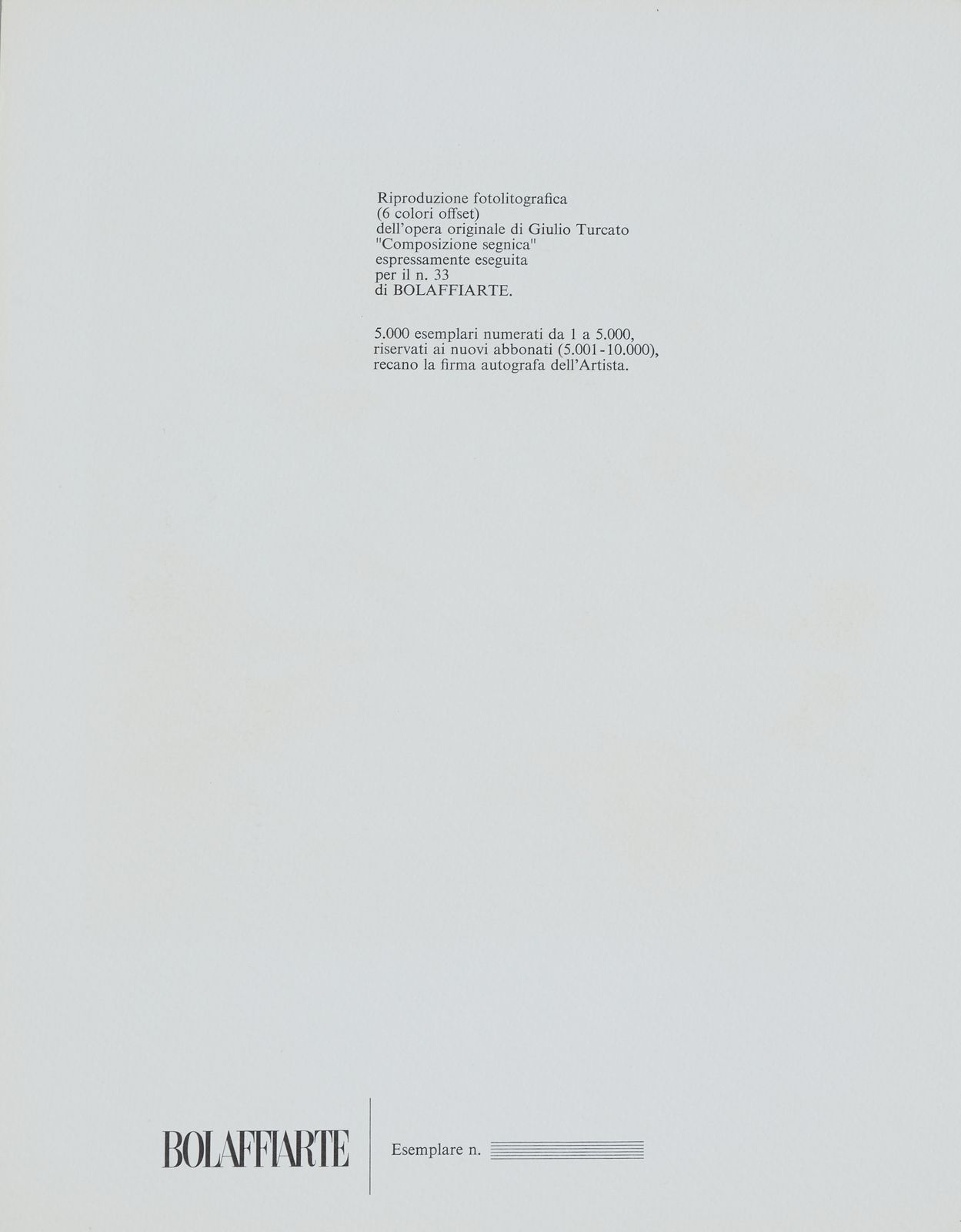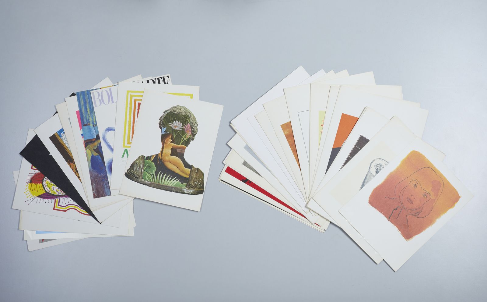 Lotto composto da n.91 riproduzioni fotolitografiche per Bolaffiarte.Per la serie ''L'alfabeto (20): Lucio del Pezzo. A. Mario Ceroli. B. Gianni Dova. D. Andrea Cascella. E. Jean Michel Folon. F. Salvador Dalì. G. Giuseppe Santomaso. H. Fausto Melotti. I. Cesare Peverelli. J.Salvatore Fiume. K. Pietro Consagra. L. Joan Mirò. M. Max Bill. N. Giorgio de Chirico. O. Corrado Cagli. P. Graham Sutherland. S. Giacomo Manzù. T. Wilfredo Lam. W. Pietro Cascella. Y. Calder. Z.Per la serie ''I cinque sensi'' (5): Robert Rauschenberg. Il Tatto. Jim Rosenquist. L'olfatto. Joseph Beuys. L'udito. Ugo Nespolo. La vista. Edward Kienholz. Il senso degli affari (espressamente eseguita come ''sesto senso'').Per la serie '' I sette peccati capitali'' (3): Fernando Botero. Lussuria. Bruno Caruso. Gola. Paul Davis. Accidia. Per la serie ''Lo zodiaco'' (11): Fabrizio Clerici. L'ariete. Mario Radice. Il toro. Renzo Vespignani. I gemelli. Alicia Penalba, Il cancro. Andy Warhol. Il leone. Mimmo Rotella, La vergine: Wolf Vostell. La bilancia. Daniel Spoerri. Lo scorpione. Ivan Rabuzin. Il capricorno. Michelangelo Pistoletto. L'acquario. Eliseo Mattiacci. I pesci.Per la serie ''Le carte da gioco'' (8): Claudio Parmiggiani. La donna. Flavio Costantini. Il re. Vladimir Valickovic. Il Fante (Valet). Achille Perilli. Picche. Concetto Pozzati. Fiori. Rafael Alberti. Cuori. Mauro Reggiani. Quadri. Ben Vautier. The Jocker.Per la serie ''I colori dell'arcobaleno'' (5): Allen Jones. Rosso. Jiri Kolar. Verde. Joe Tilson. Azzurro. Victor Pasmore. Indaco. Leonardo Cremonini. Violetto.Per la serie ''Le sette arti liberali'' (4): Tullio Pericoli. Matematica. Floriano Bodini. Retorica. Piero Guiccione. Geometria. Hubertus Gojowczyk. Grammatica.Le stagioni (4): Aligi Sassu. La Primavera. Massimo Campigli. L'estate. Renato Guttuso. L'autunno. Giuseppe Migneco. L'inverno.Di seguito, non facenti parte di alcuna serie (31): Attilio Forglioli. Isola. Renato Volpini. Astronave dell'amore. Ugo Nespolo. Per gioco una dimora per giocare. Titolo in basso a sinistra a stampa. Pablo Echaurren. Le restanti sono andate perdute. Eugenio Carmi. Segnale immaginario. Germano Olivotto. Foto di una ripresa televisiva di una sostituzione eseguita a Mestre su segnalazione di un abitante della città. Luca Alinari. Poco universo 2. Firma in basso al centro: Giulio Turcato. Composizione segnica. Lothar Fisher. Torta Femminile. Luigi Spacal. Omaggio ai Martiri della risiera di Trieste. Tipofotolitografia + rilievo. Fabrizio Plessi. Rapporto sull'acqua. Pierluigi Lavagnino. Ombra in un cespuglio.Vito. La mela. Sergio Sarri. Schermo d'analisi e attrezzo. due copie del collage originale di Aldo Mondino per Bolaffiarte. Ibrahim Kodra. Suonatori. Valeriano Trubbiani. Scena Venatoria. Concetto Pozzati. Come misurare le rose in montagna.Vladimir Velickovic. Animals in motion. Dog n. 9. Henry Moore. Senza titolo. Valerio Adami. Senza titolo. Arnaldo Pomodoro. Senza titolo. Emilio Scanavino, Senza titolo. Ennio Morlotti. Senza titolo. Luigi Veronesi. Senza titolo. Emilio Vedova. Studio per plurimo. Franco Gentilini. Senza titolo. Piero Dorazio. Senza titolo. Emilio Scanavino. Senza titolo. Enrico Baj. Senza titolo. n.f./5000.