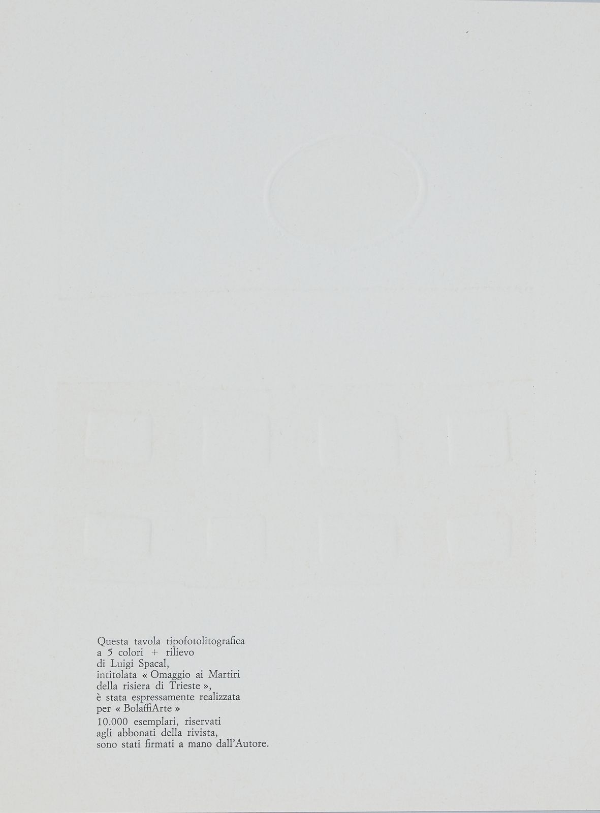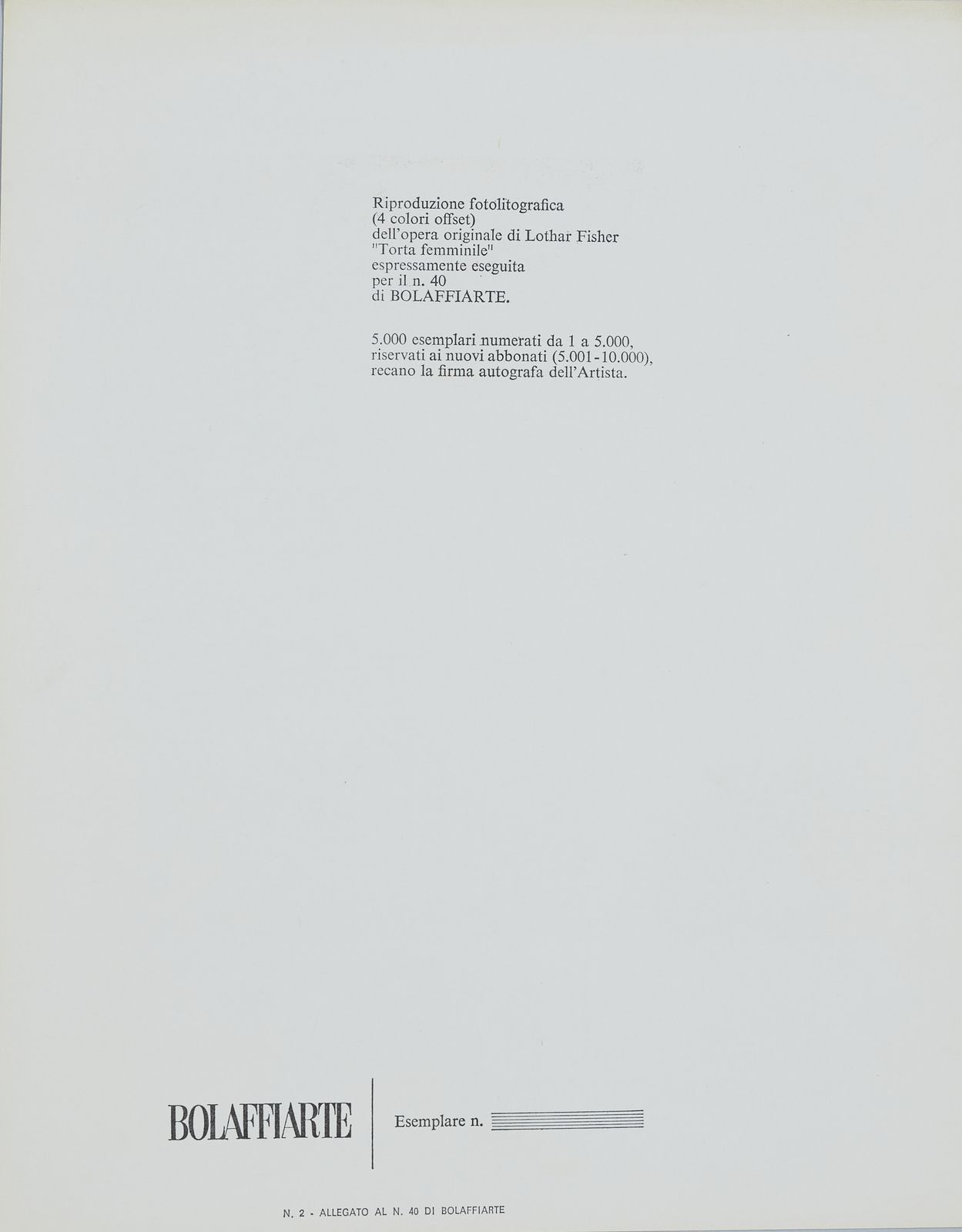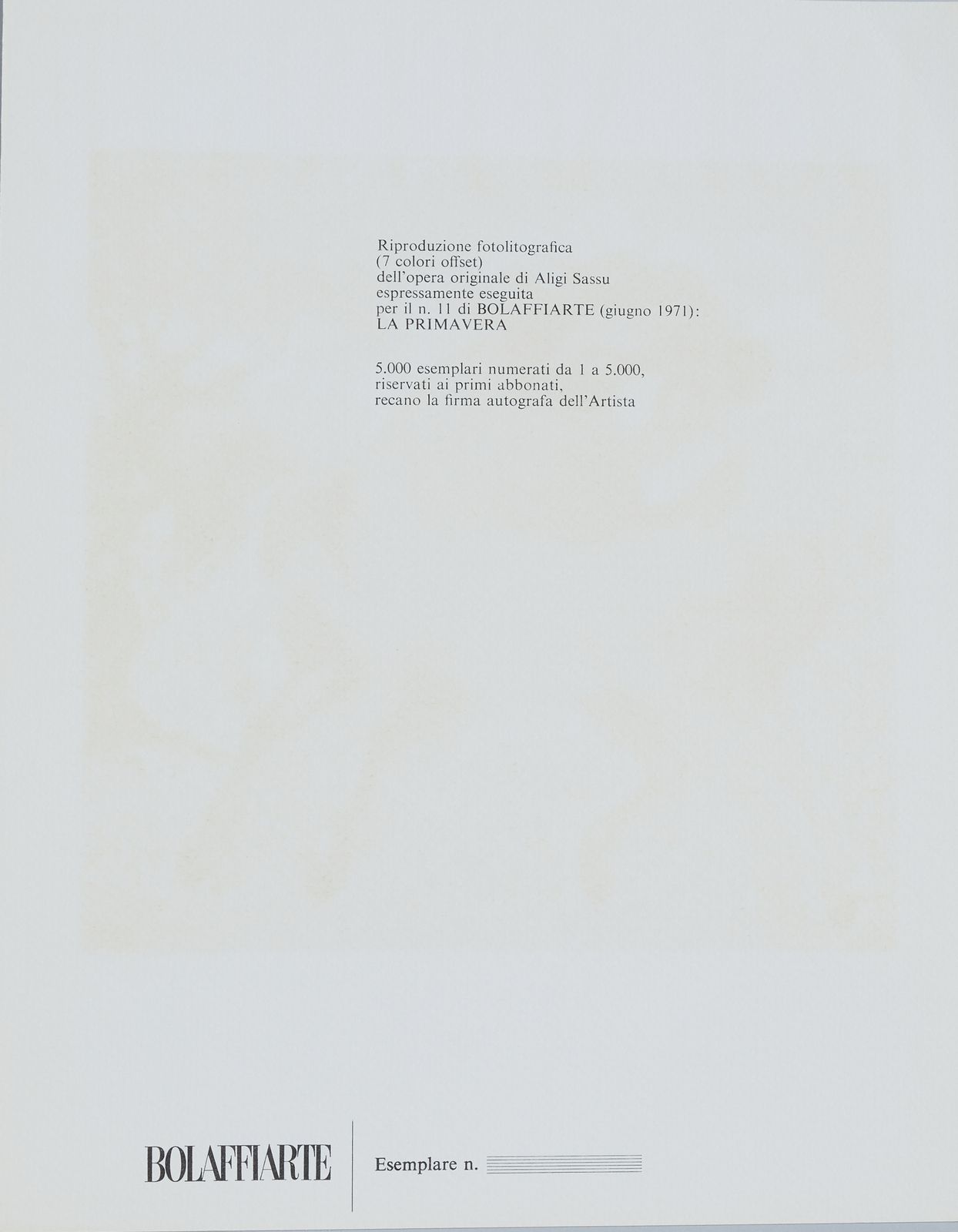 Lotto composto da n.91 riproduzioni fotolitografiche per Bolaffiarte.Per la serie ''L'alfabeto (20): Lucio del Pezzo. A. Mario Ceroli. B. Gianni Dova. D. Andrea Cascella. E. Jean Michel Folon. F. Salvador Dalì. G. Giuseppe Santomaso. H. Fausto Melotti. I. Cesare Peverelli. J.Salvatore Fiume. K. Pietro Consagra. L. Joan Mirò. M. Max Bill. N. Giorgio de Chirico. O. Corrado Cagli. P. Graham Sutherland. S. Giacomo Manzù. T. Wilfredo Lam. W. Pietro Cascella. Y. Calder. Z.Per la serie ''I cinque sensi'' (5): Robert Rauschenberg. Il Tatto. Jim Rosenquist. L'olfatto. Joseph Beuys. L'udito. Ugo Nespolo. La vista. Edward Kienholz. Il senso degli affari (espressamente eseguita come ''sesto senso'').Per la serie '' I sette peccati capitali'' (3): Fernando Botero. Lussuria. Bruno Caruso. Gola. Paul Davis. Accidia. Per la serie ''Lo zodiaco'' (11): Fabrizio Clerici. L'ariete. Mario Radice. Il toro. Renzo Vespignani. I gemelli. Alicia Penalba, Il cancro. Andy Warhol. Il leone. Mimmo Rotella, La vergine: Wolf Vostell. La bilancia. Daniel Spoerri. Lo scorpione. Ivan Rabuzin. Il capricorno. Michelangelo Pistoletto. L'acquario. Eliseo Mattiacci. I pesci.Per la serie ''Le carte da gioco'' (8): Claudio Parmiggiani. La donna. Flavio Costantini. Il re. Vladimir Valickovic. Il Fante (Valet). Achille Perilli. Picche. Concetto Pozzati. Fiori. Rafael Alberti. Cuori. Mauro Reggiani. Quadri. Ben Vautier. The Jocker.Per la serie ''I colori dell'arcobaleno'' (5): Allen Jones. Rosso. Jiri Kolar. Verde. Joe Tilson. Azzurro. Victor Pasmore. Indaco. Leonardo Cremonini. Violetto.Per la serie ''Le sette arti liberali'' (4): Tullio Pericoli. Matematica. Floriano Bodini. Retorica. Piero Guiccione. Geometria. Hubertus Gojowczyk. Grammatica.Le stagioni (4): Aligi Sassu. La Primavera. Massimo Campigli. L'estate. Renato Guttuso. L'autunno. Giuseppe Migneco. L'inverno.Di seguito, non facenti parte di alcuna serie (31): Attilio Forglioli. Isola. Renato Volpini. Astronave dell'amore. Ugo Nespolo. Per gioco una dimora per giocare. Titolo in basso a sinistra a stampa. Pablo Echaurren. Le restanti sono andate perdute. Eugenio Carmi. Segnale immaginario. Germano Olivotto. Foto di una ripresa televisiva di una sostituzione eseguita a Mestre su segnalazione di un abitante della città. Luca Alinari. Poco universo 2. Firma in basso al centro: Giulio Turcato. Composizione segnica. Lothar Fisher. Torta Femminile. Luigi Spacal. Omaggio ai Martiri della risiera di Trieste. Tipofotolitografia + rilievo. Fabrizio Plessi. Rapporto sull'acqua. Pierluigi Lavagnino. Ombra in un cespuglio.Vito. La mela. Sergio Sarri. Schermo d'analisi e attrezzo. due copie del collage originale di Aldo Mondino per Bolaffiarte. Ibrahim Kodra. Suonatori. Valeriano Trubbiani. Scena Venatoria. Concetto Pozzati. Come misurare le rose in montagna.Vladimir Velickovic. Animals in motion. Dog n. 9. Henry Moore. Senza titolo. Valerio Adami. Senza titolo. Arnaldo Pomodoro. Senza titolo. Emilio Scanavino, Senza titolo. Ennio Morlotti. Senza titolo. Luigi Veronesi. Senza titolo. Emilio Vedova. Studio per plurimo. Franco Gentilini. Senza titolo. Piero Dorazio. Senza titolo. Emilio Scanavino. Senza titolo. Enrico Baj. Senza titolo. n.f./5000.