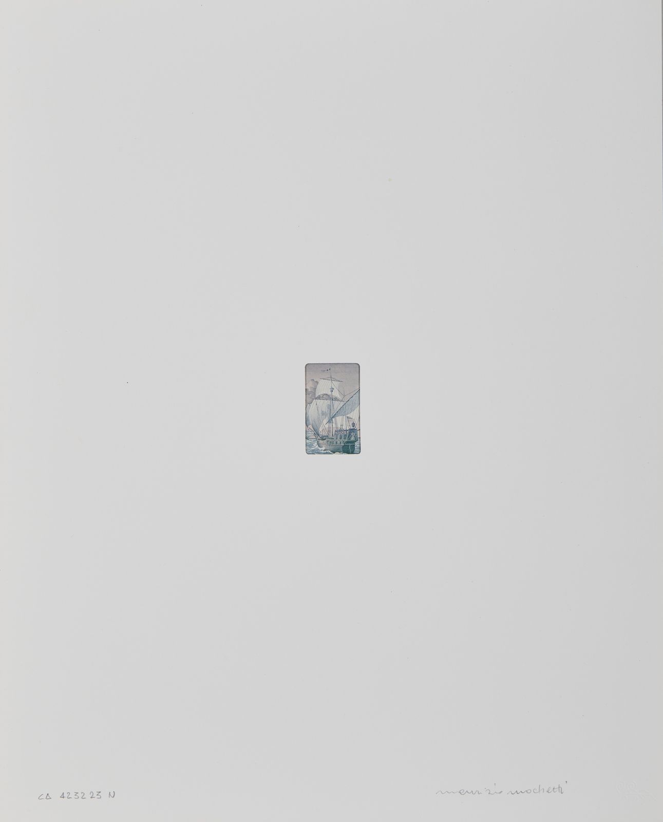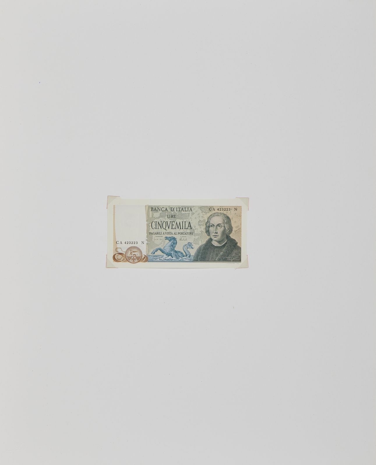 Banconota applicata su cartoncino con il numero di serie della banconota che corrisponde alla numerazione. Sul fronte compare la caravella della banconota applicata sul retro mentre un foglio rimovibile con una X in nastro adesivo cartaceo chiude l'opera sul retro.Stampa-multiplo CA 423223 N, firma a matita e timbro a secco, in basso a destra.Dimensioni banconota: 18,5 x 14,96