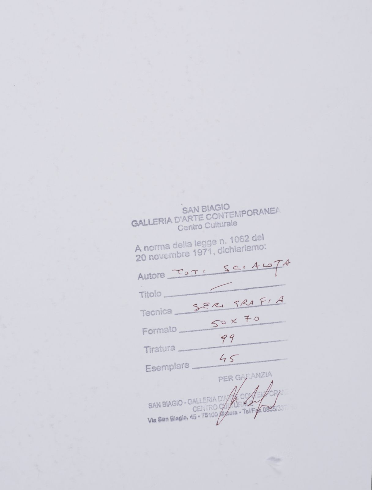 firma, data, esemplare 45 / 99.sul retro: timbro San Biagio Galleria d'arte contemporanea, Matera.PROVENIENZA:San Biagio Galleria d'arte contemporanea, Matera.