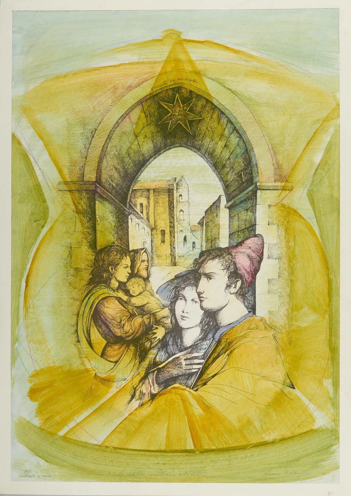 F.L (colorata a mano). Tiratura, firma e titolo in basso a matita. Lievi difetti.