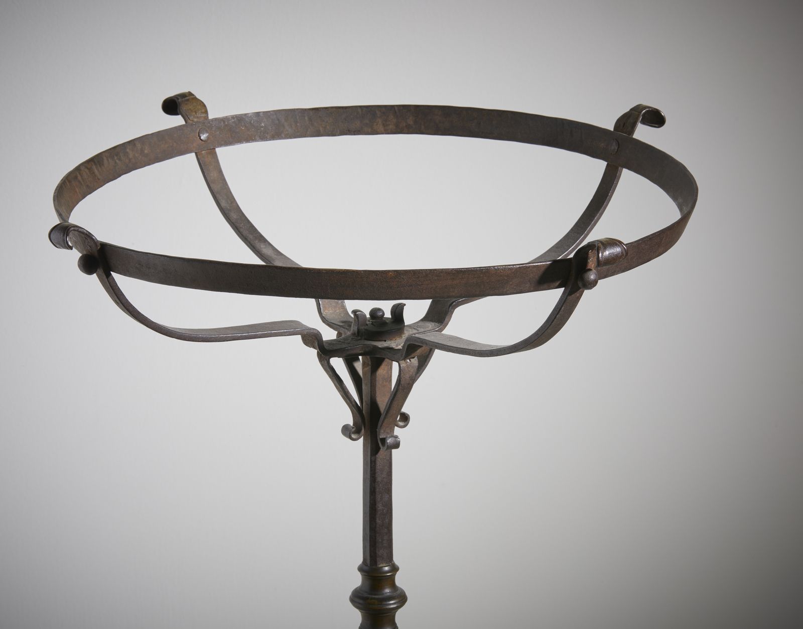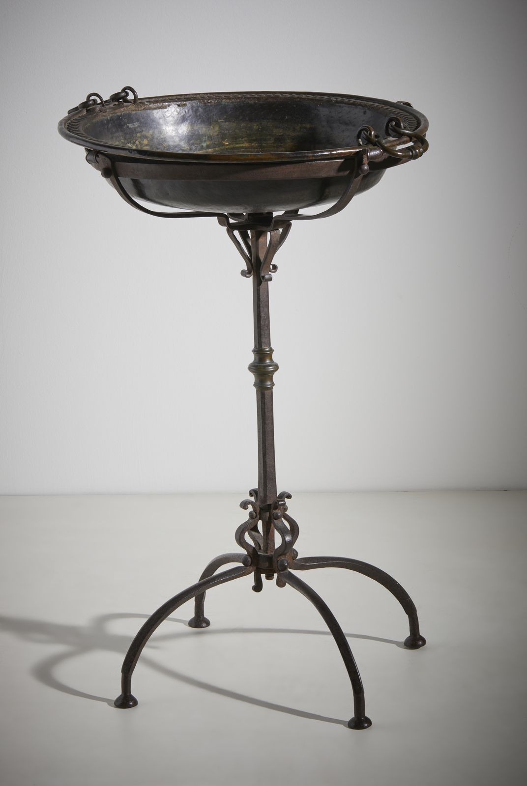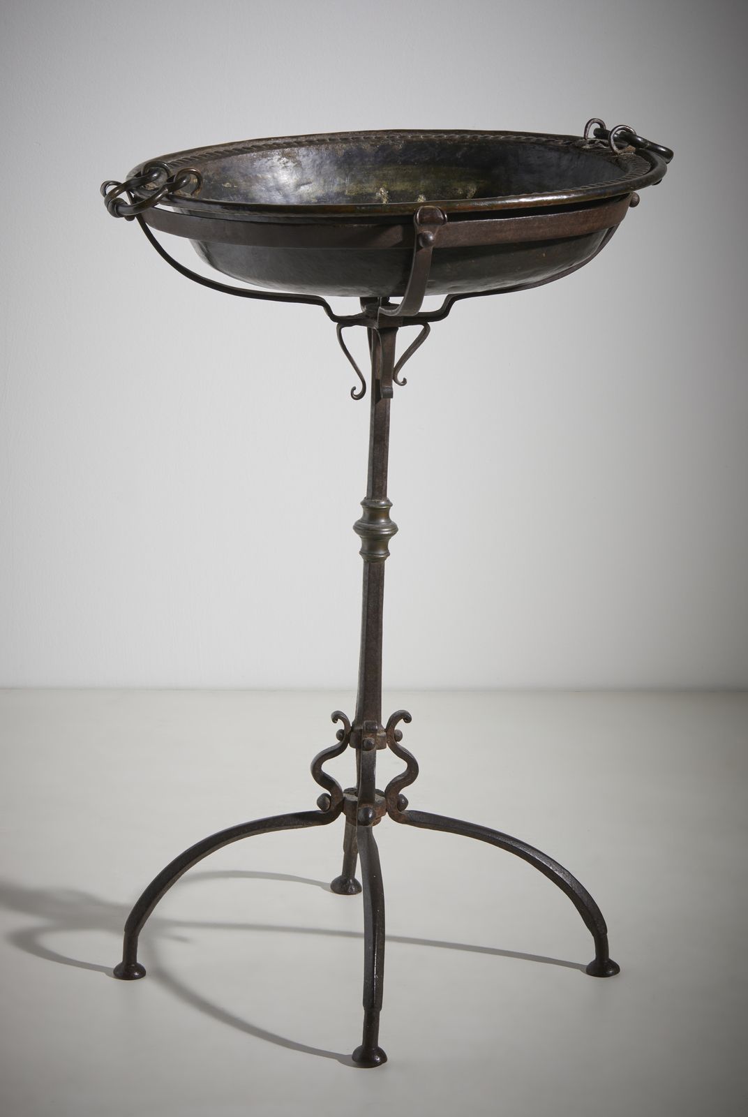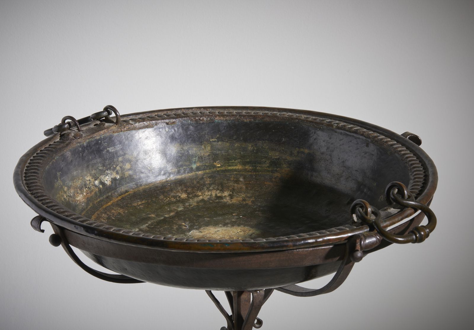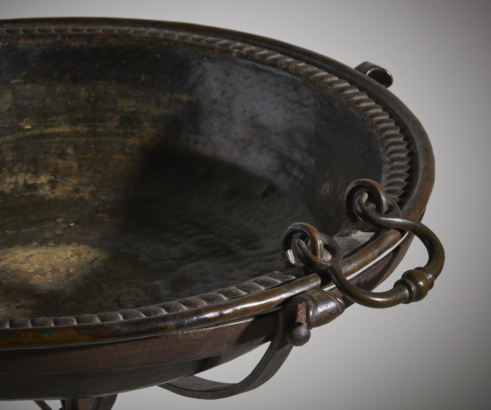 Bacile in rame sbalzato, biansato e baccellato lungo il bordo su base in ferro b [..]