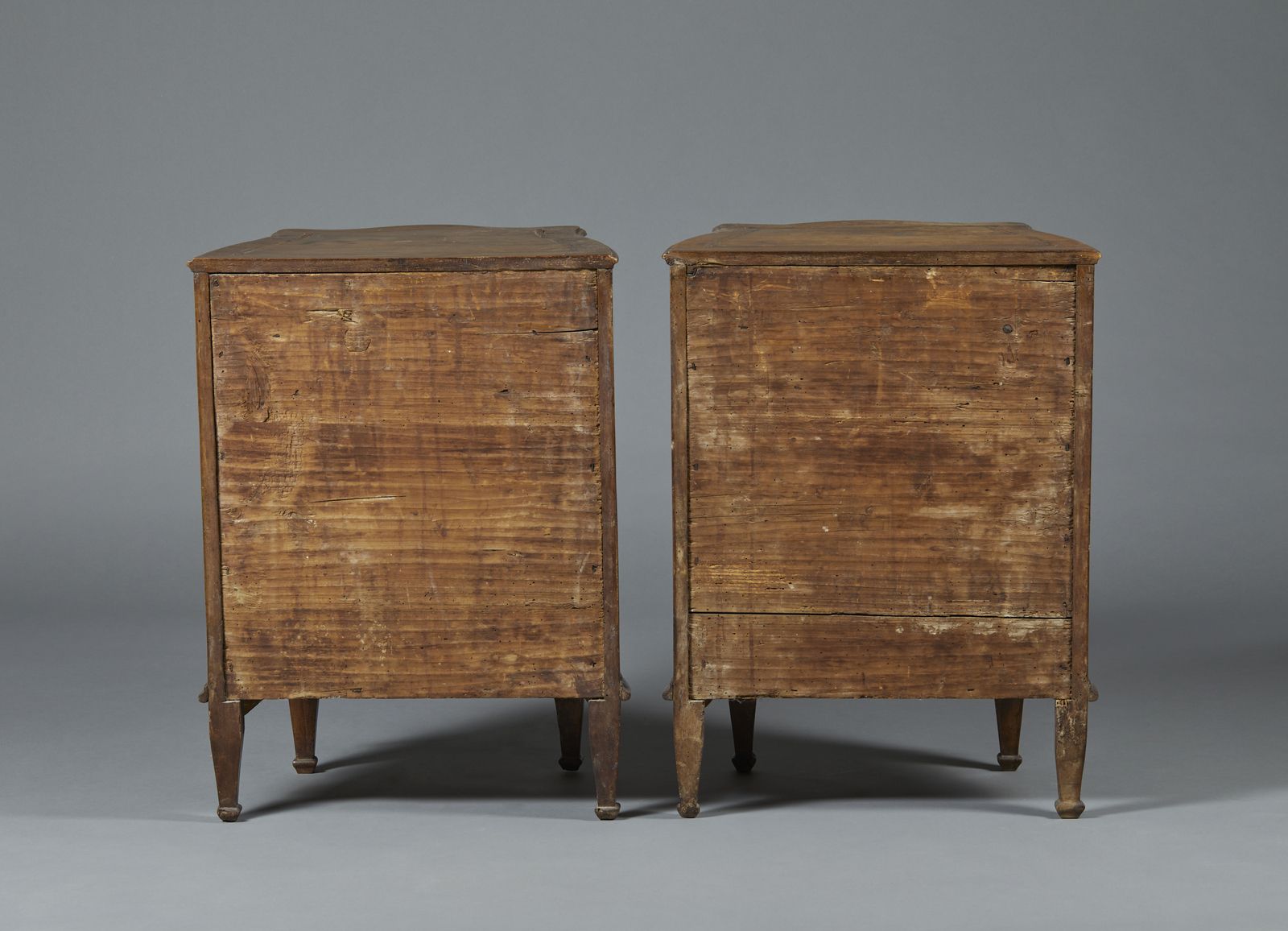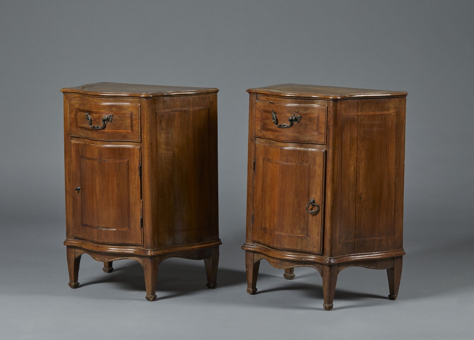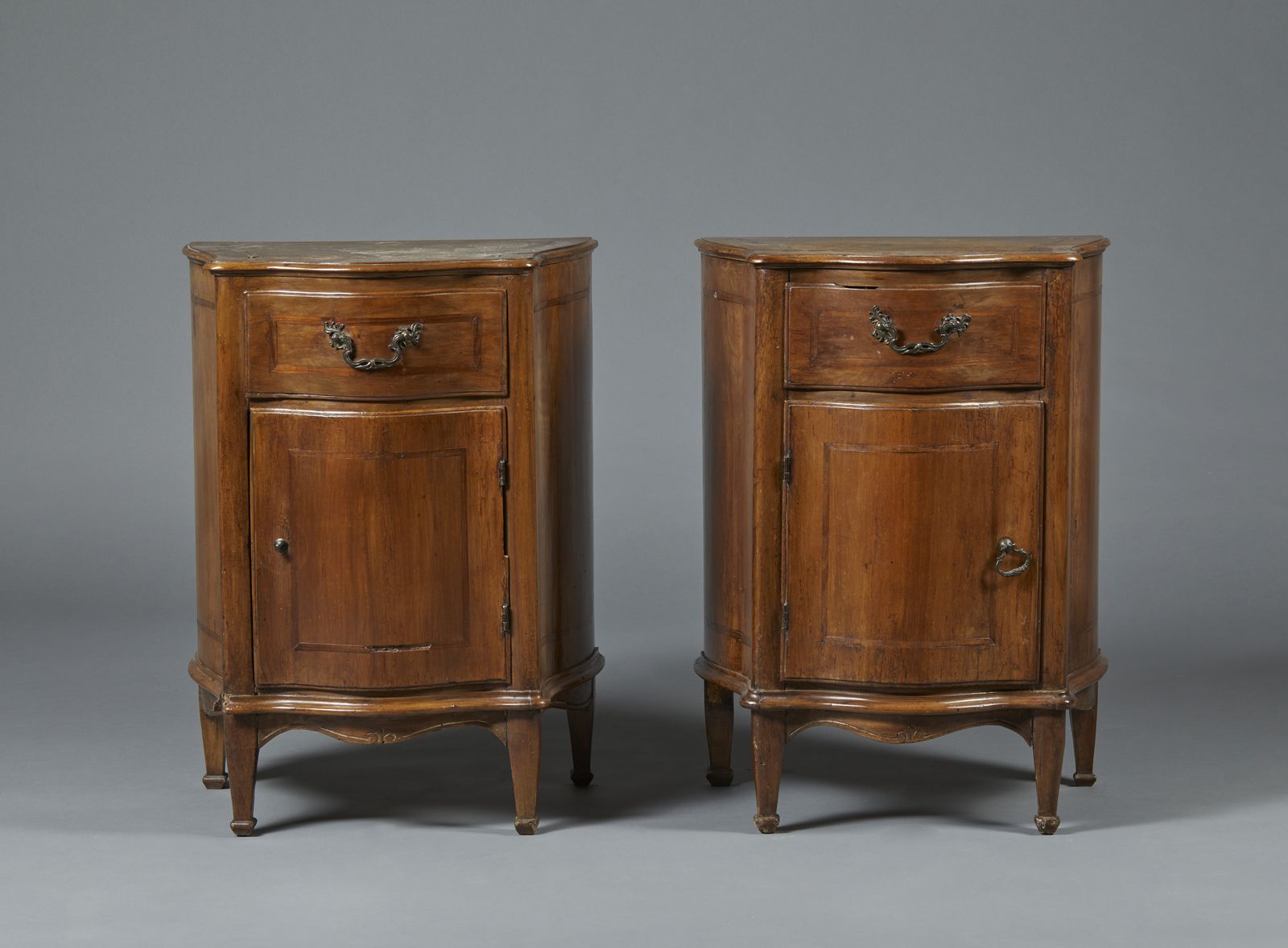 Coppia di comodini lastronati in noce, fronte e fianchi mossi, anta e cassetto con [..]
