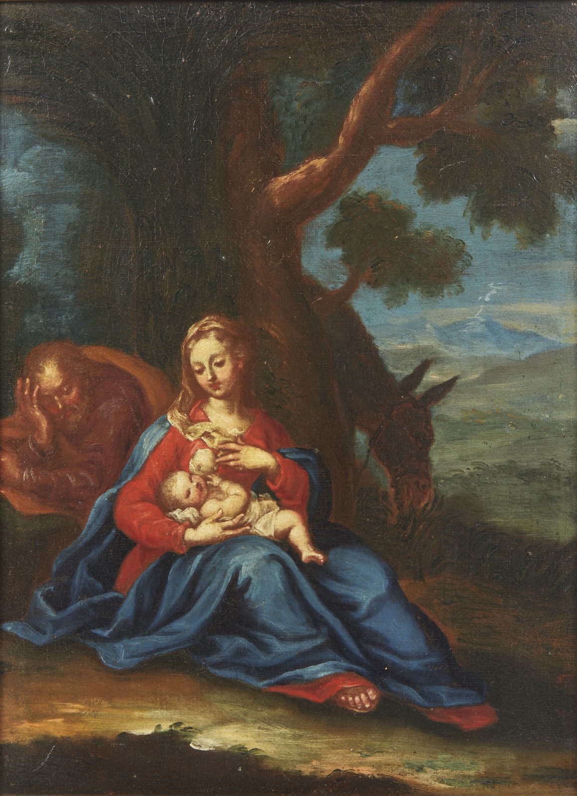 Coppia di dipinti raffiguranti fuga in Egitto riposo durante la fuga in Egitto