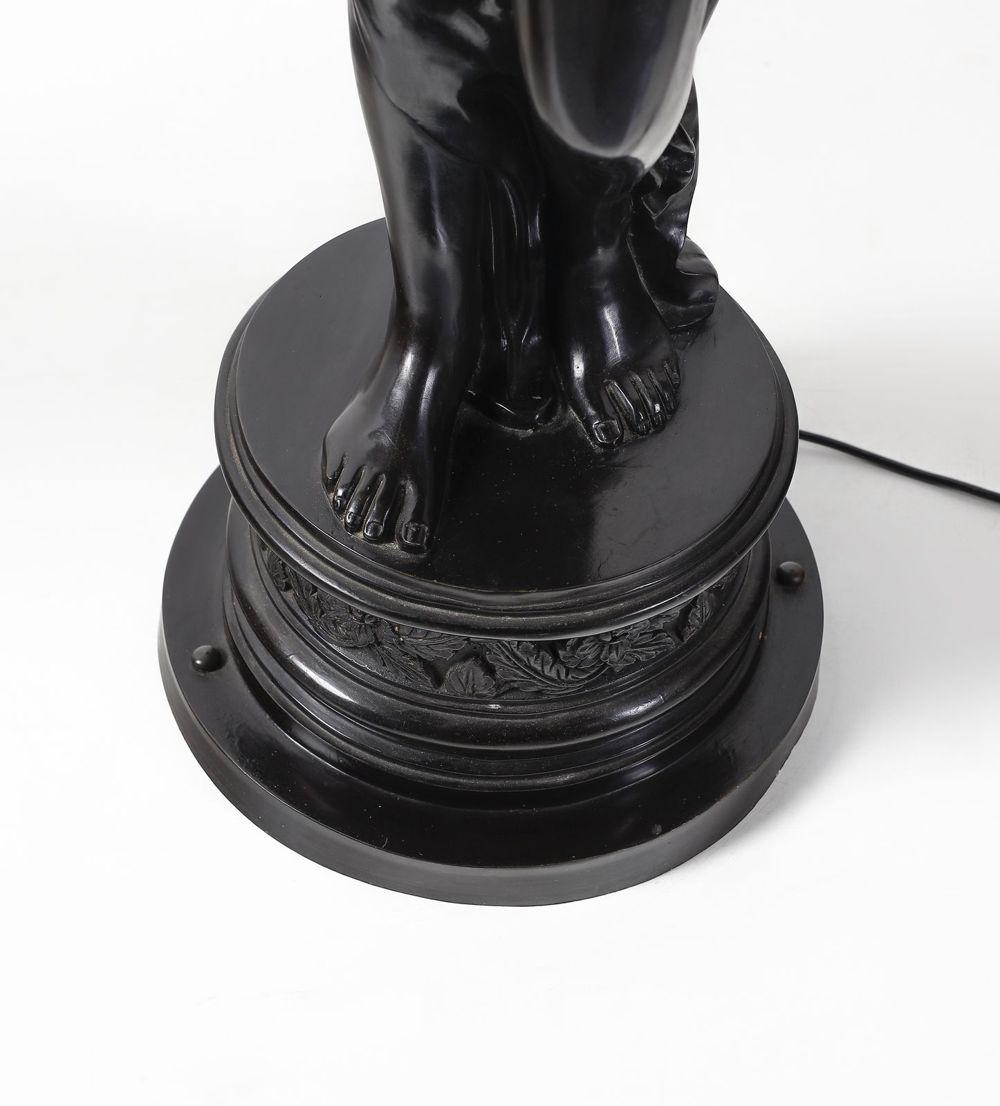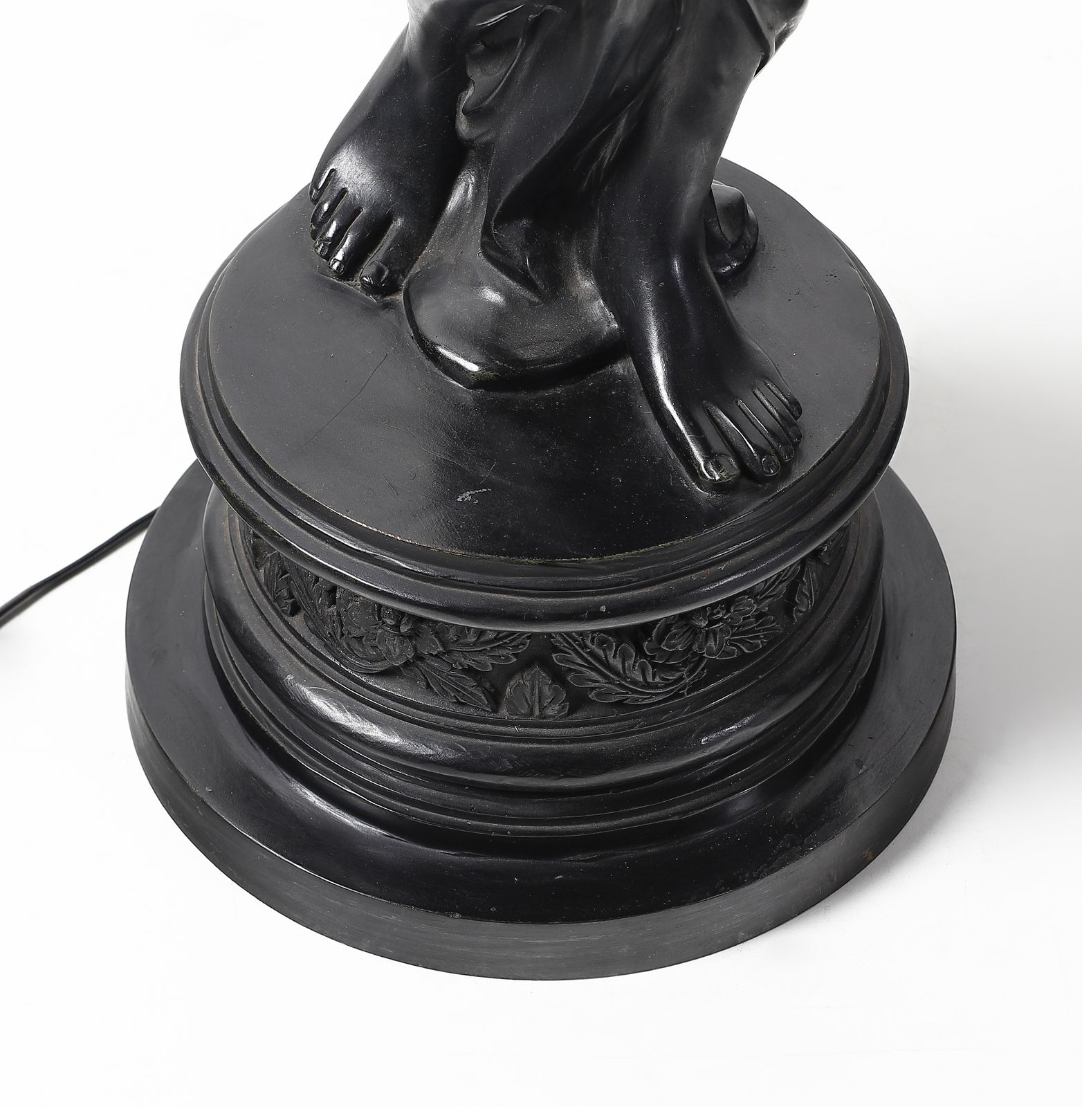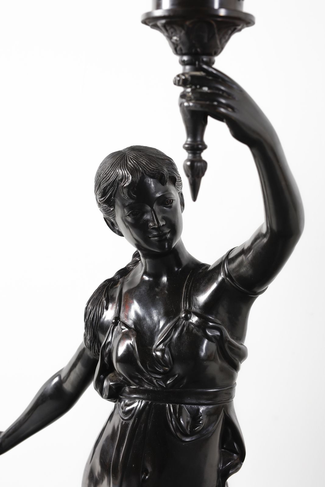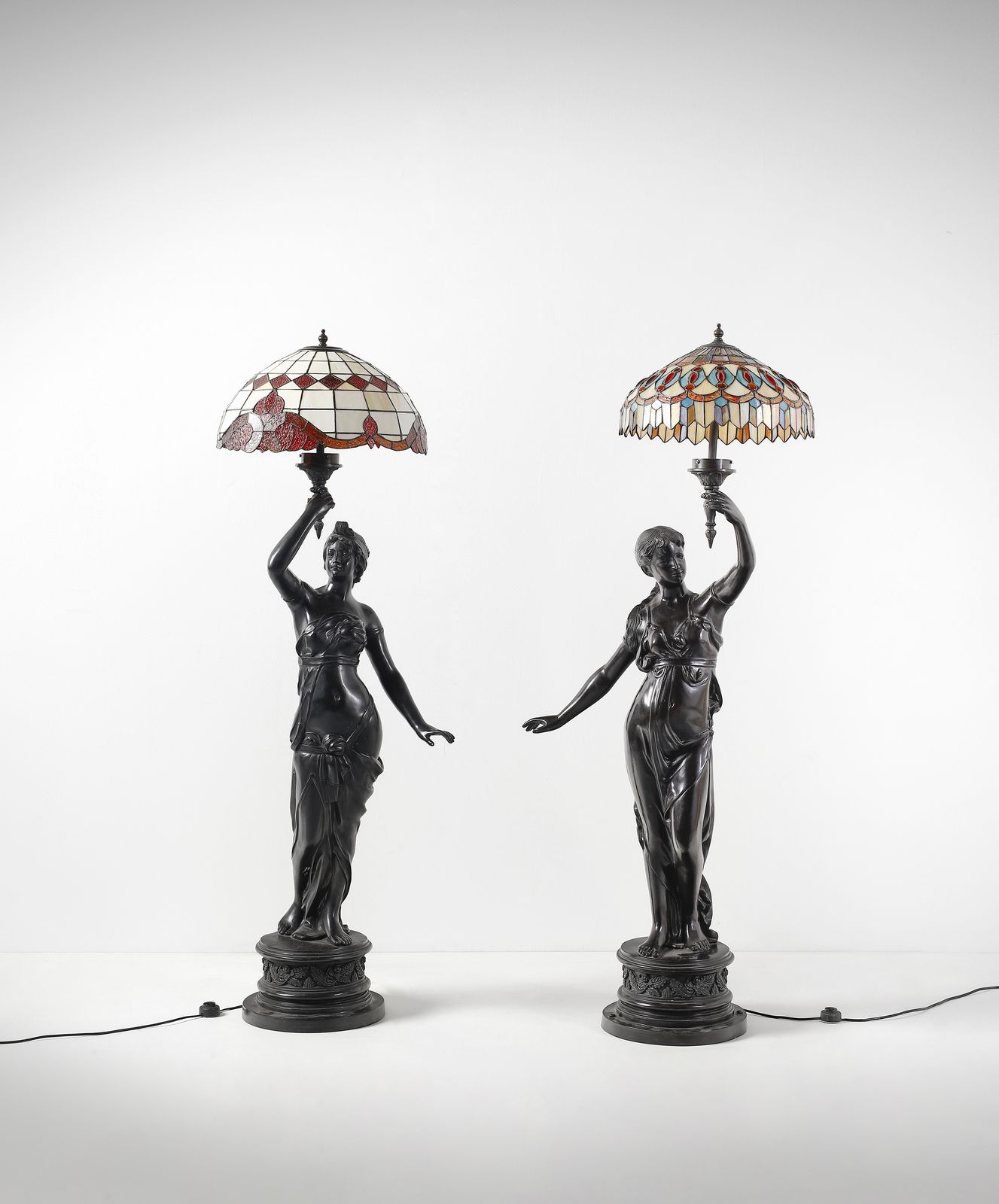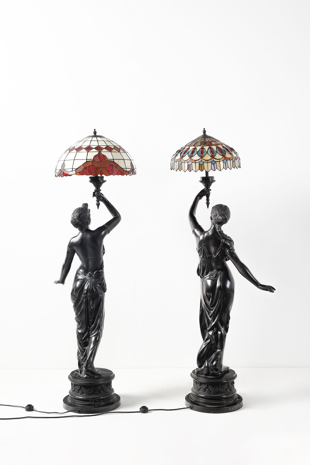 Coppia di grandi figure femminili portalampada in metallo patinato, cappello del [..]