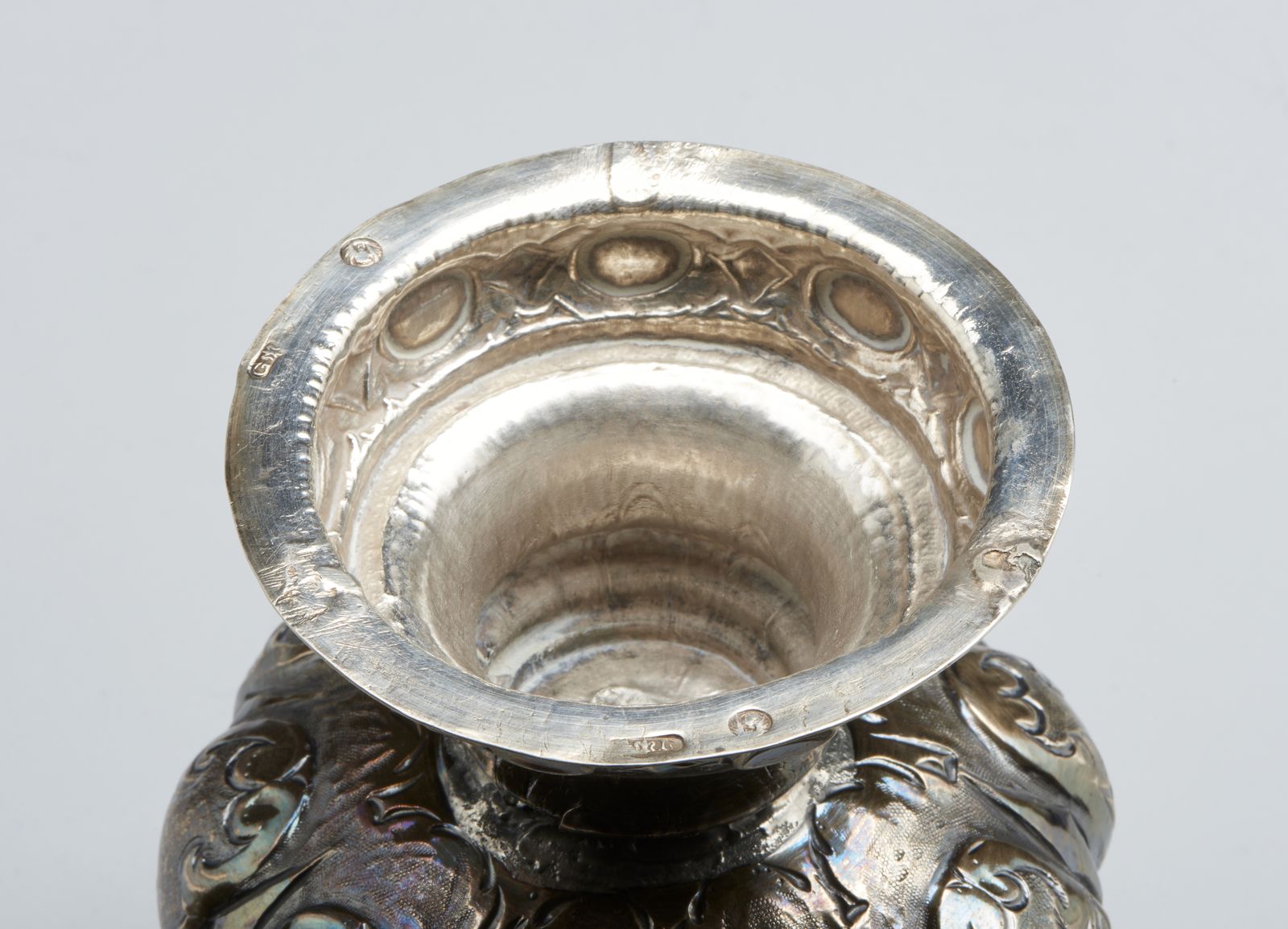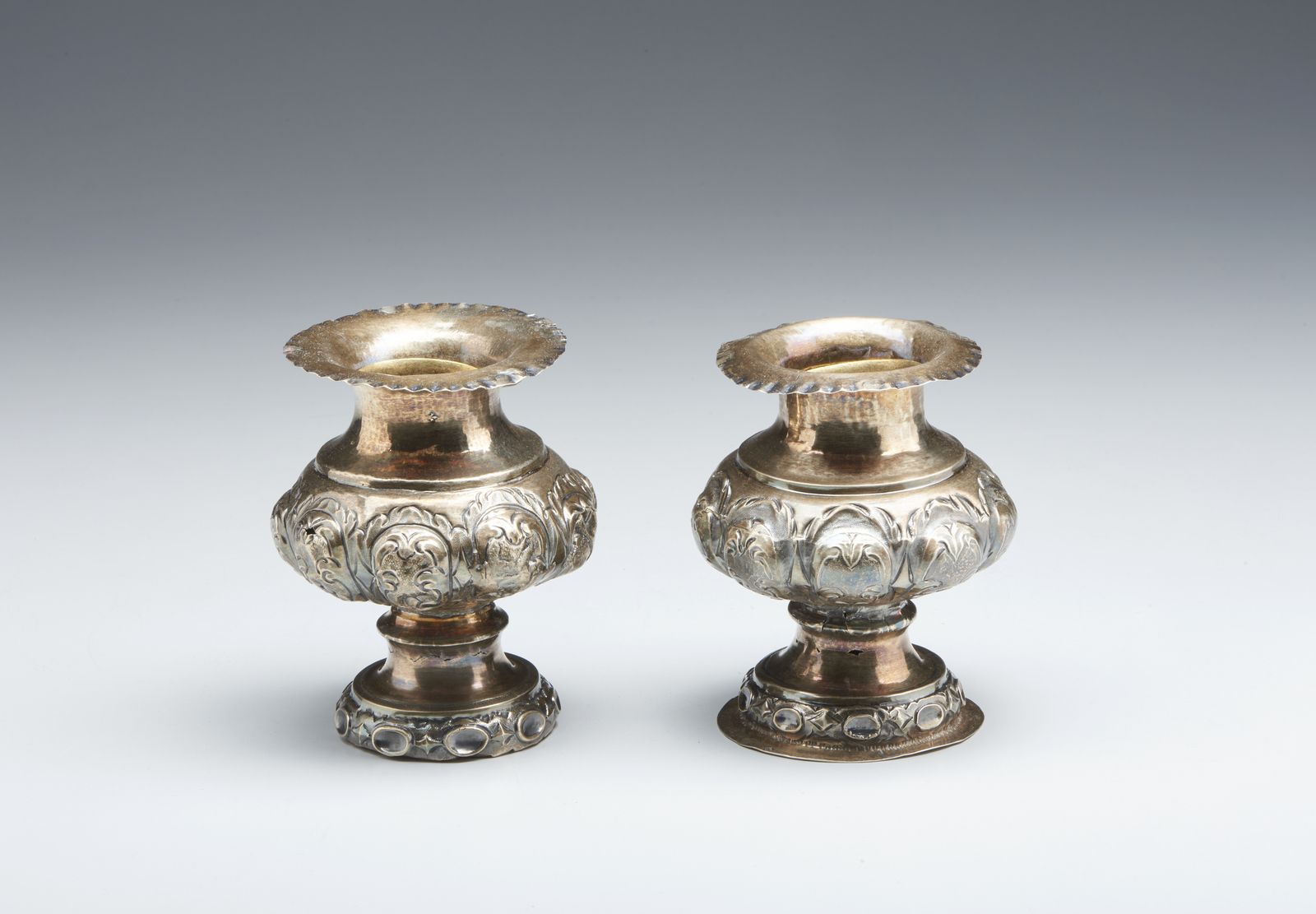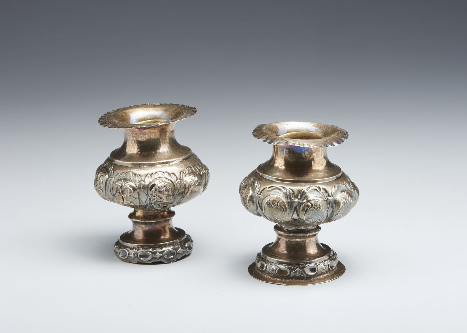 Coppia di piccoli vasi porta palme in argento sbalzato