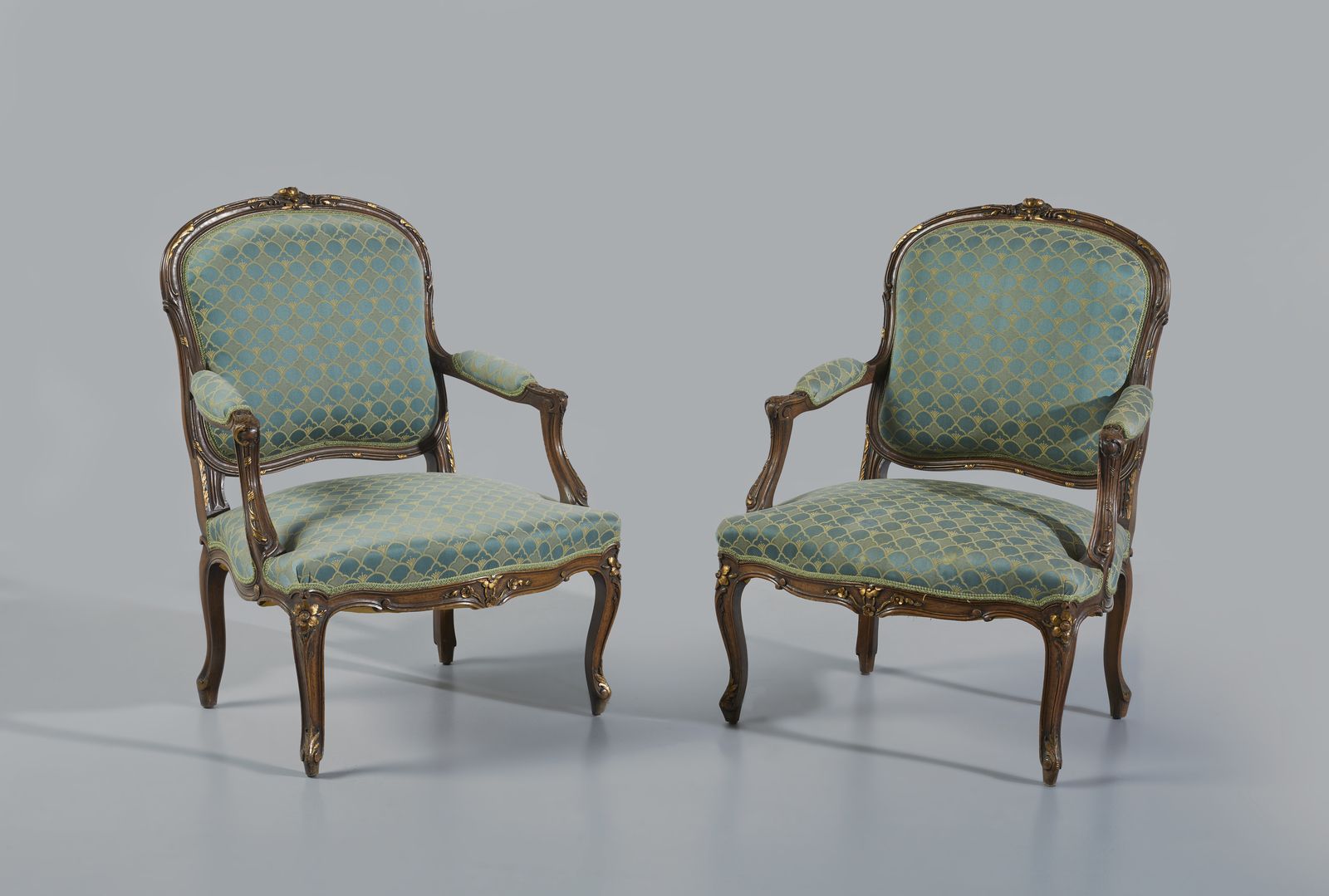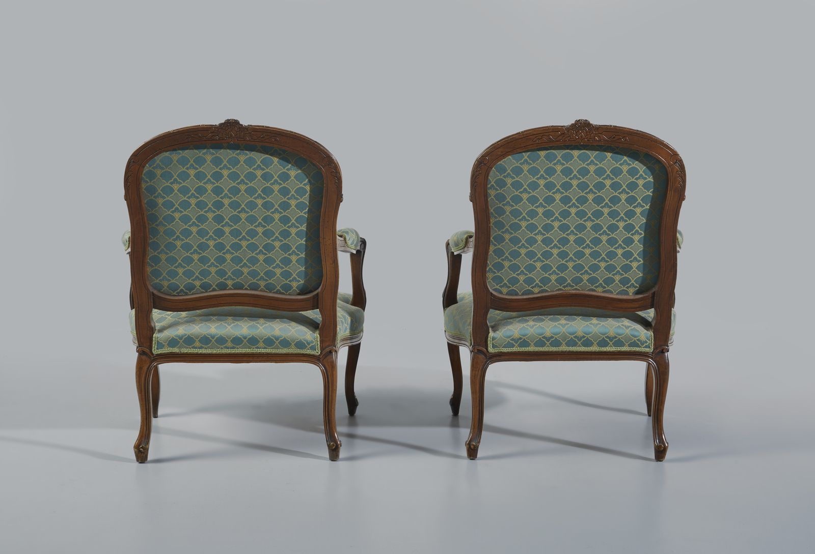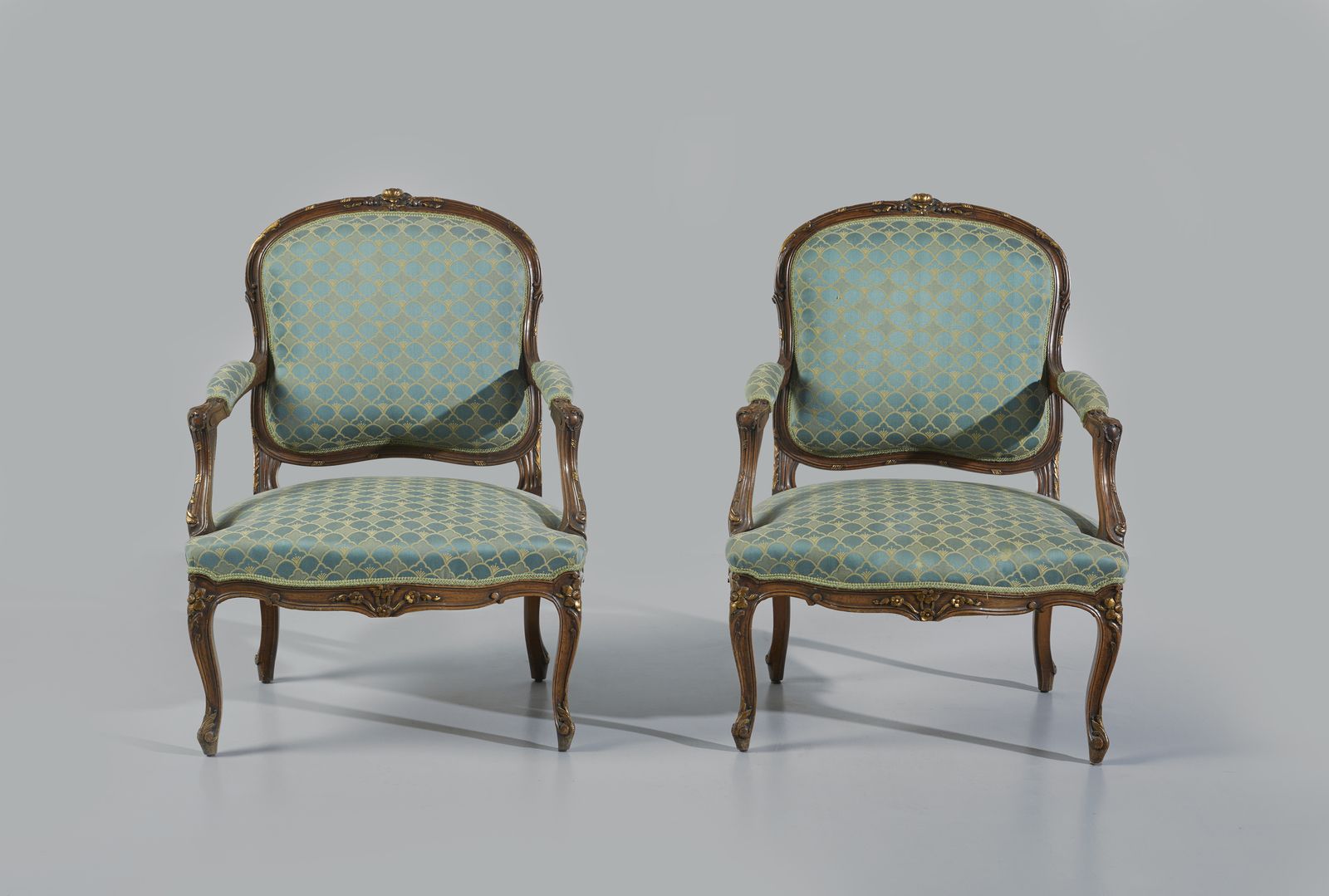 Coppia di poltrone in legno intagliato in stile Luigi XV, schienale e seduta imbottiti, [..]