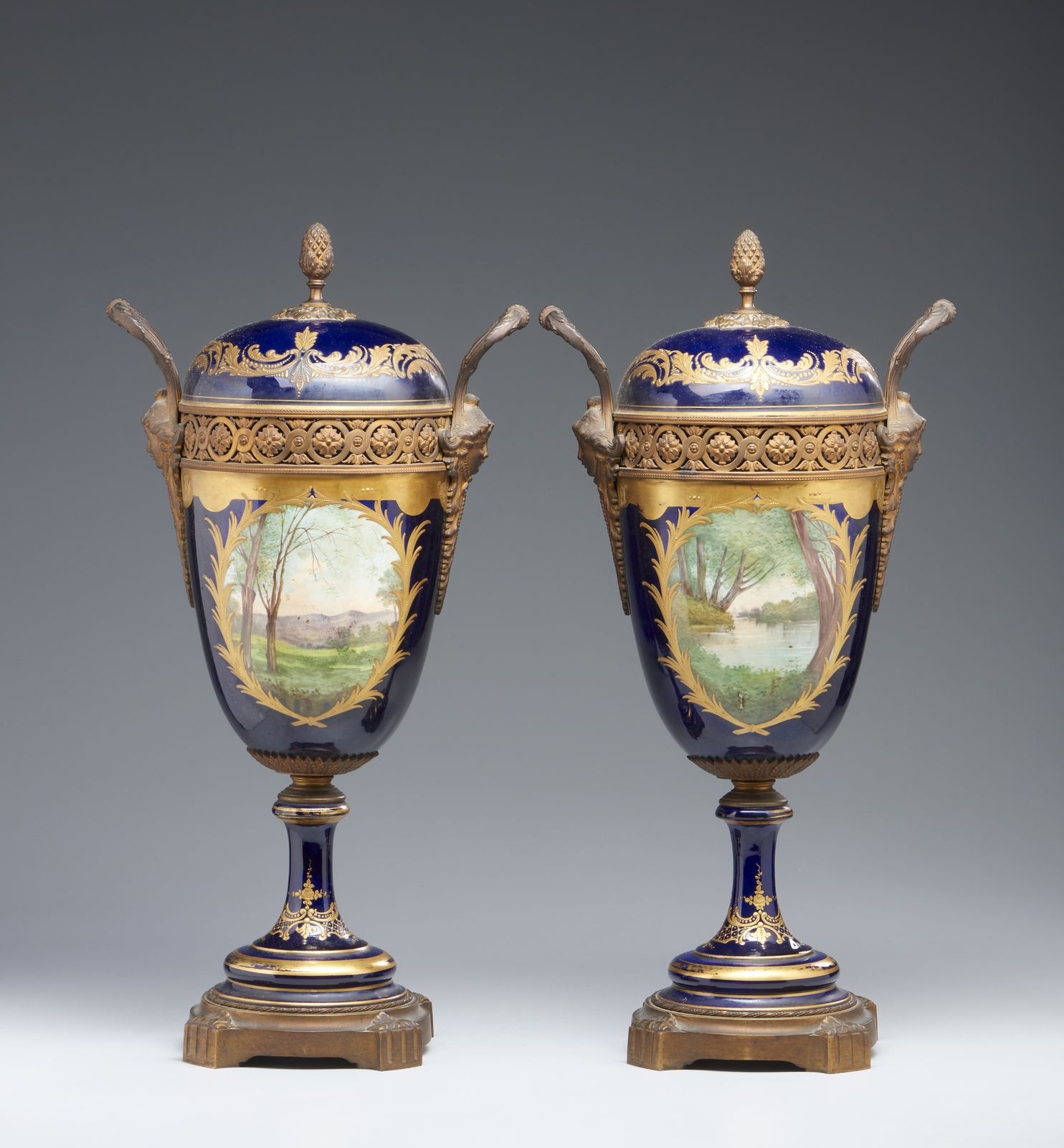 Coppia di vasi in porcellana blu con decorazioni dorate, applicazioni e basi in [..]
