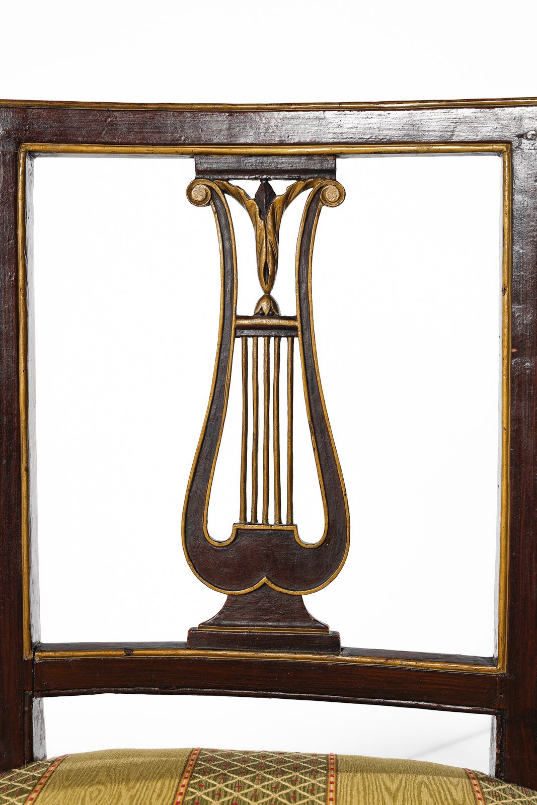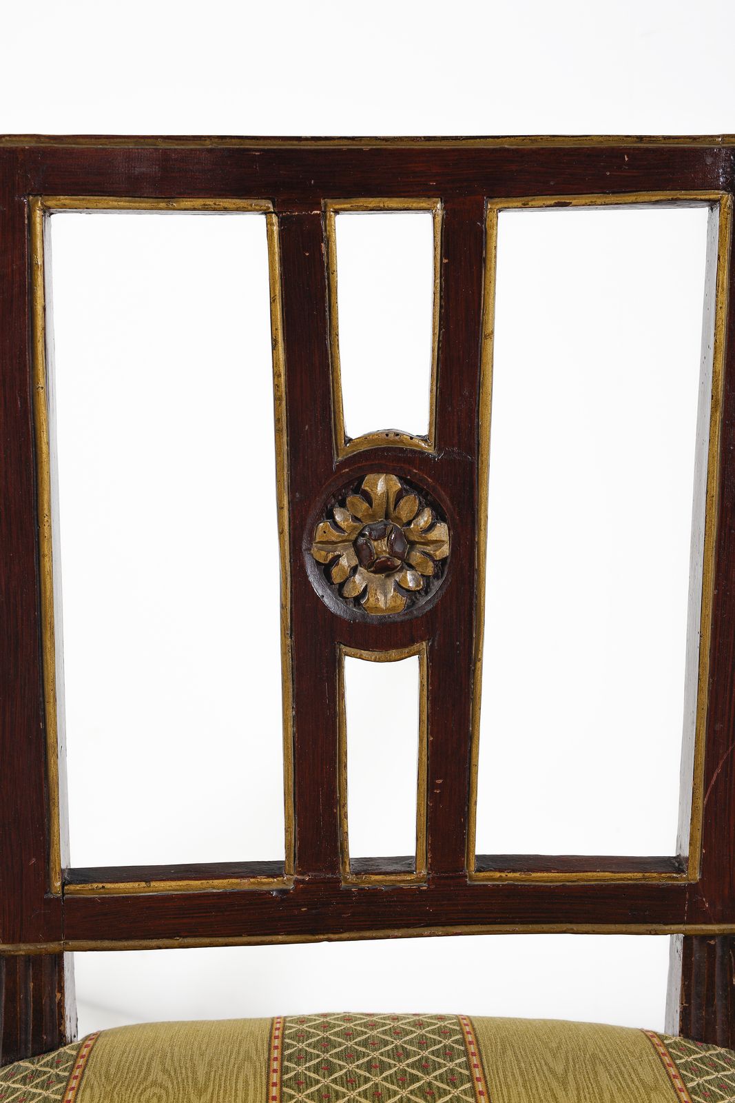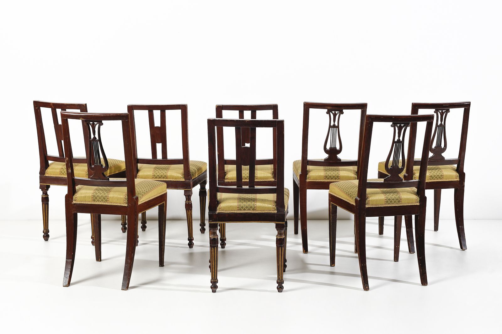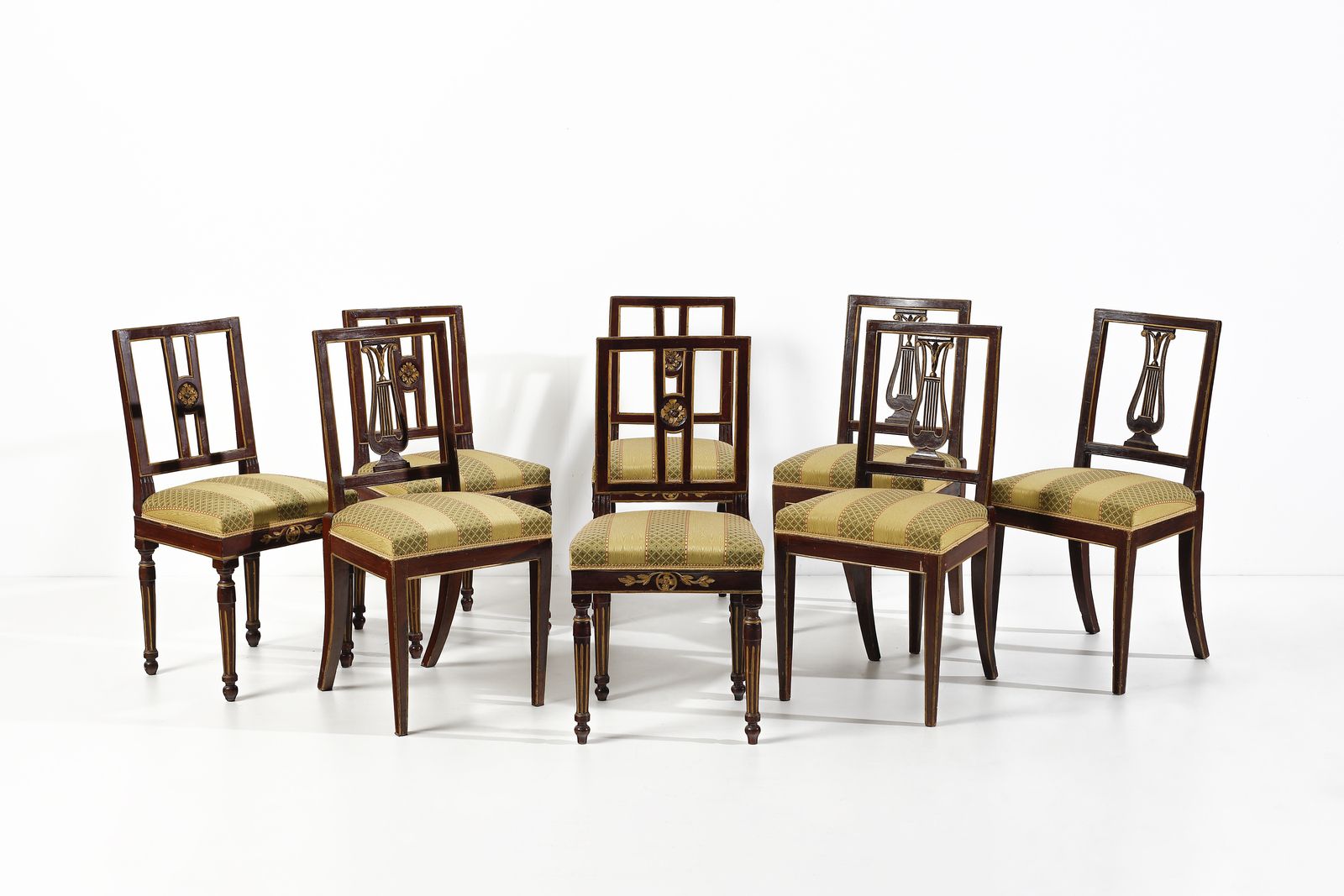 Due gruppi di quattro sedie ciascuno, in legno intagliato e parzialmente dorato, [..]