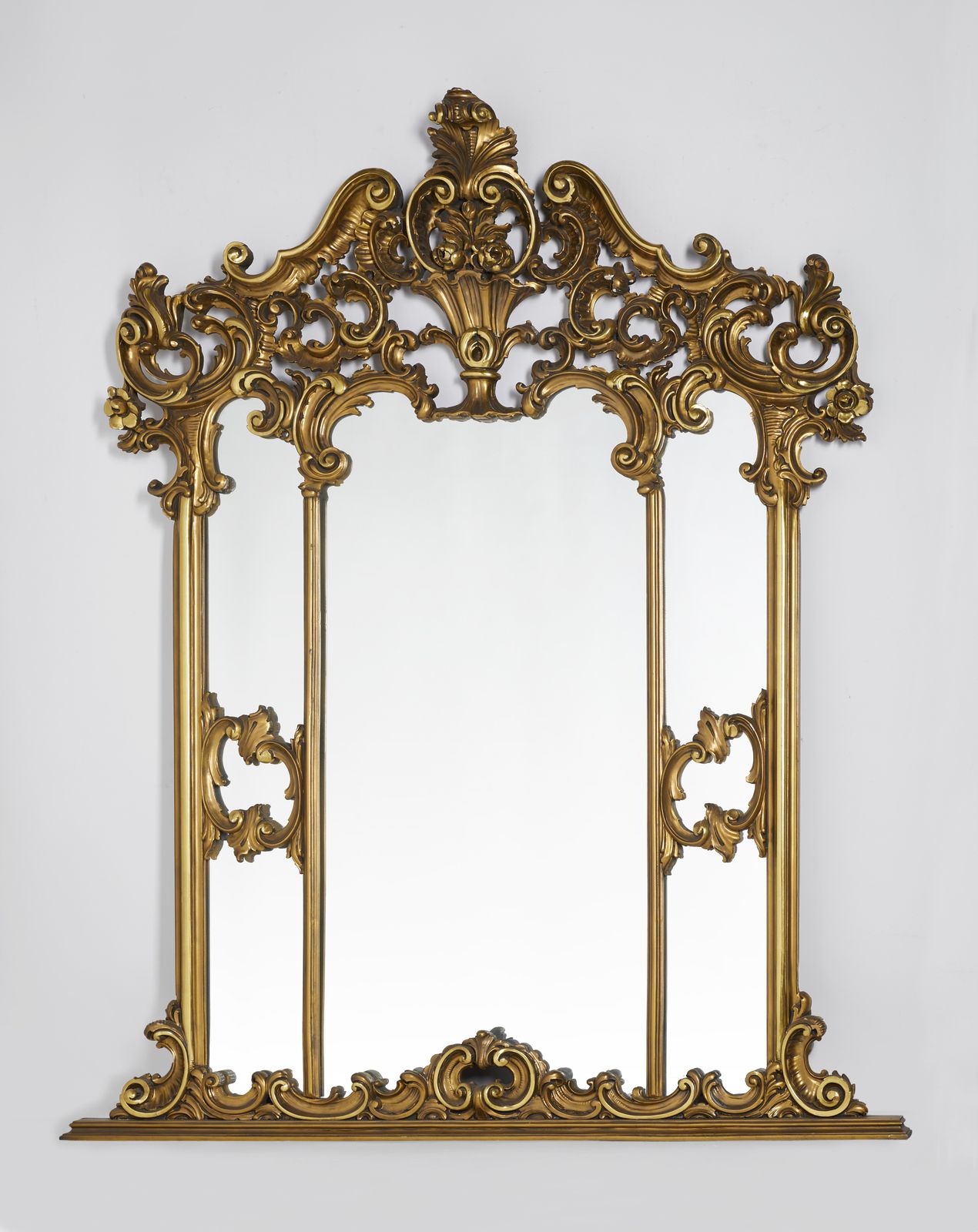 Grande specchiera in legno intagliato e dorato, con cimasa decorata a motivi fit [..]