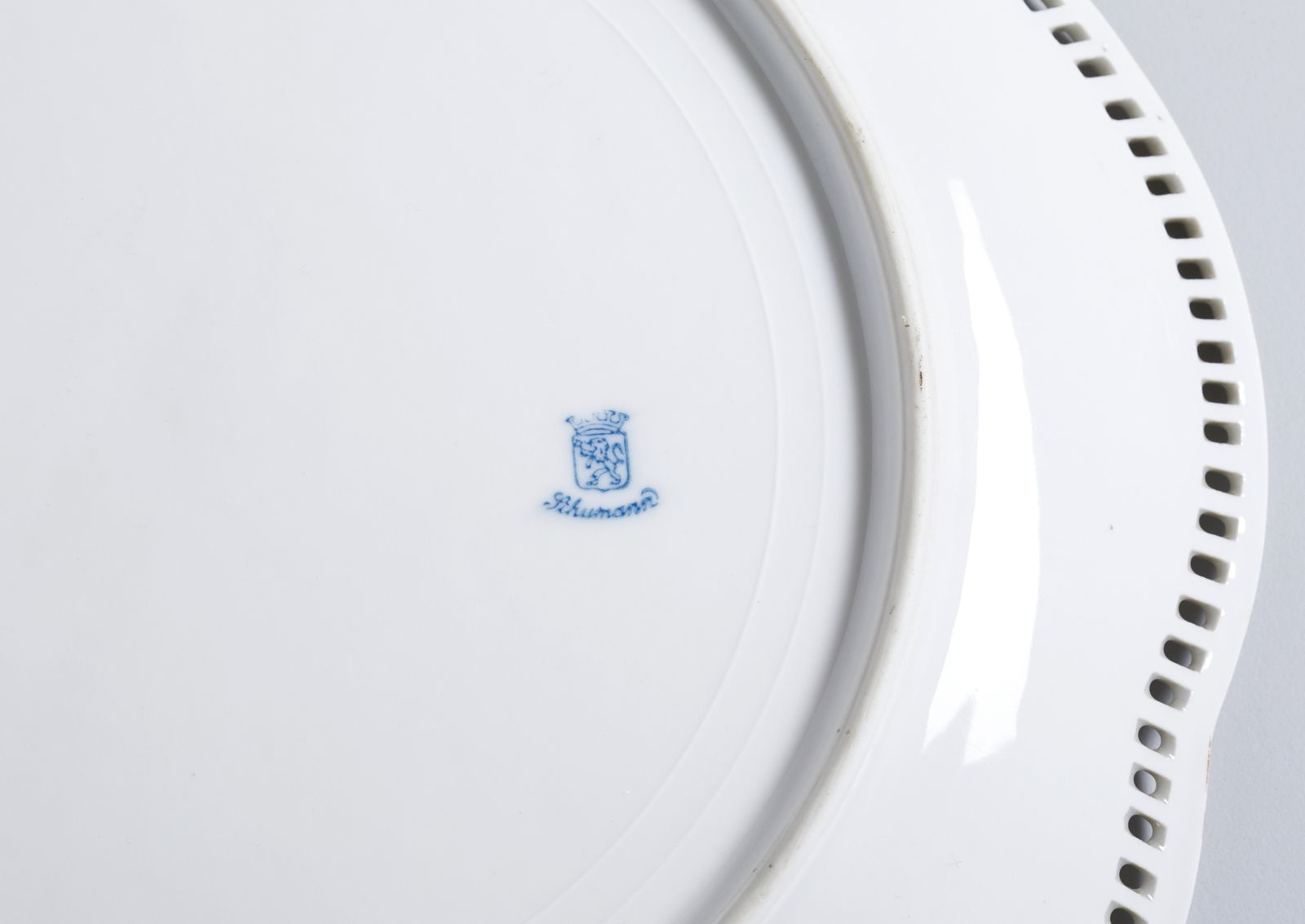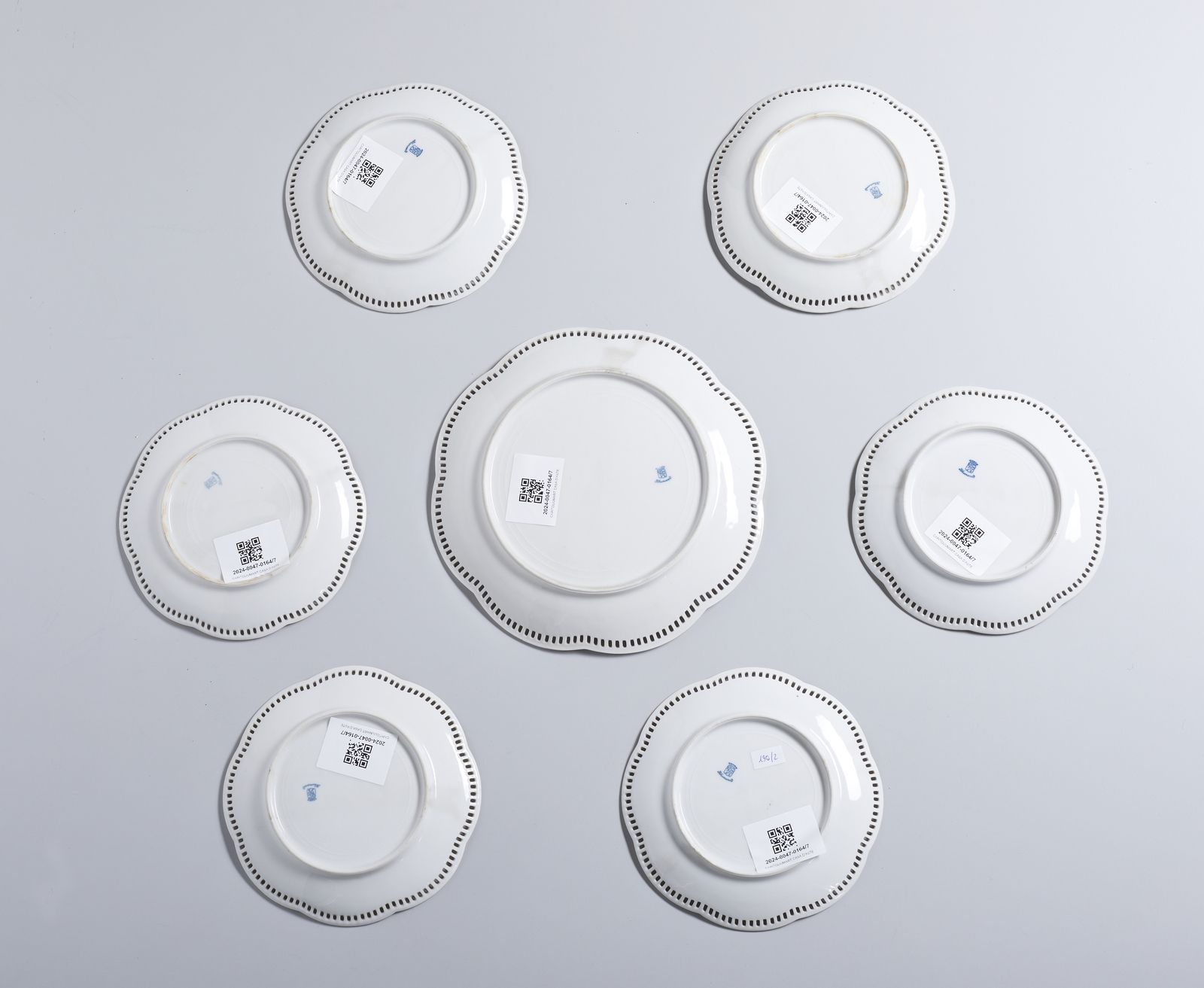 Gruppo di sette piatti in porcellana a bordo mistilineo, centrati da natura morta [..]