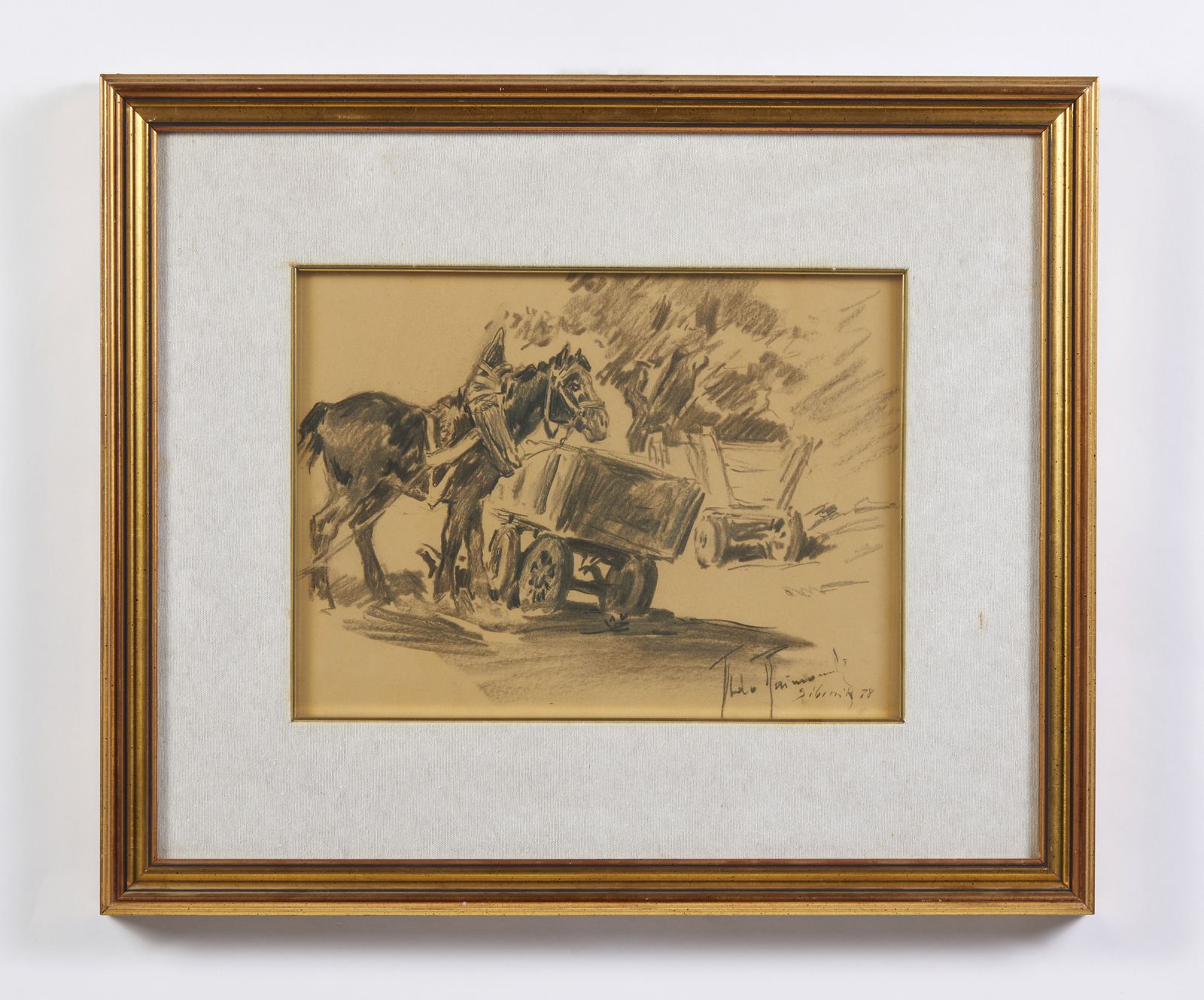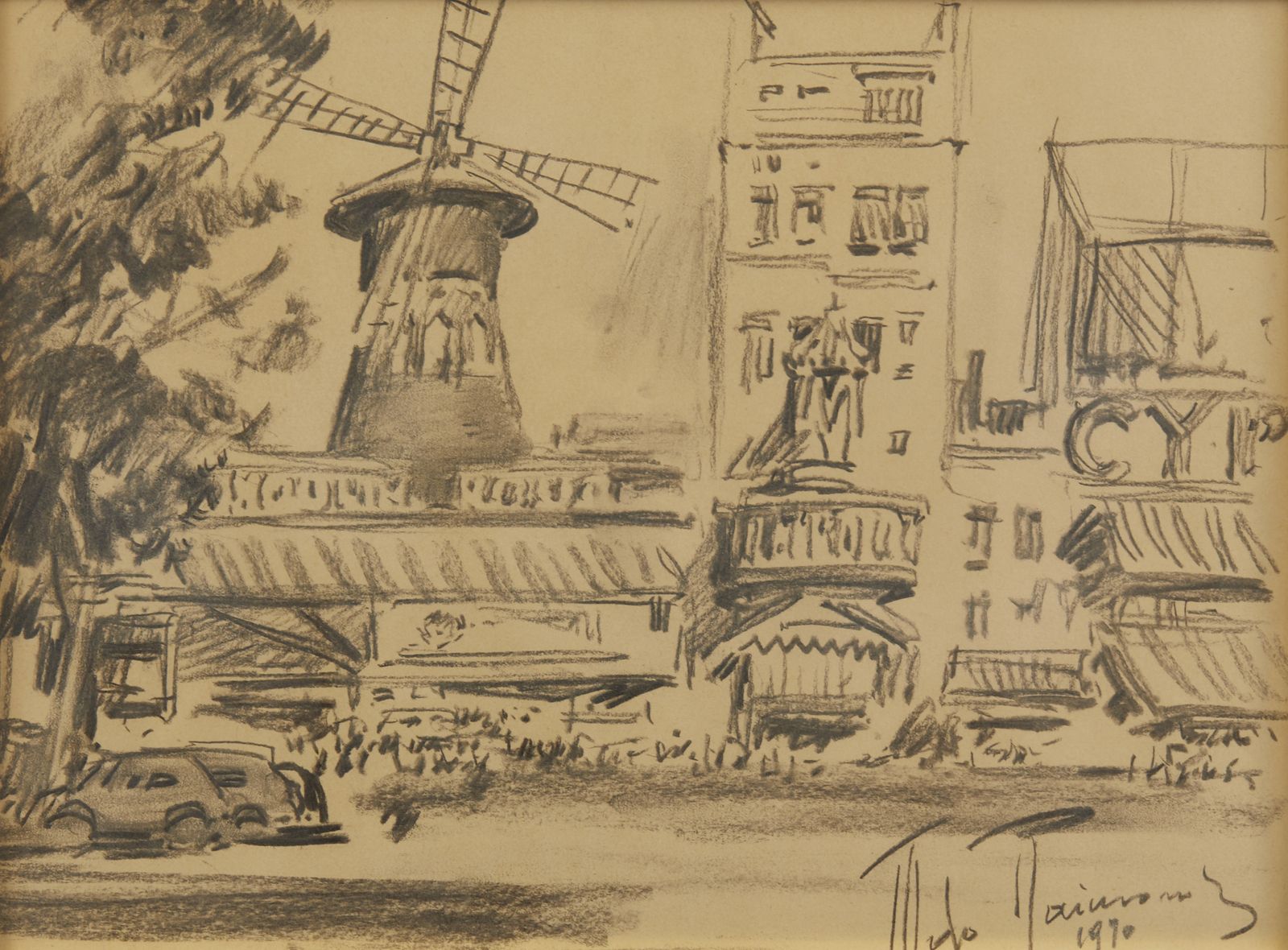 Gruppo di tre disegni raffiguranti veduta del Moulin Rouge, paesaggio con cavallo [..]