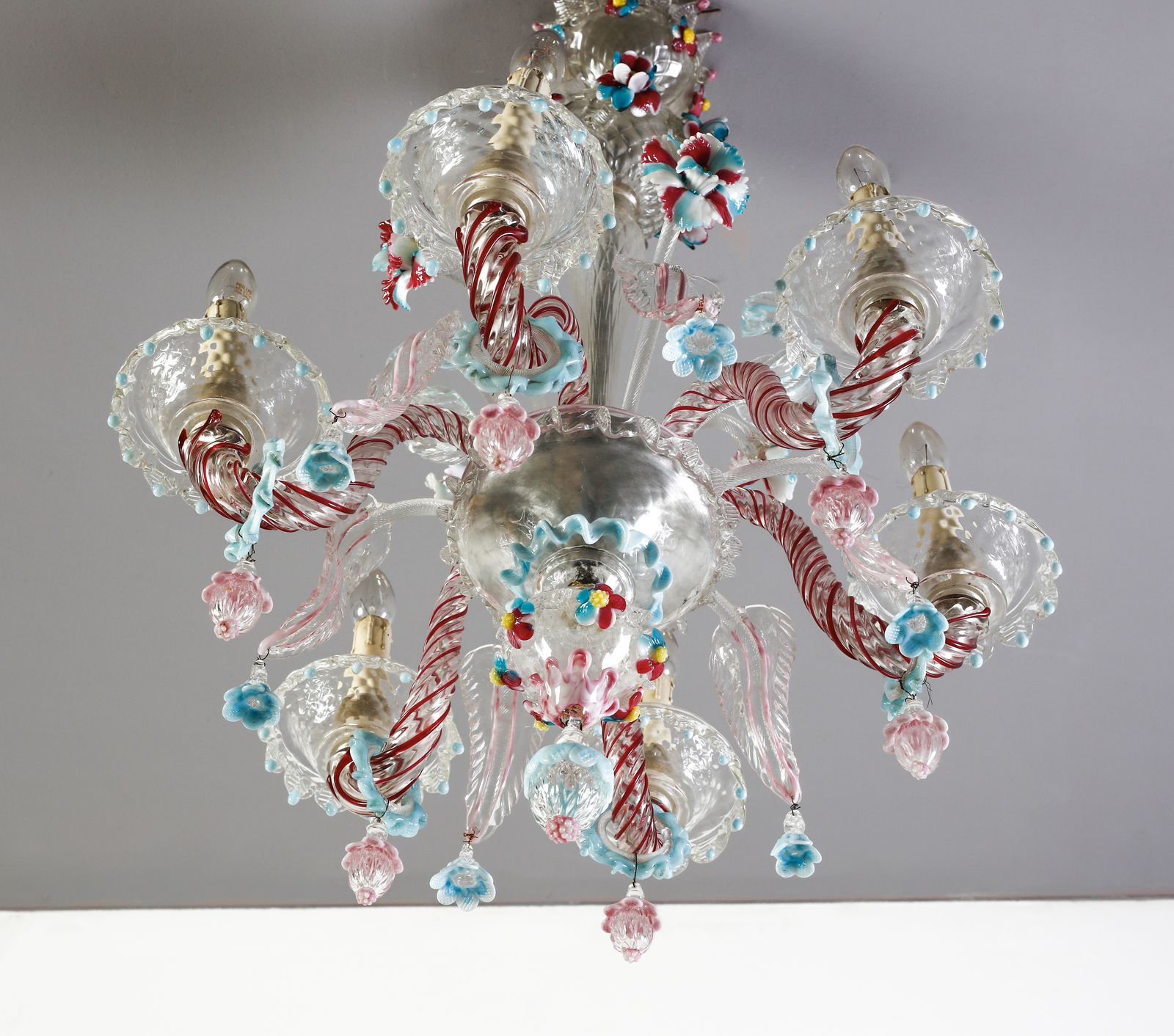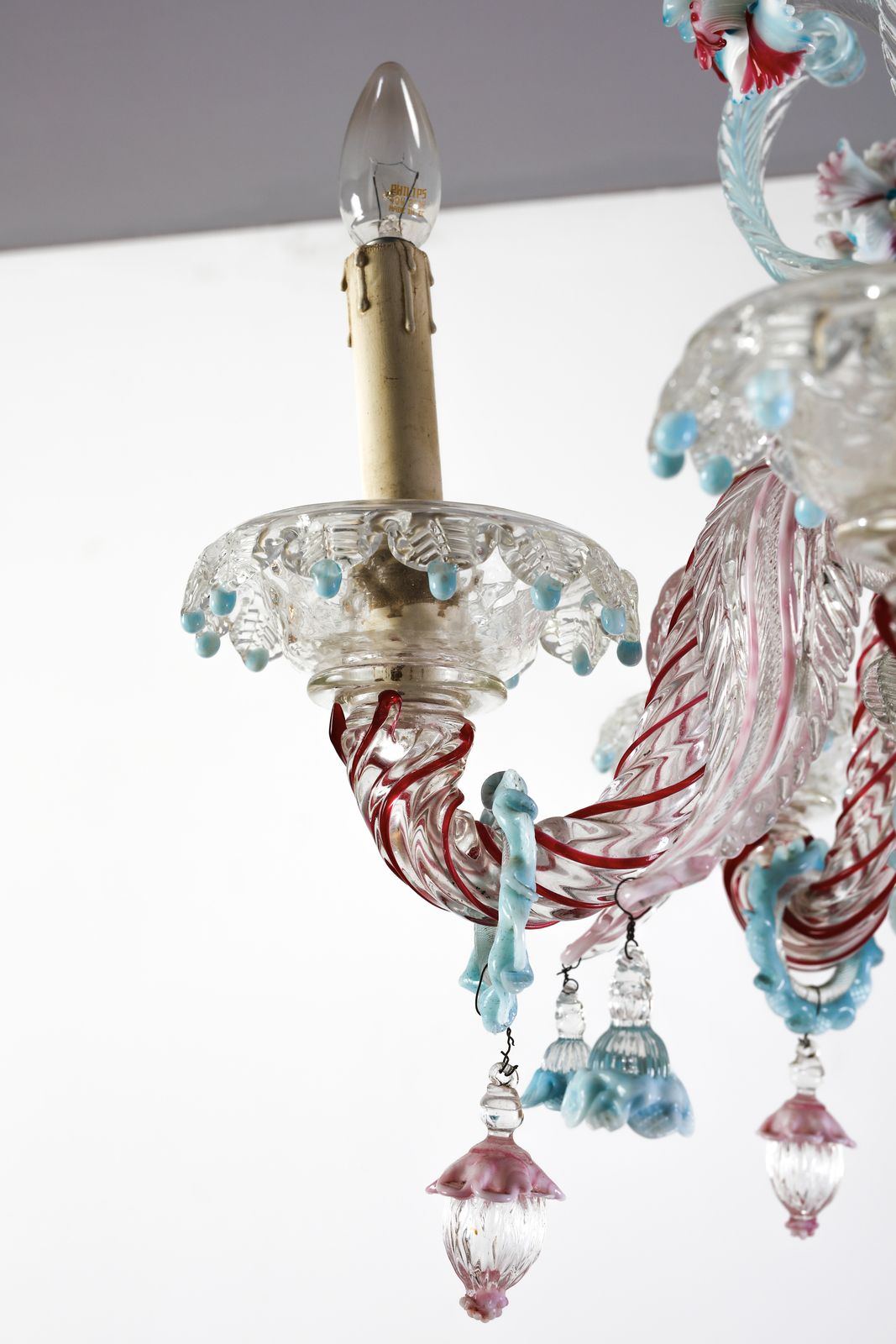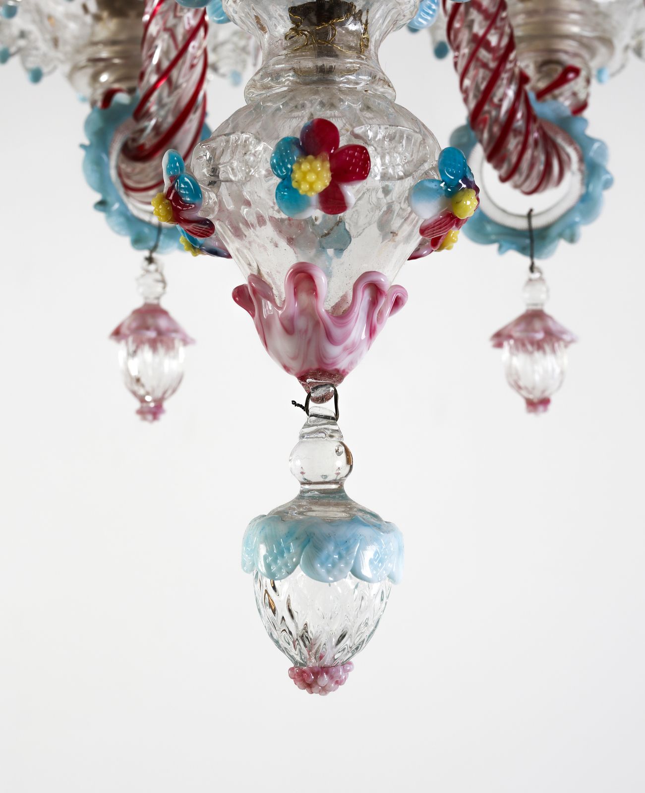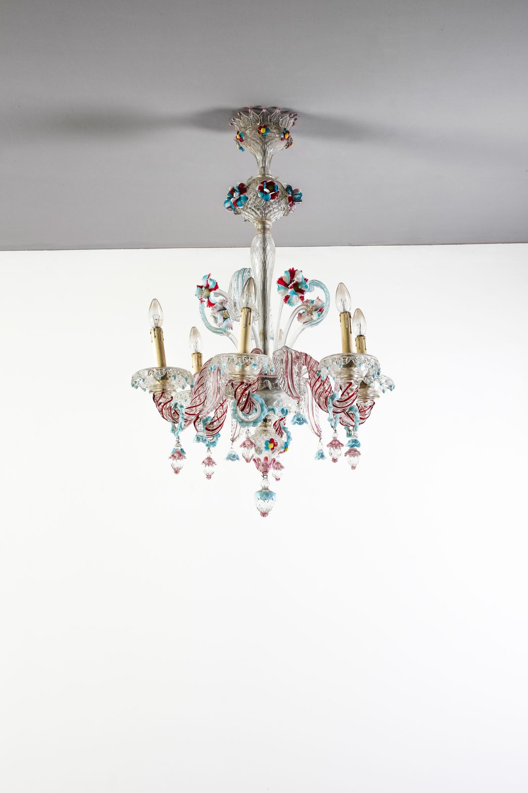 Lampadario in vetro di Murano incolore e e policromo, arricchito da decorazioni [..]