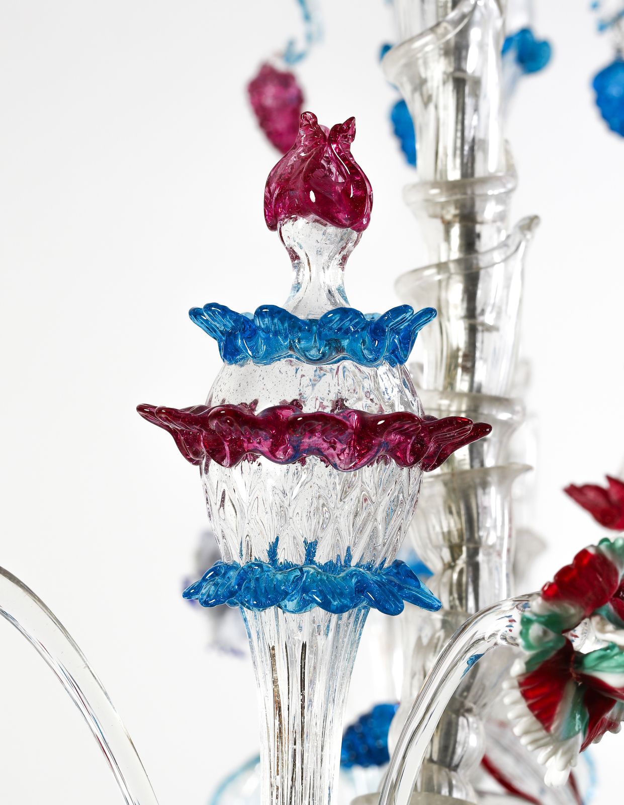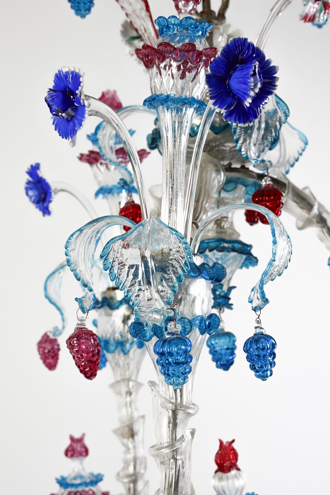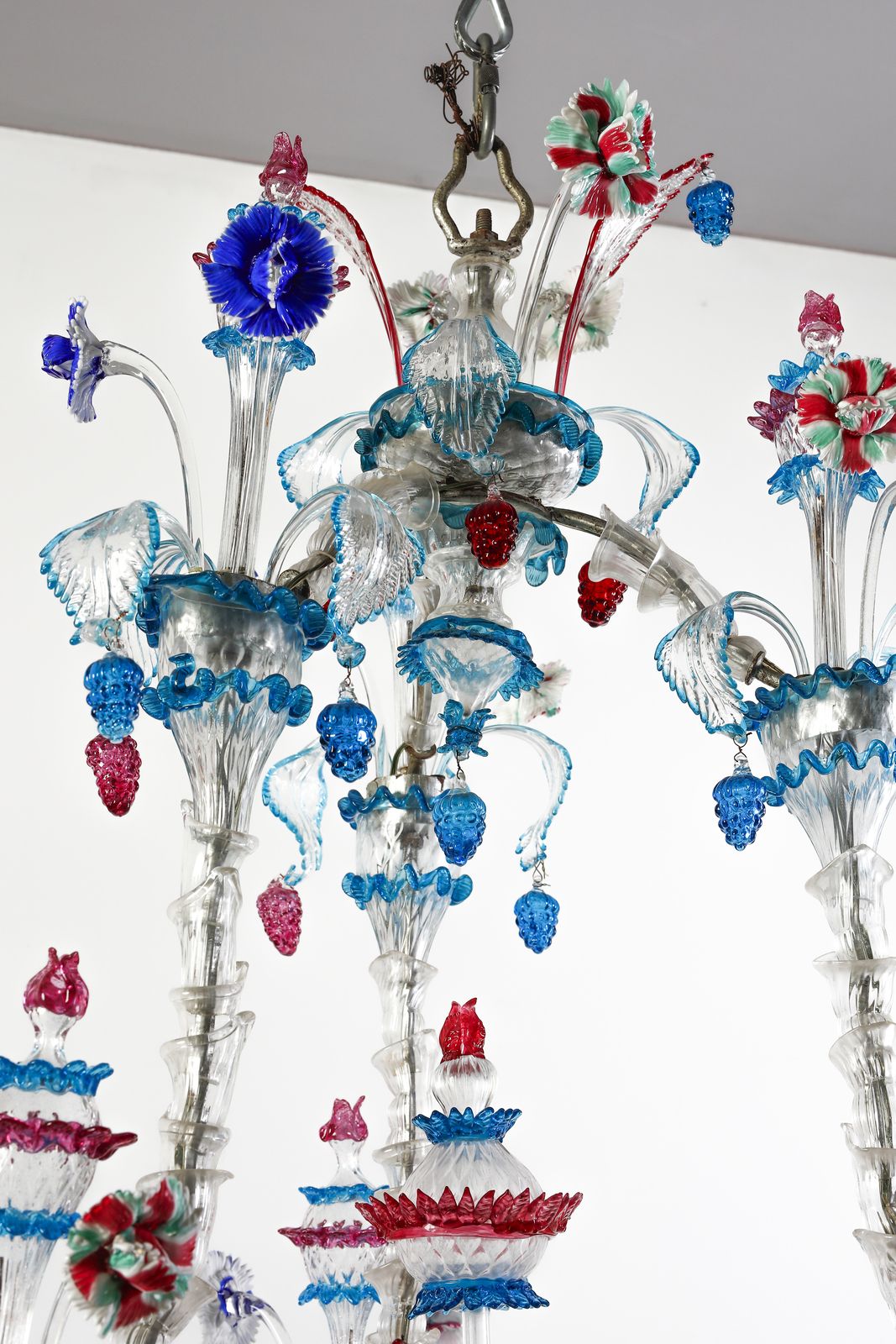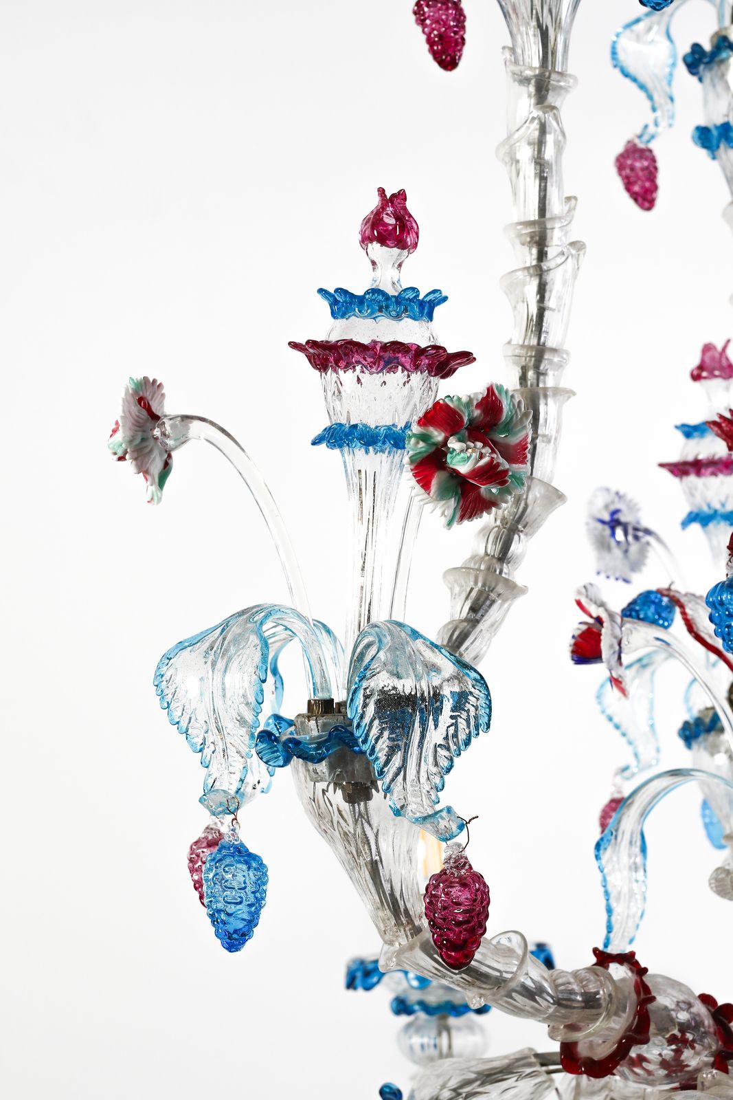 Lampadario in vetro di Murano incolore e policromo, arricchito da steli con corolle [..]