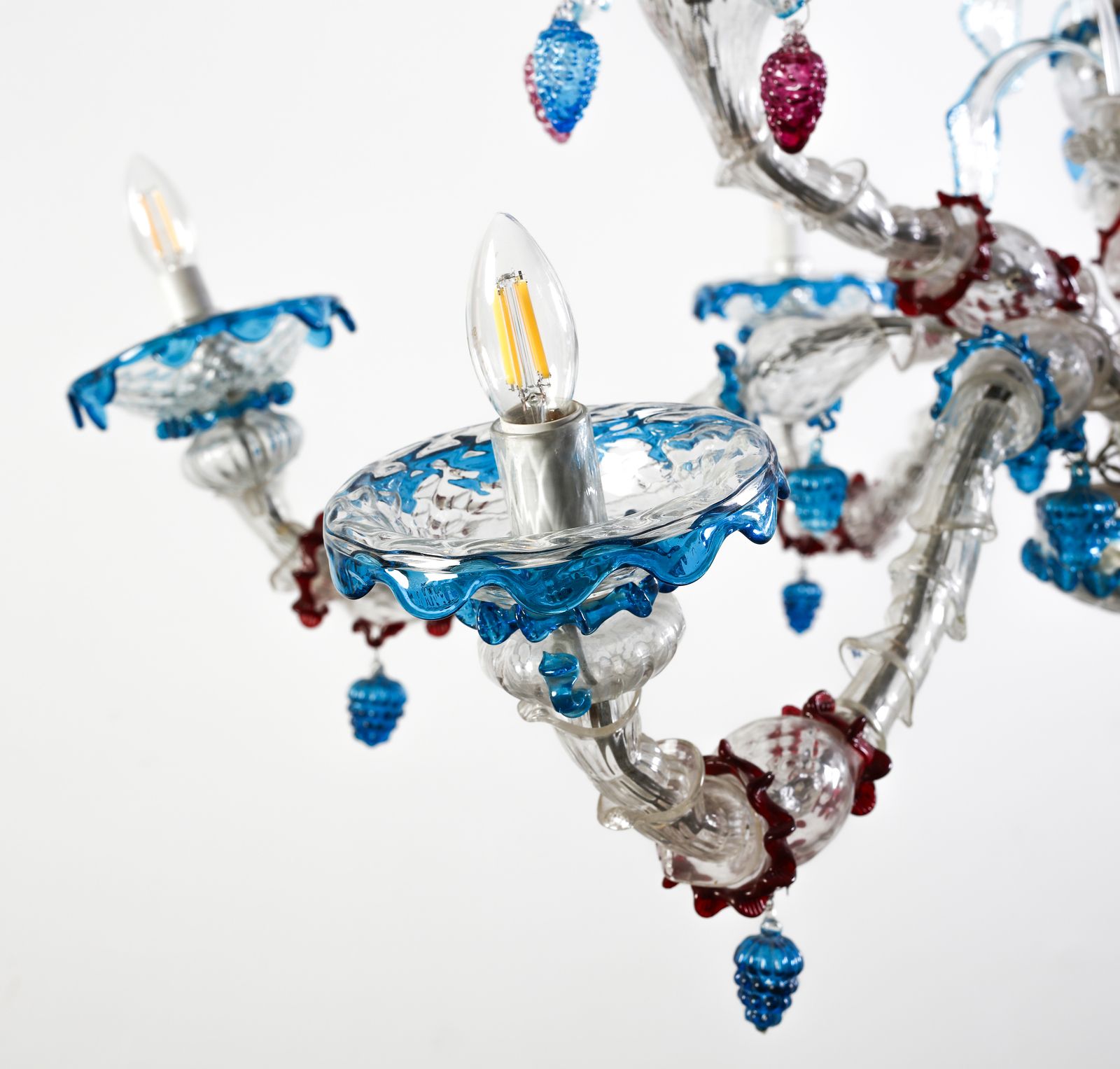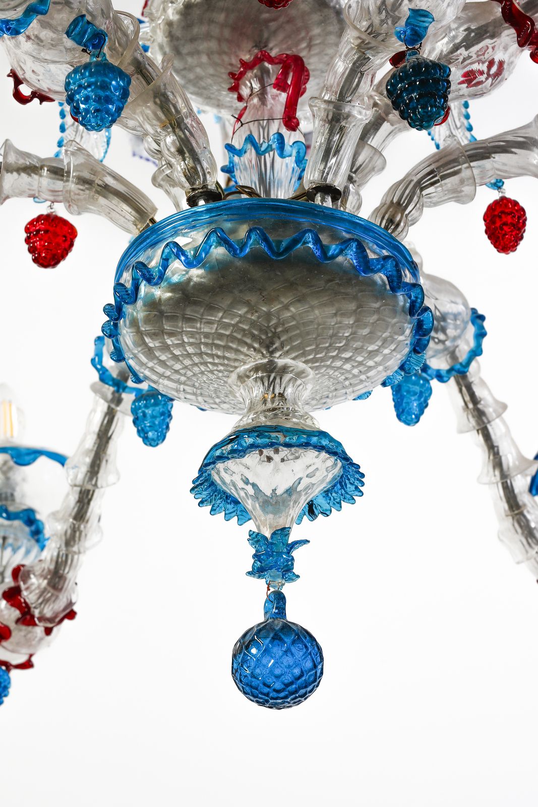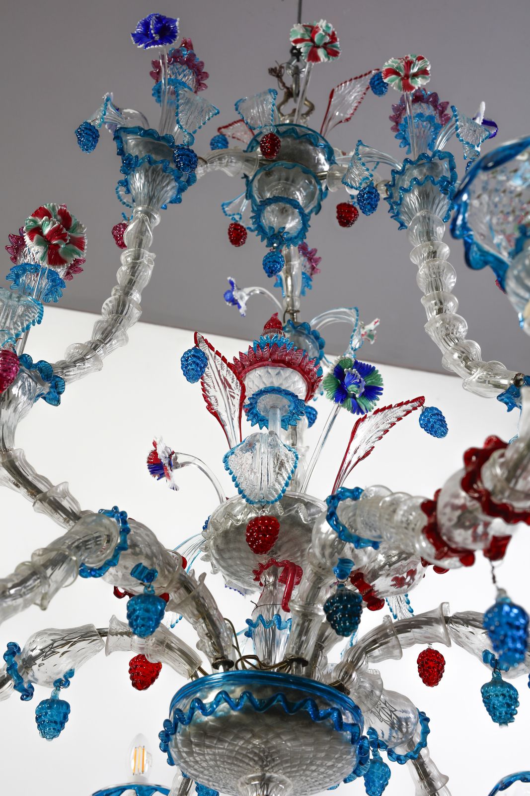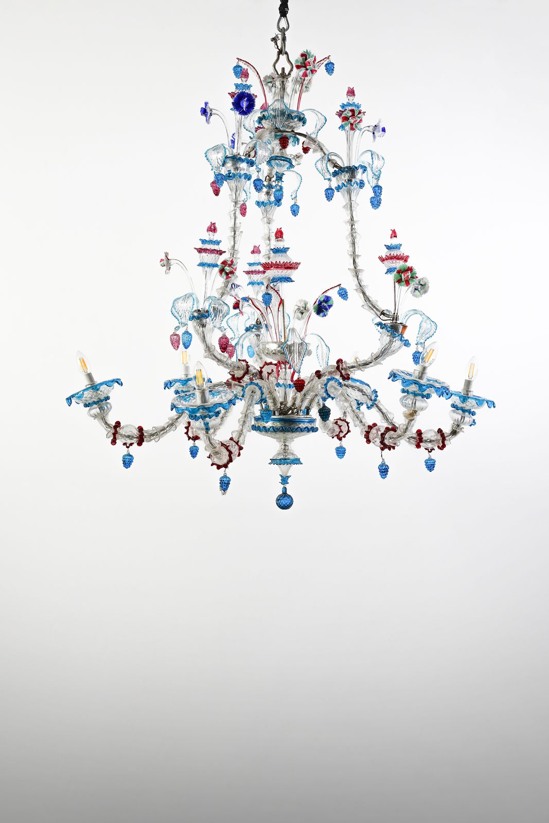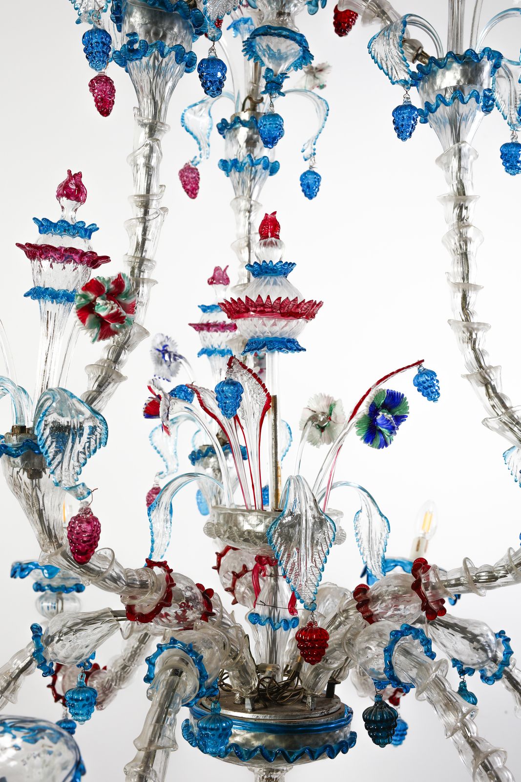 Lampadario in vetro di Murano incolore e policromo, arricchito da steli con corolle [..]
