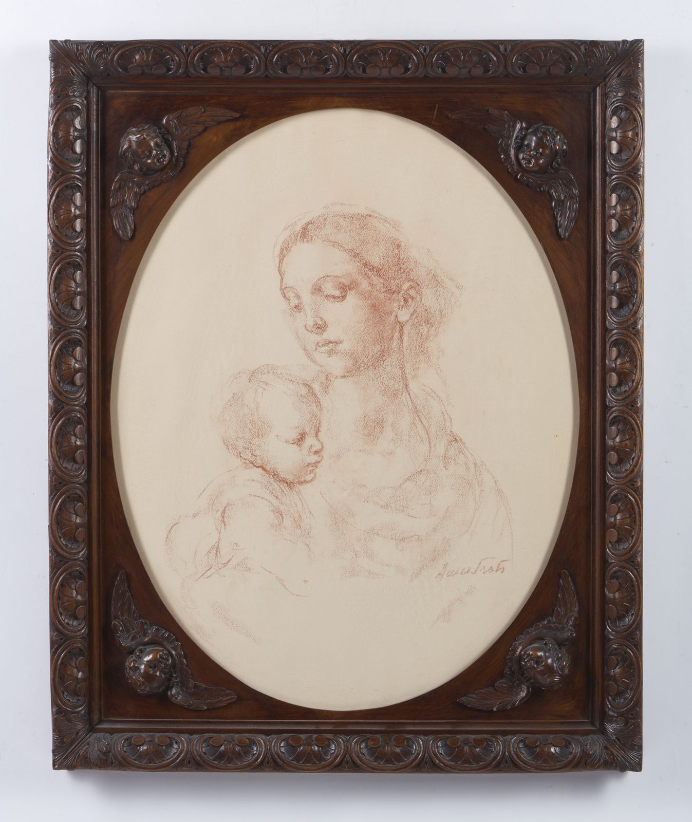 Madonna con Bambino entro cornice in legno intagliato con quattro figure di putti [..]