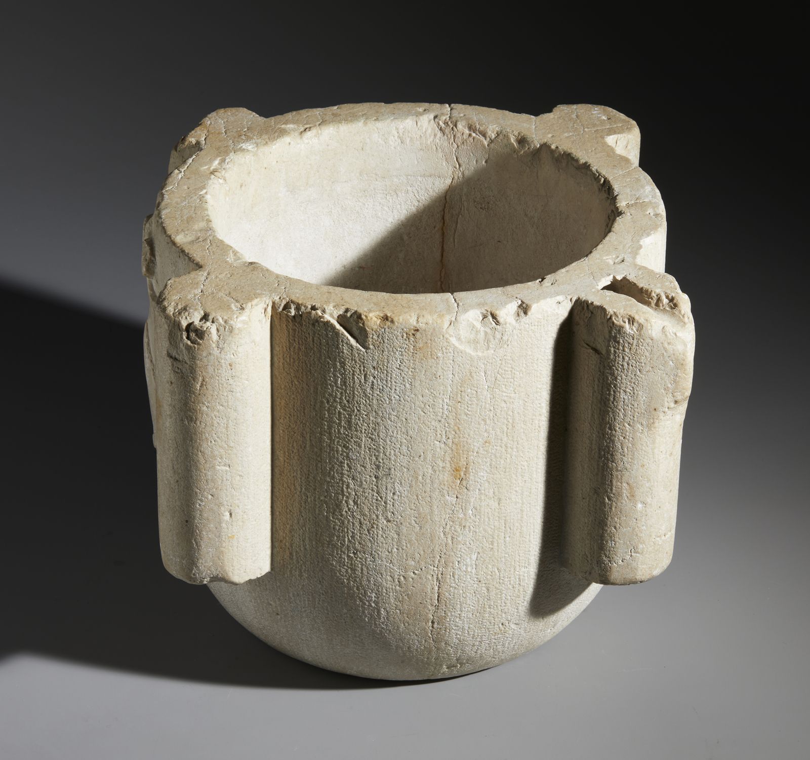 Mortaio in pietra di Botticino con stemma nobiliare, possibilmente riferibile alla [..]