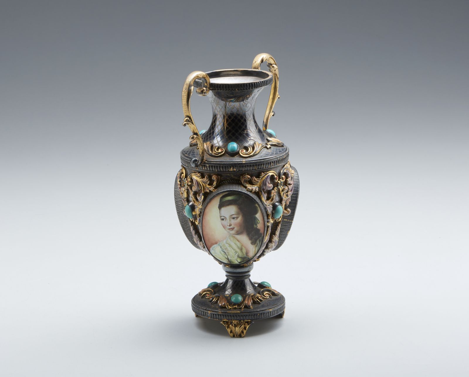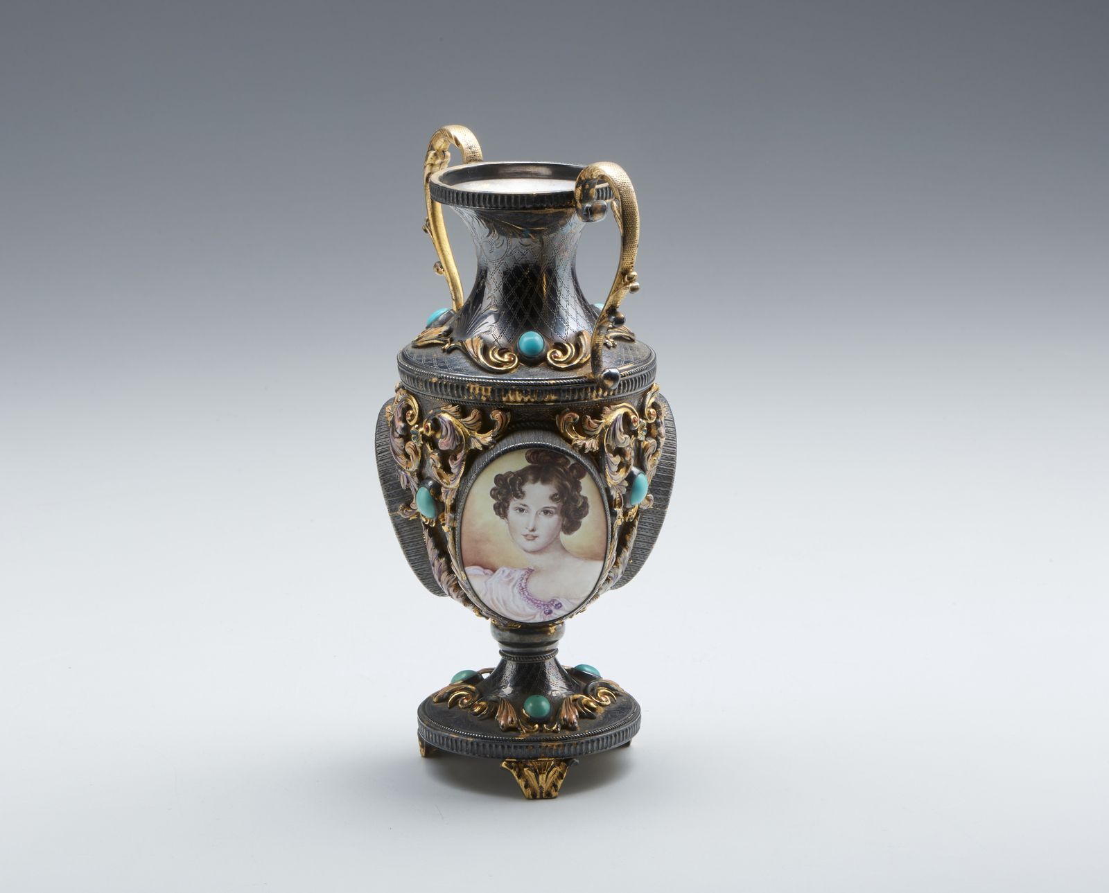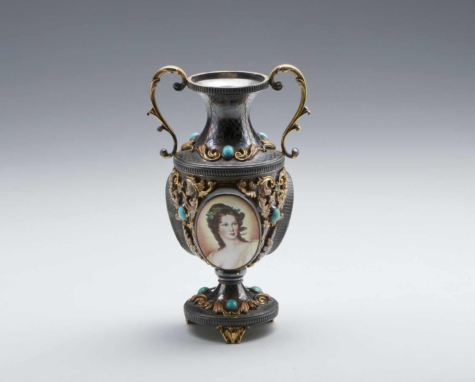 Piccolo vaso in metallo cesellato e parzialmente dorato, con inserti di pietre dure [..]