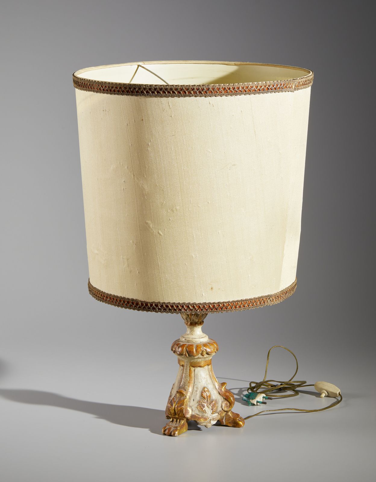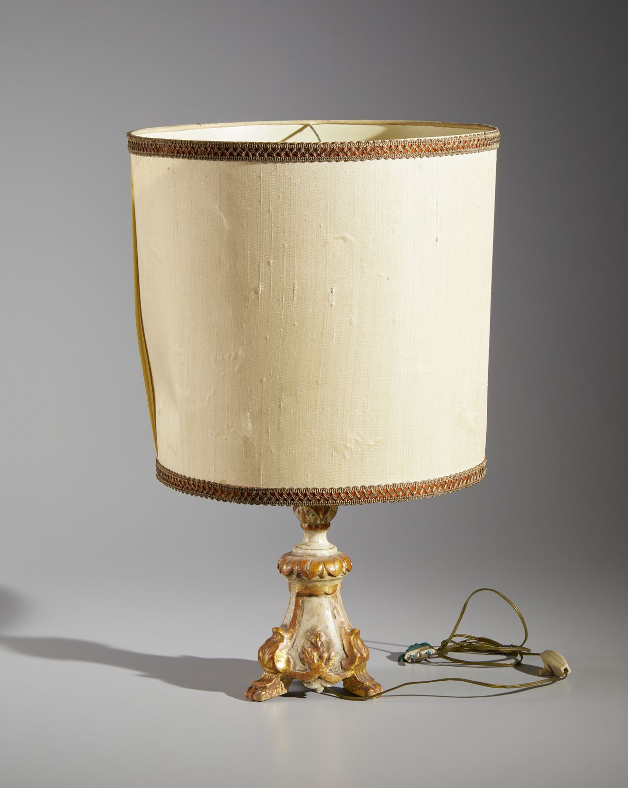 Portacero in legno intagliato, parzialmente dorato e laccato, montato a lampada [..]