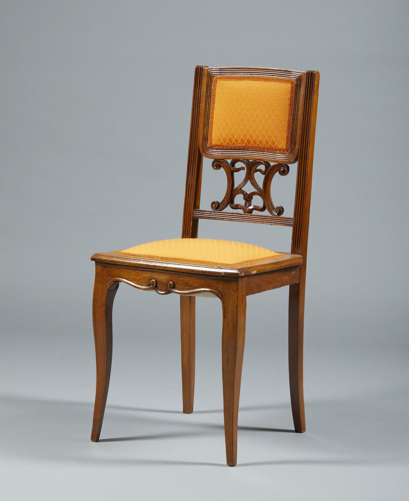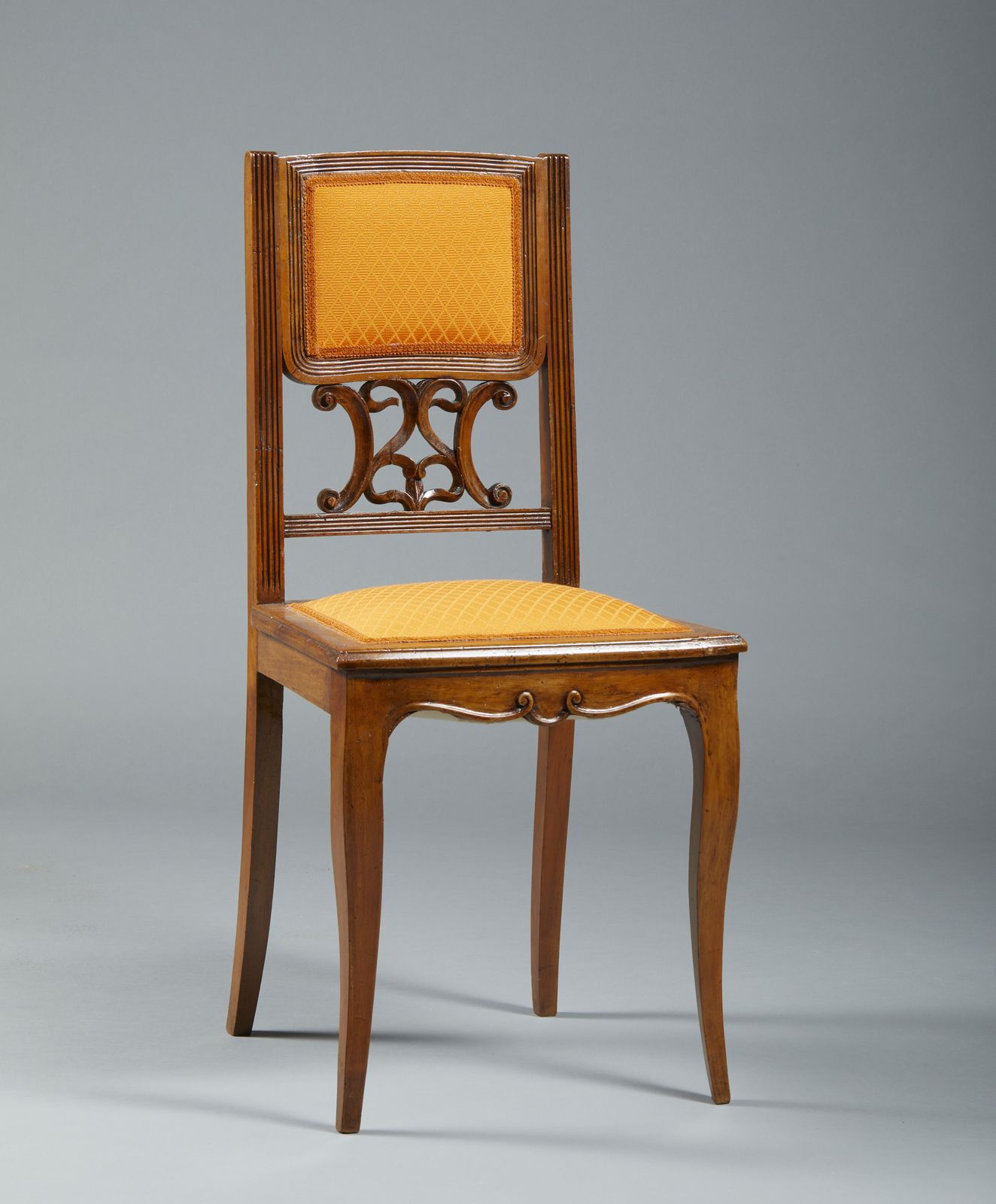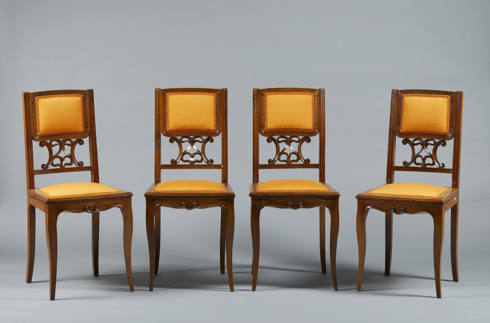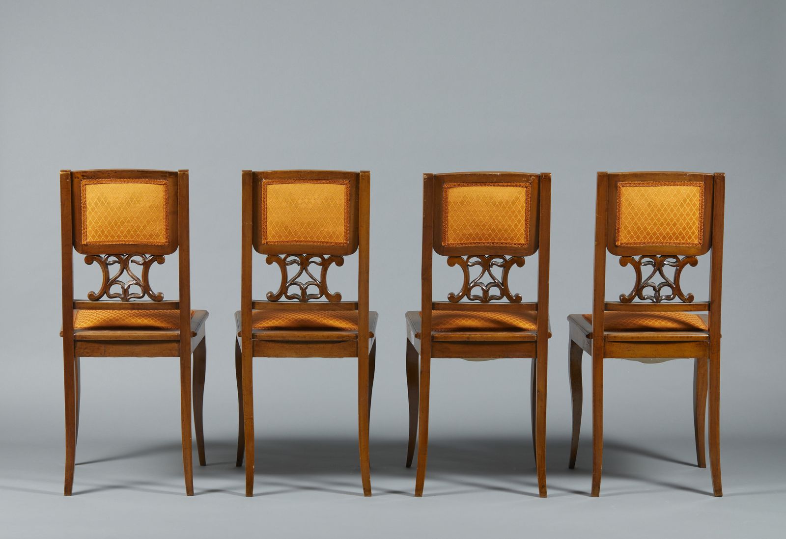Quattro sedie in noce intagliato con raccordo tra seduta e schienale a giorno, imbottitura [..]