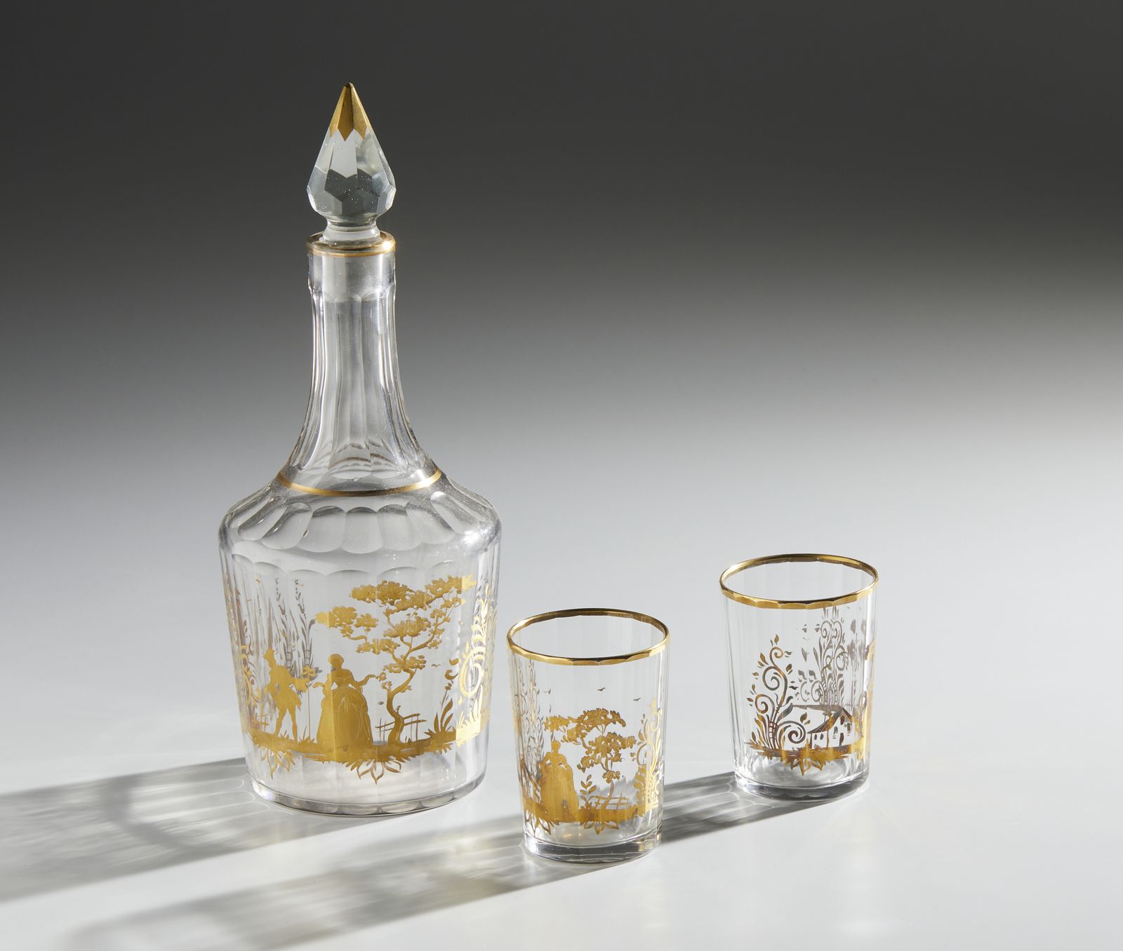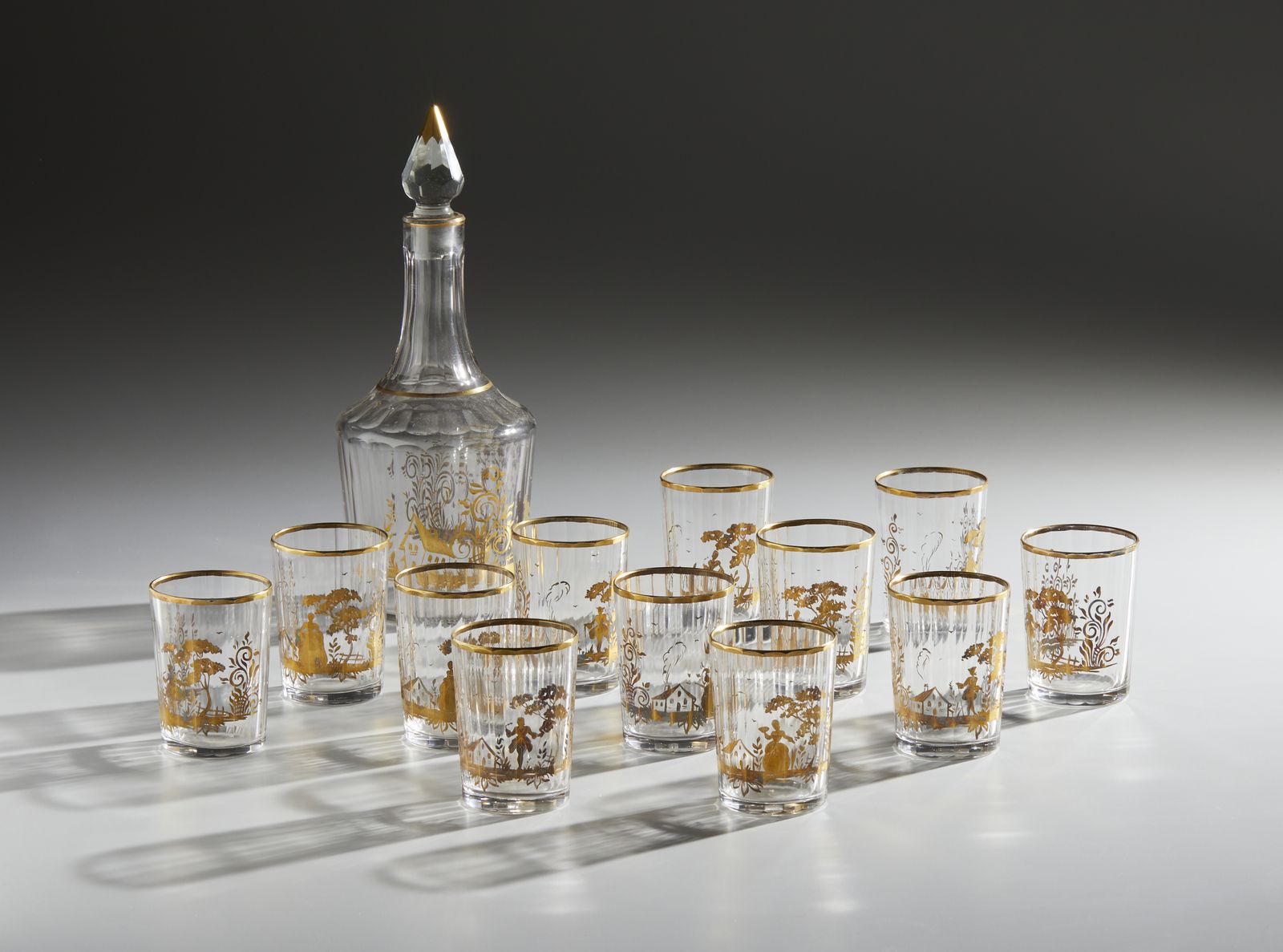 Servizio di 12 bicchieri e bottiglia in vetro parzialmente dorato, elementi di forma [..]