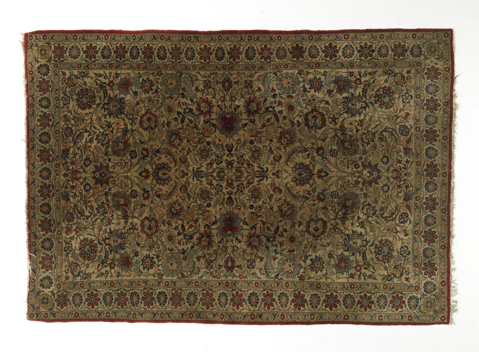 Tappeto con fitte decorazioni fitomorfe su fondo crema, incorniciato da fascia e [..]