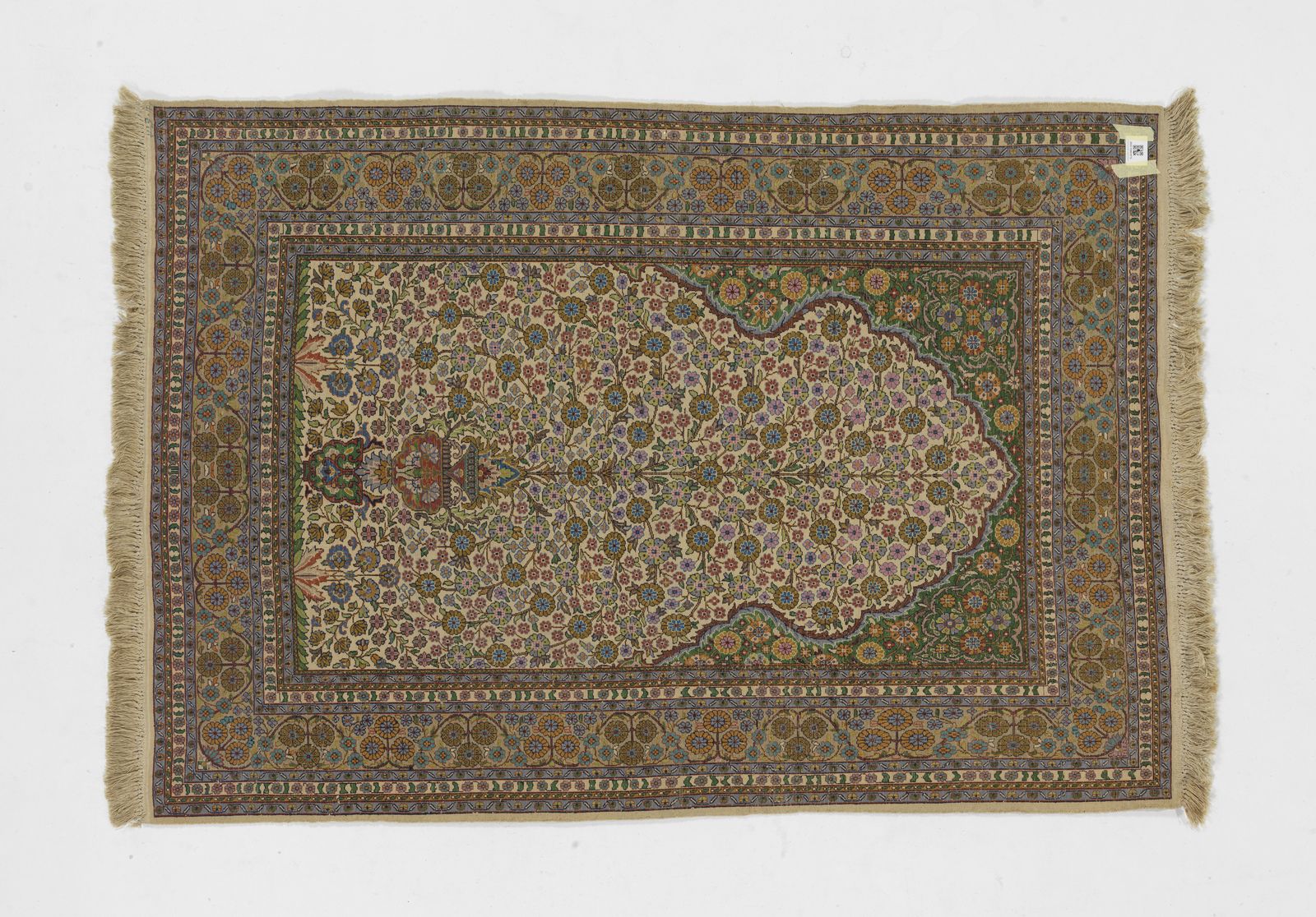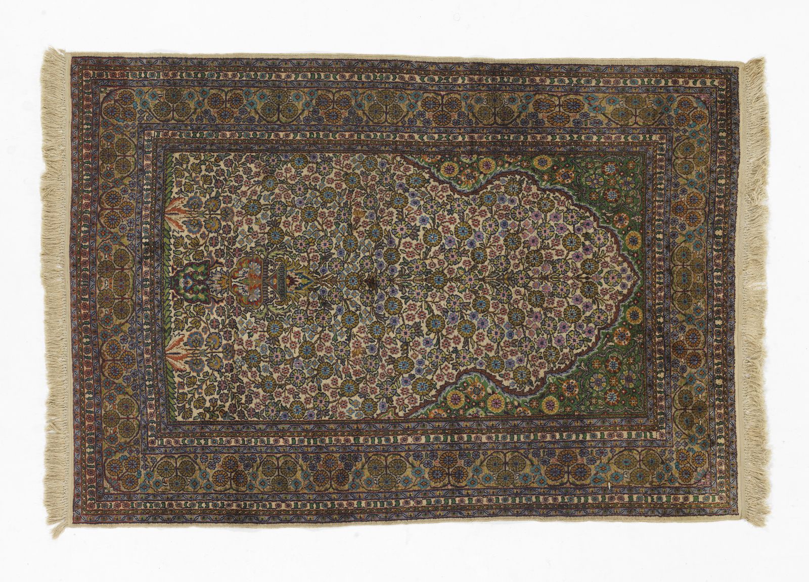 Tappeto India con decorazione centrale a nicchia fittamente decorata a motivi floreali, [..]