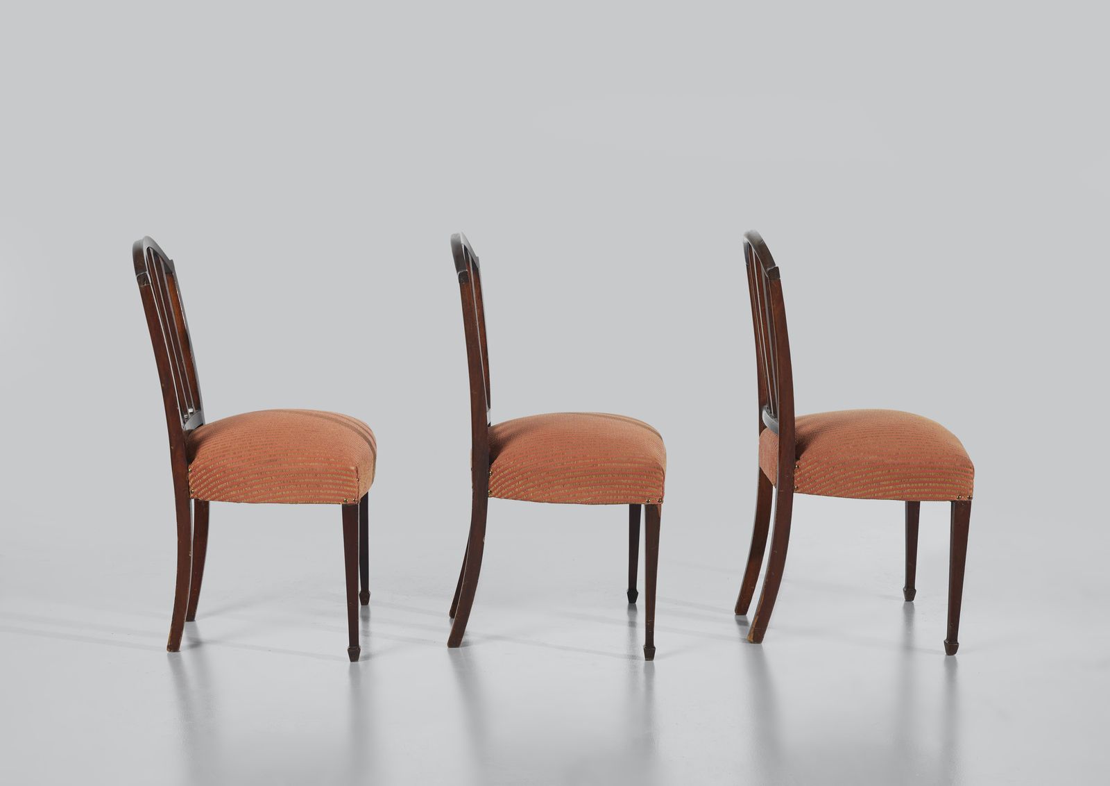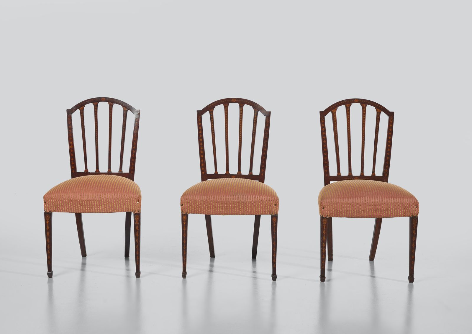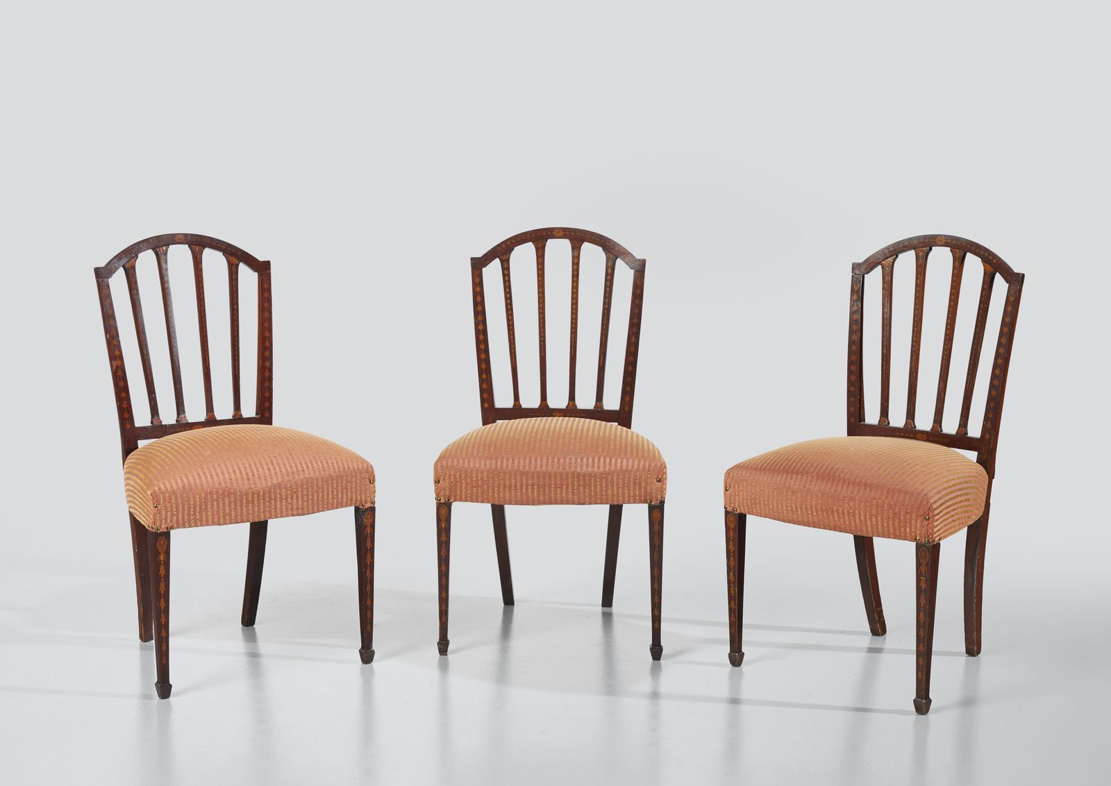 Tre sedie in legno intarsiato con schienale a giorno, gambe posteriori a sciabola, [..]