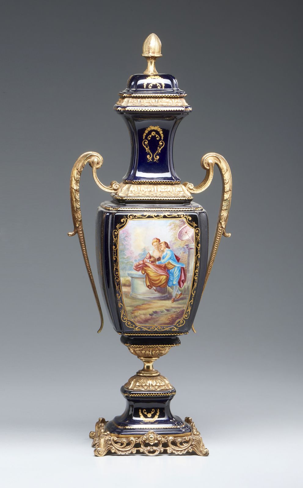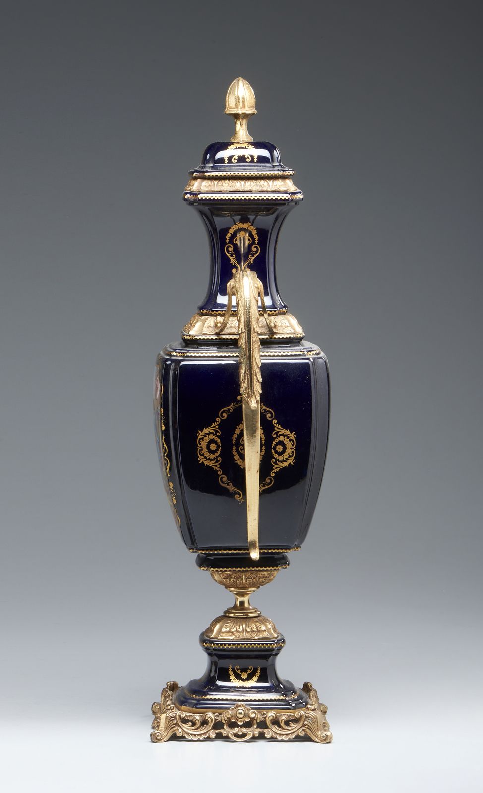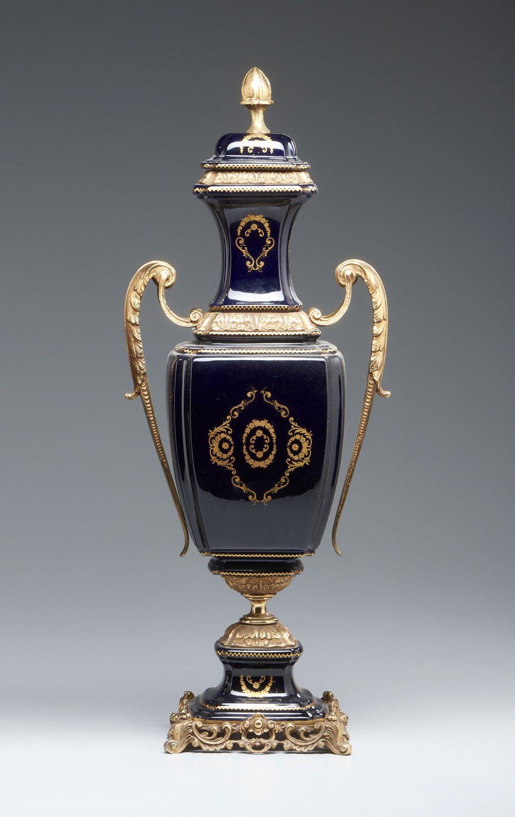 Vaso biansato in porcellana blu con decorazioni dorate, applicazioni e base in [..]