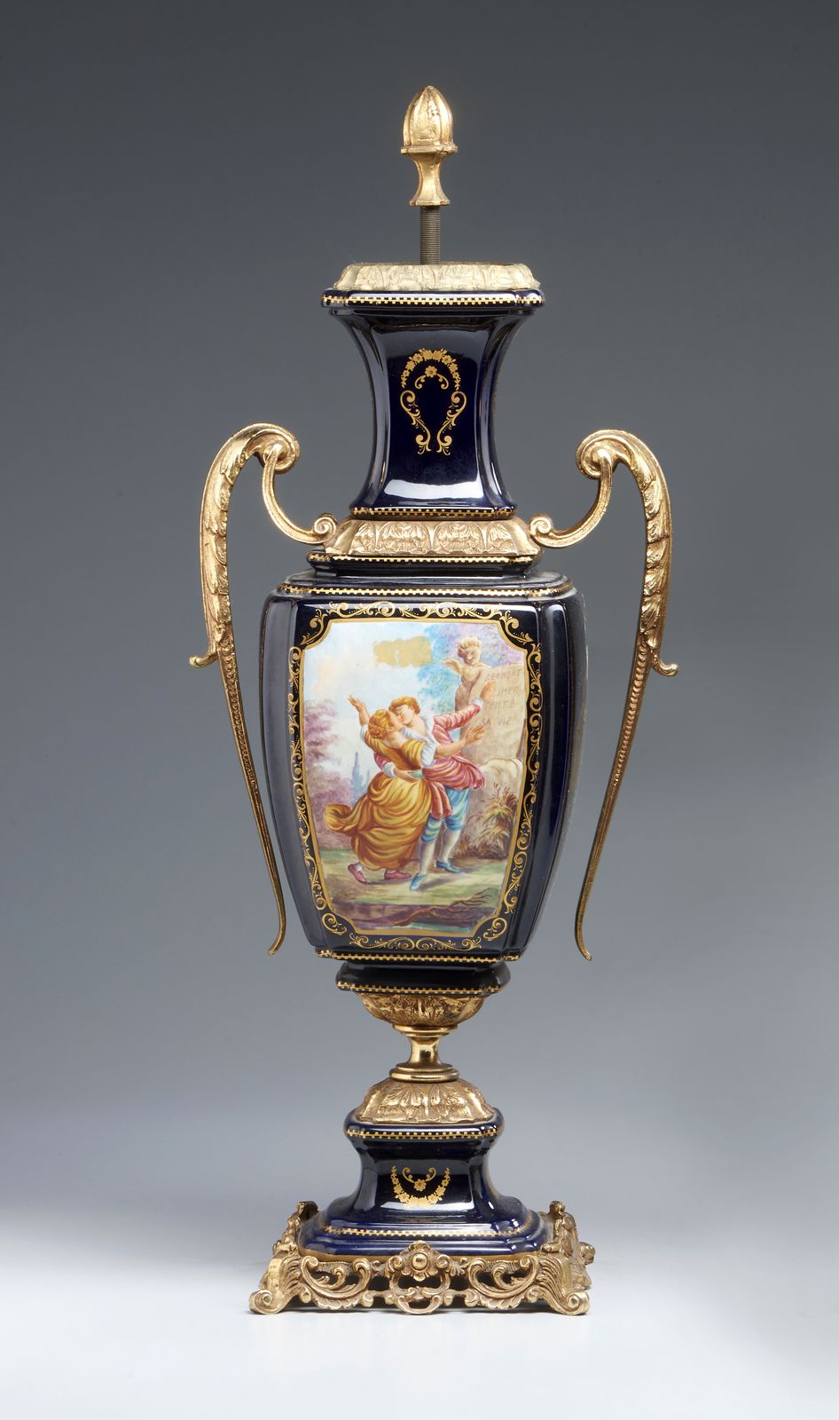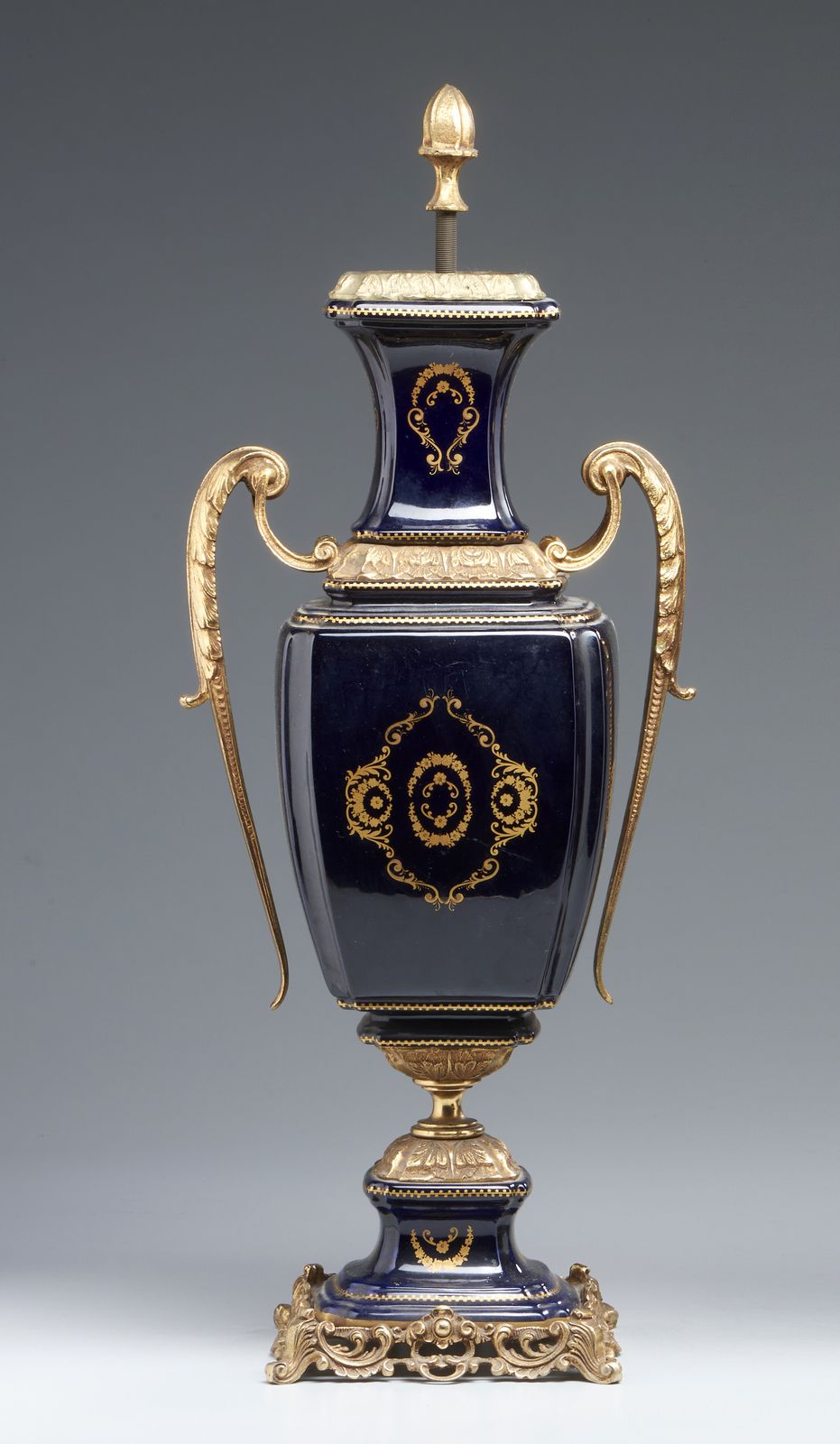 Vaso biansato in porcellana blu con decorazioni dorate, applicazioni e base in [..]
