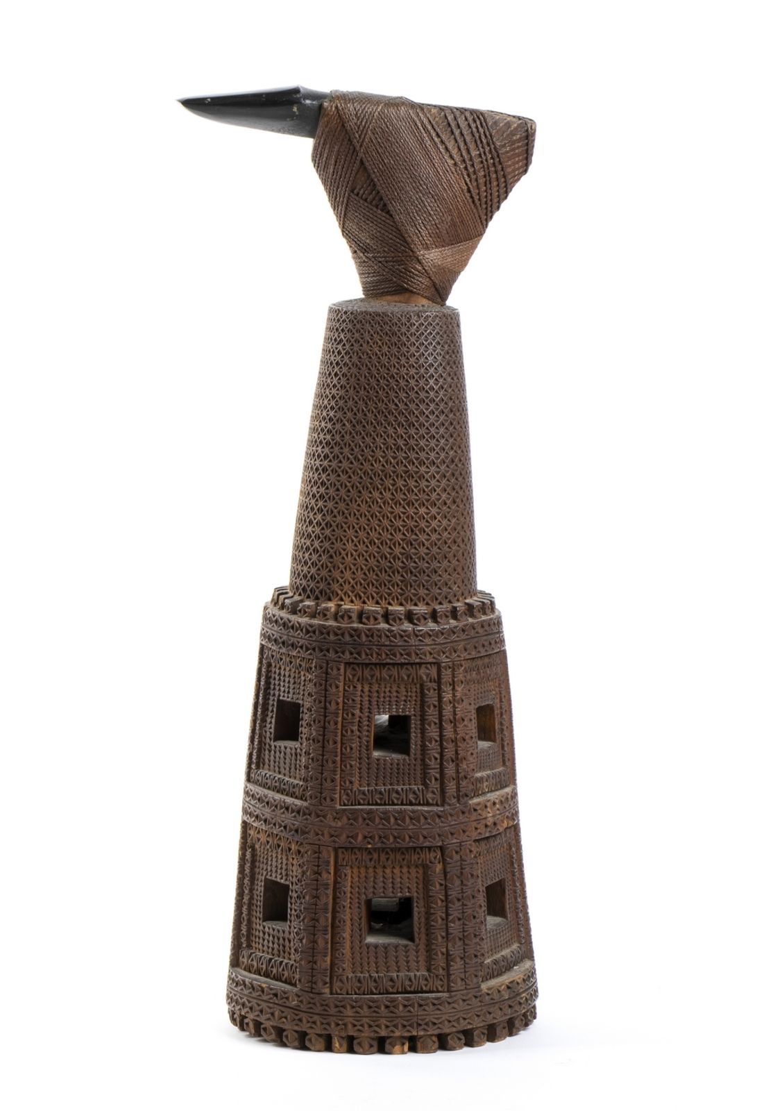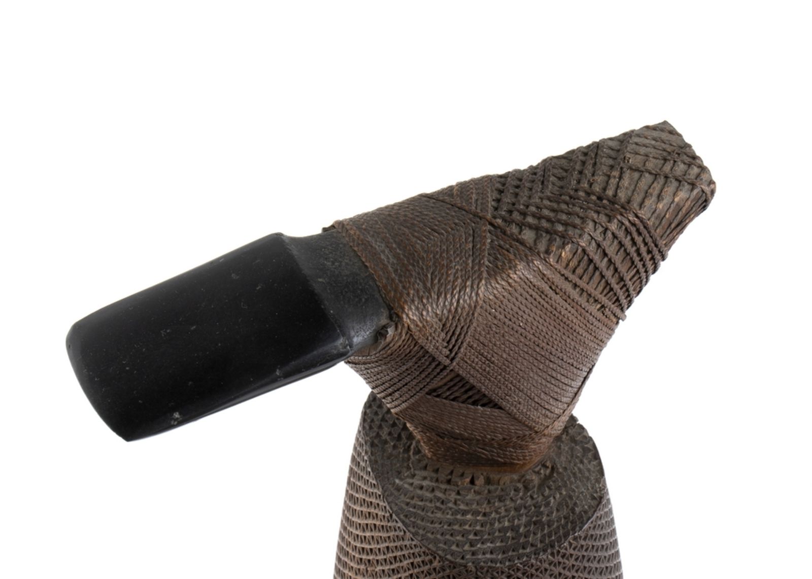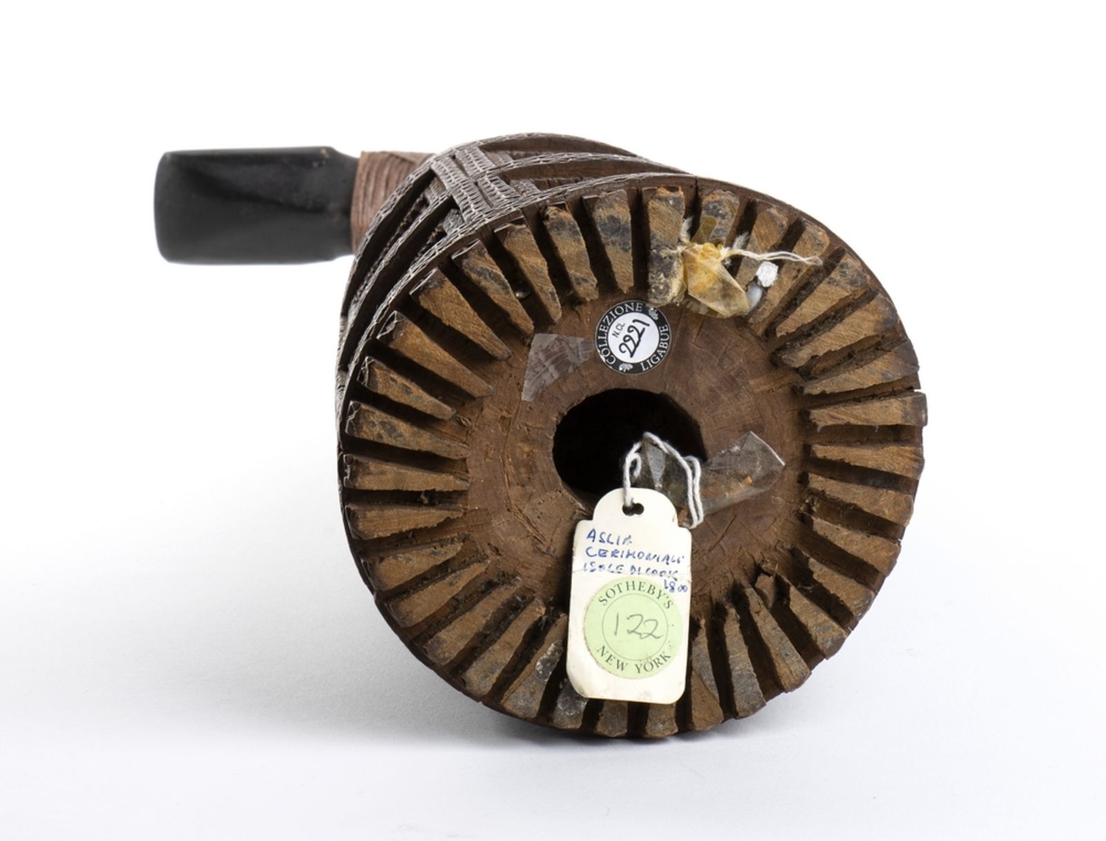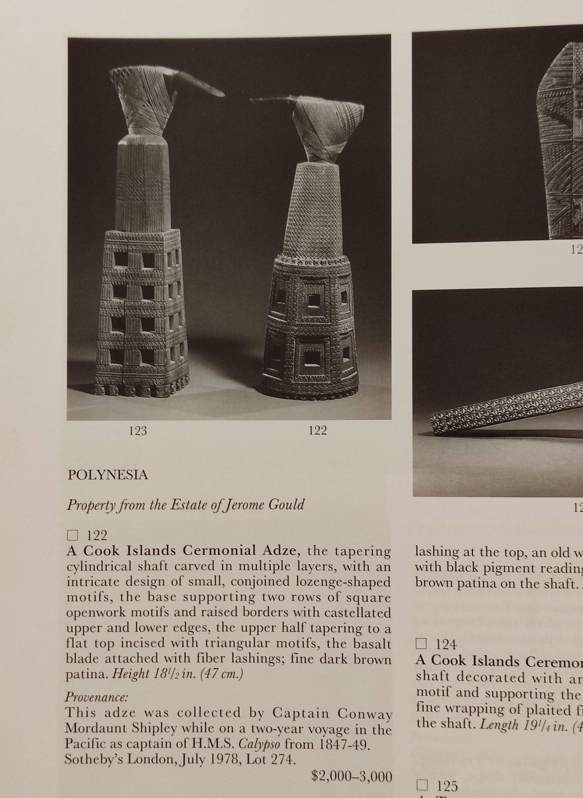 Ascia cerimoniale proveniente dall'Isola di Mangaia composta da legno, fibre naturali e pietra. Questo monumentale strumento veniva usato, secondo alcuni studi, per uccidere vittime sacrificali al Dio Rongo. Secondo altri studiosi veniva scambiato come dono importante tra Capi d'isola. Provenienza: il lotto presentato fu raccolta dal capitano Congway Mordaunt Shipley durante un viaggio di due anni nel Pacifico come ufficiale della nave Calypso, dal 1847 al 1849. Ex Sotheby's Londra, luglio 1978, lot 274. Bibliografia: ''Arte dell'Oceania'', Museo preistorico - etnografico L. Pigorini, De Luca Editore, 1971. (foto pagina libro e catalogo).