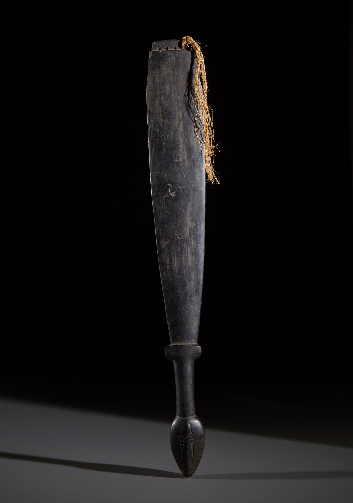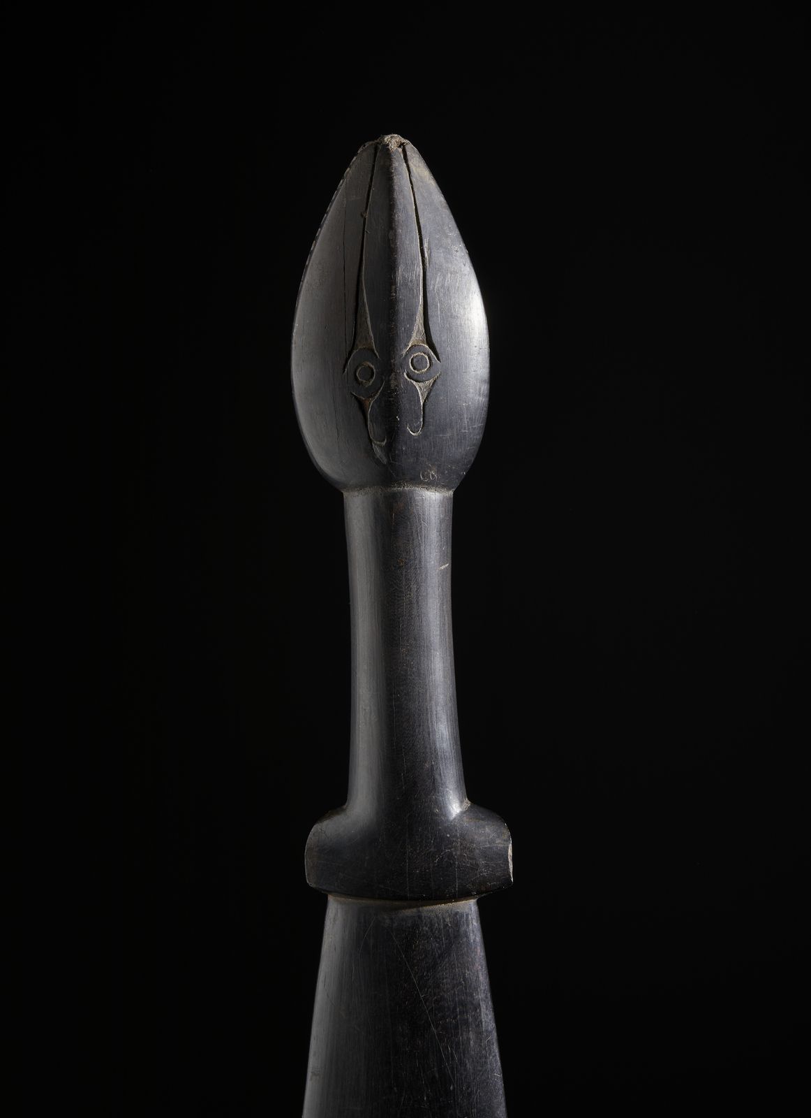 Su un'estremità notiamo una testa di coccodrillo scolpita, animale sacro per molti popoli del Pacifico.