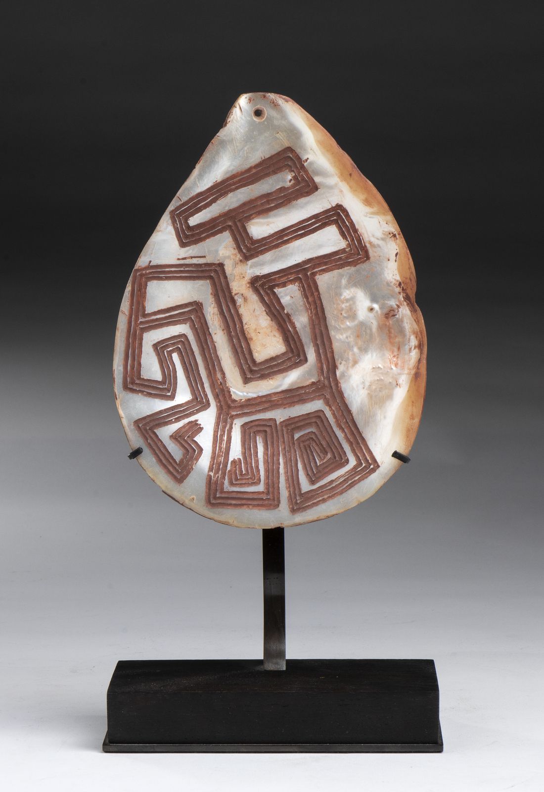 La conchiglia è in perfette condizioni e presenta una decorazione geometrica in ocra rossa. Provenienza: Ex collezione Mc. Alpine. Bibliografia: pubblicata su Ligabue Magazine N 46, pag. 40.