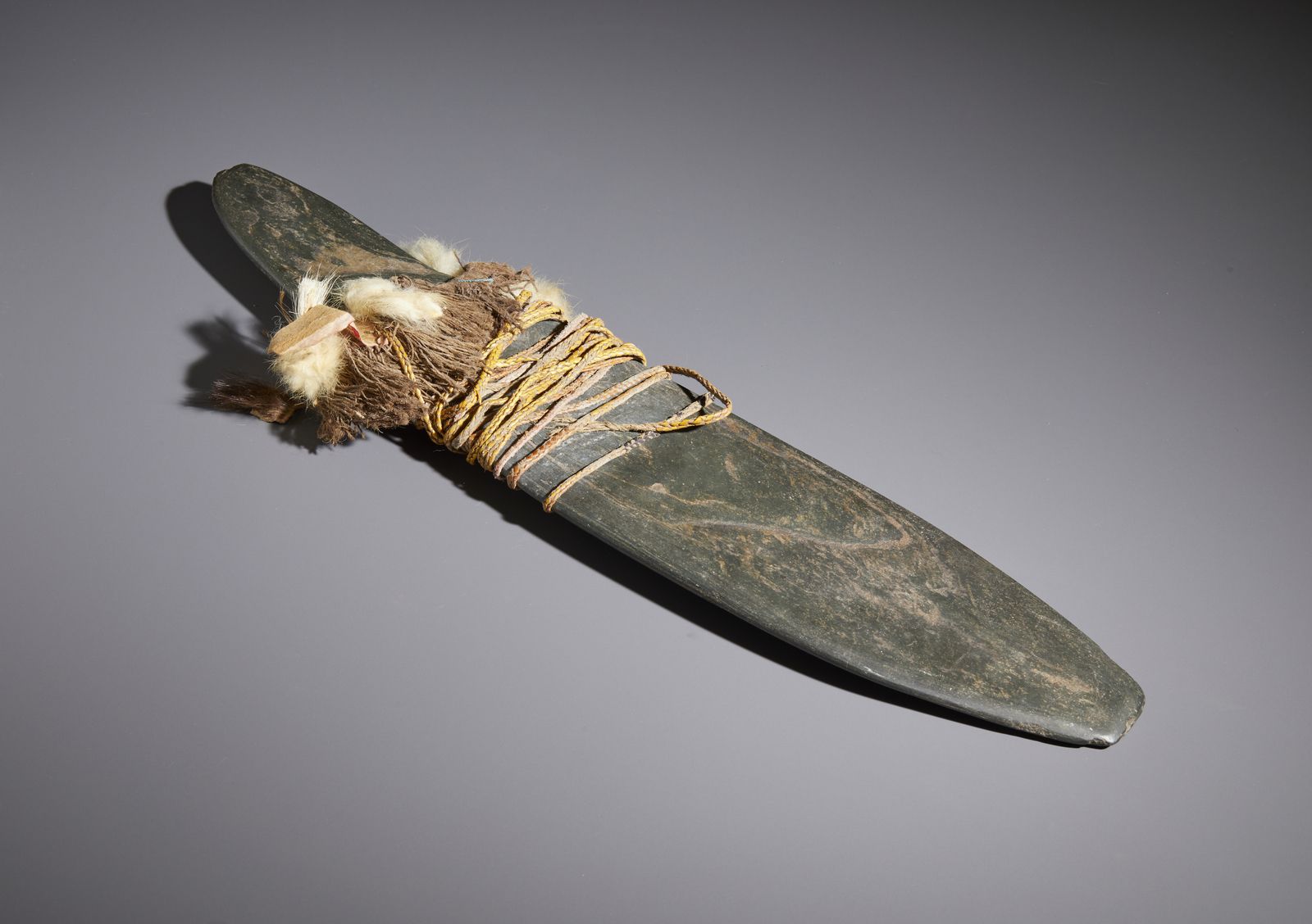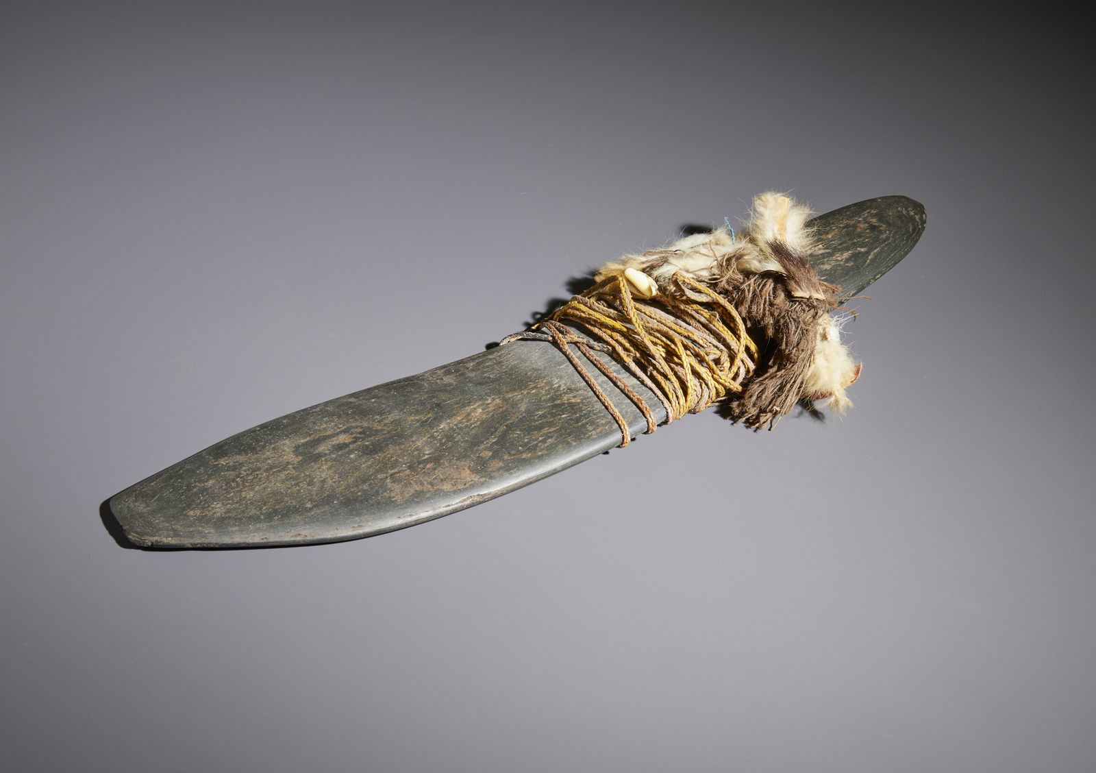 L' ascia è sapientemente legata ed intrecciata con piume e fibre naturali.