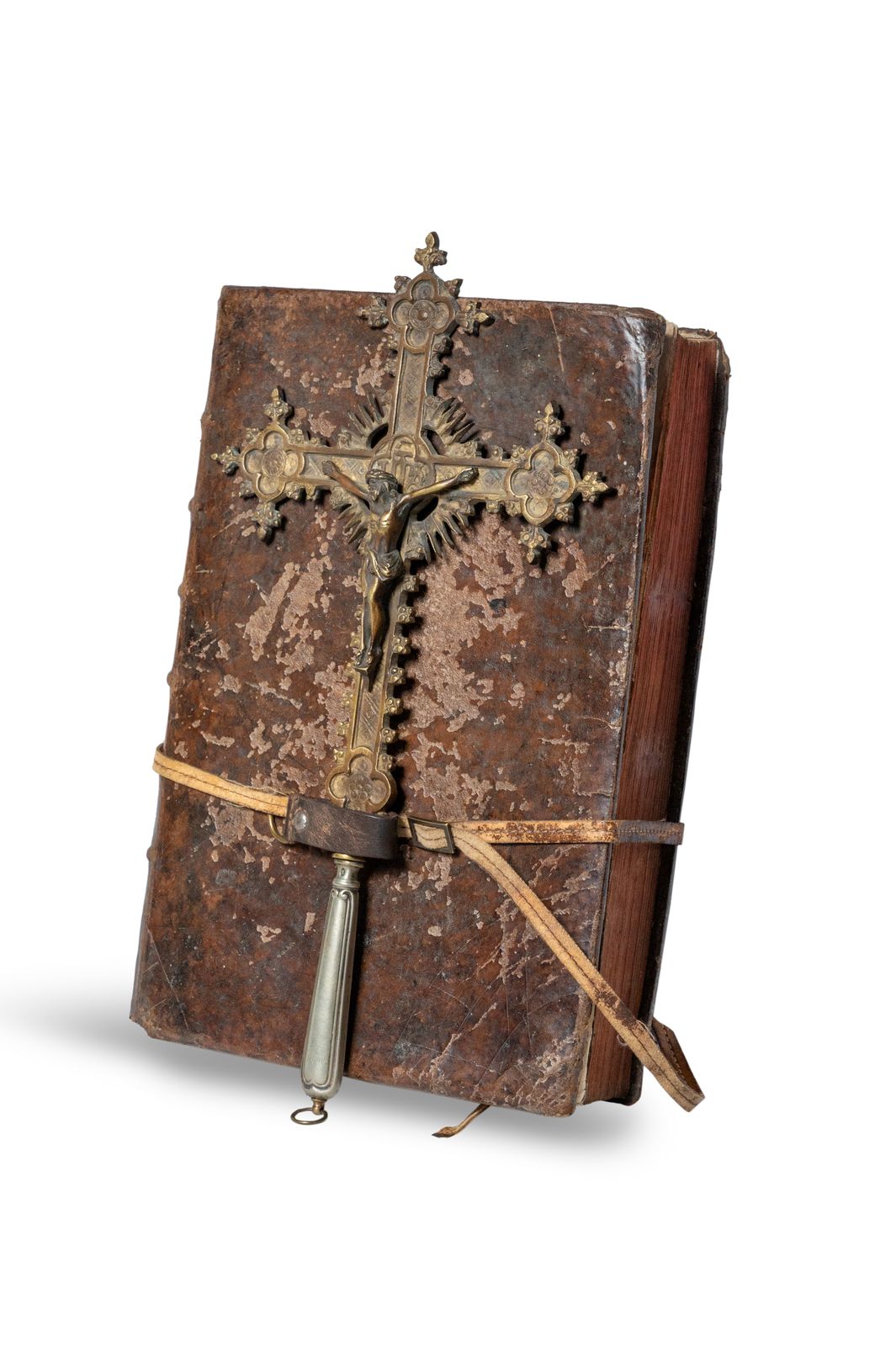 Interessante e unico kit anti vampiri ricavato da una Bibbia dell'800 scritta in lingua francese. Il set è composto da dieci elementi tra cui: un crocifisso in ghisa, una Bibbia, due paletti in legno di frassino, un martello in quercia, tre bottigliette in vetro per l'acqua santificata, un cavatappi per il sughero delle bottigliette e un piccolo crocifisso da rito. L'oggetto è ansiano e accompagnato da un certificato proveniente da una galleria polacca specializzata in cimeli esoterici.