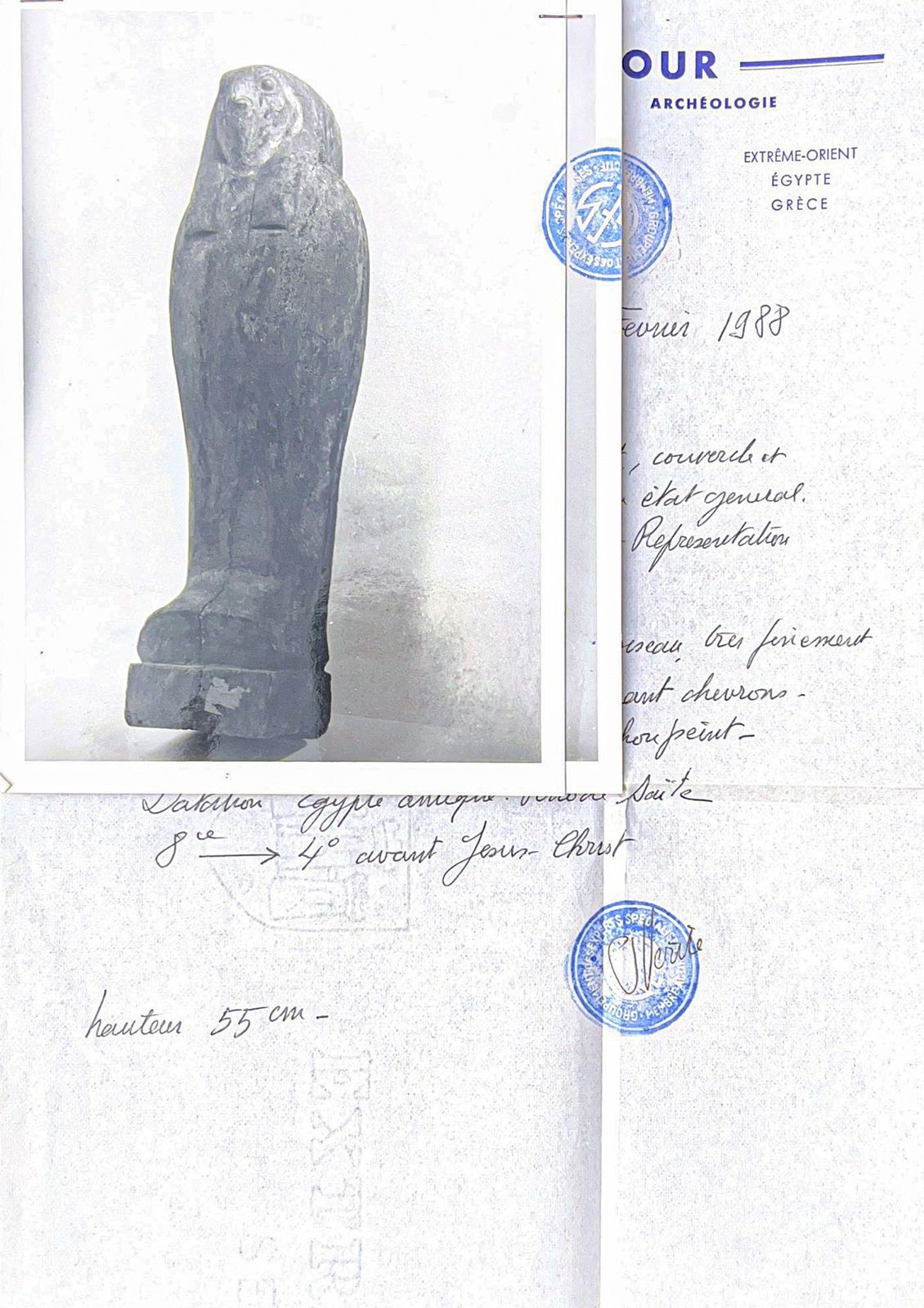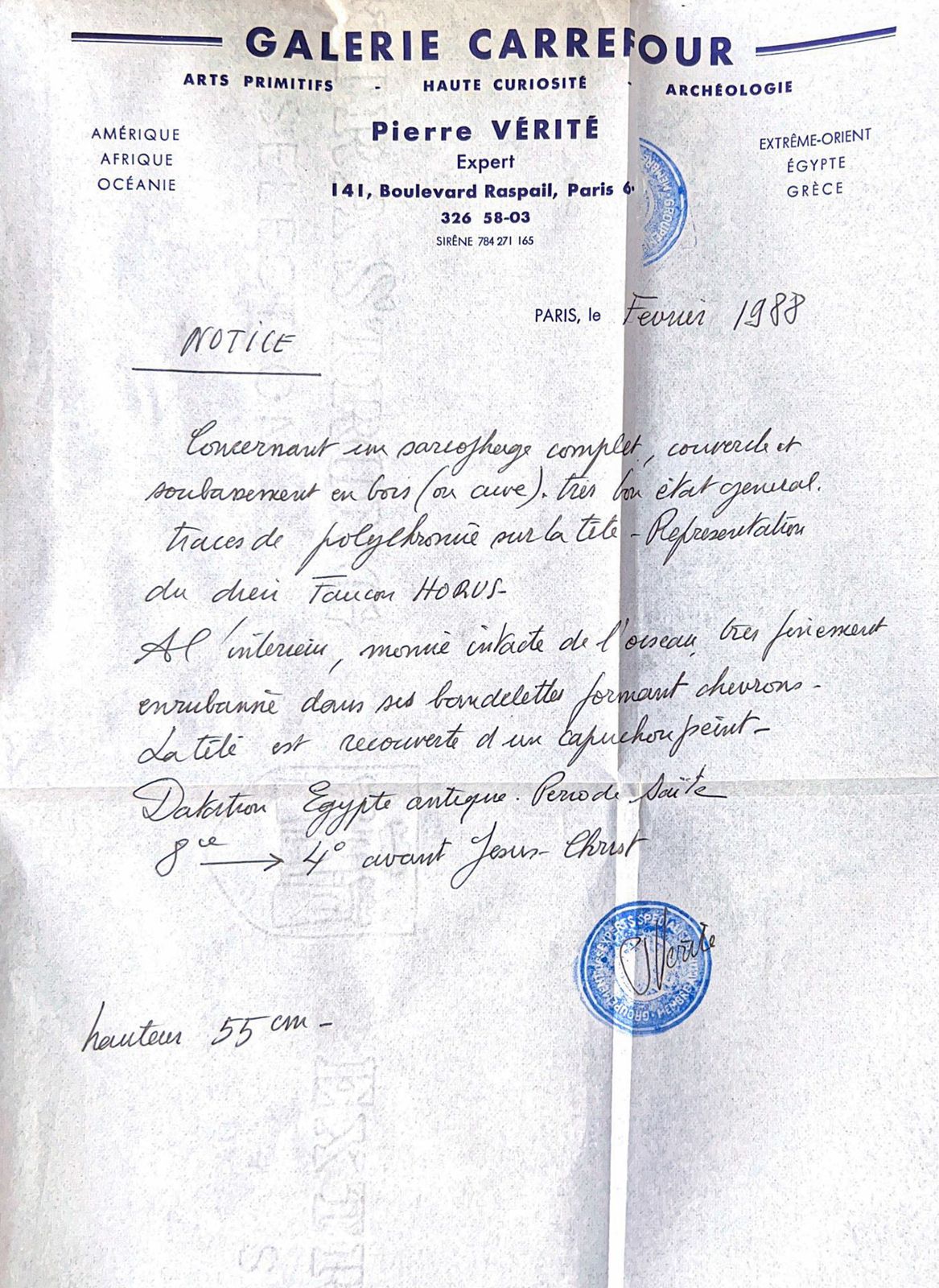 Le condizioni generali sono ottime e troviamo tracce policrome sul coperchio e sulla testa interna della mummia, che indossa una sorta di cappuccio dipinto e modellato con bitume o pece. Il corpo intatto della mummia è avvolto da strisce di cotone molto raffinate con intreccio a spina di pesce.I raggi X mostrano lo scheletro intatto del falco posizionato con le ali conserte, posa caratteristica delle mummificazioni umane. Secondo alcuni studi, la piccola frattura presente sull’ala destra potrebbe aver condotto l’animale all’indebolimento e in seguito alla morte.Ad accompagnare l’oggetto abbiamo due documenti originali provenienti da La Galerie Carrefour, galleria specializzata in archeologia e in arti primitive, magistralmente condotta dal grande esperto e pubblico personaggio Pierre Vérité.La Gallerie Carrefour vendeva a personaggi illustri come Pablo Picasso e i documenti testimoniano studi accurati sull’oggetto firmati dallo stesso Vérité a Parigi durante il febbraio del 1988.Lotto corredato da Certificato di Libera Esportazione rilasciato dalla Direction Générale Des Patrimoinesm, Francia. L'oggetto è attualmente ubicato in Francia.