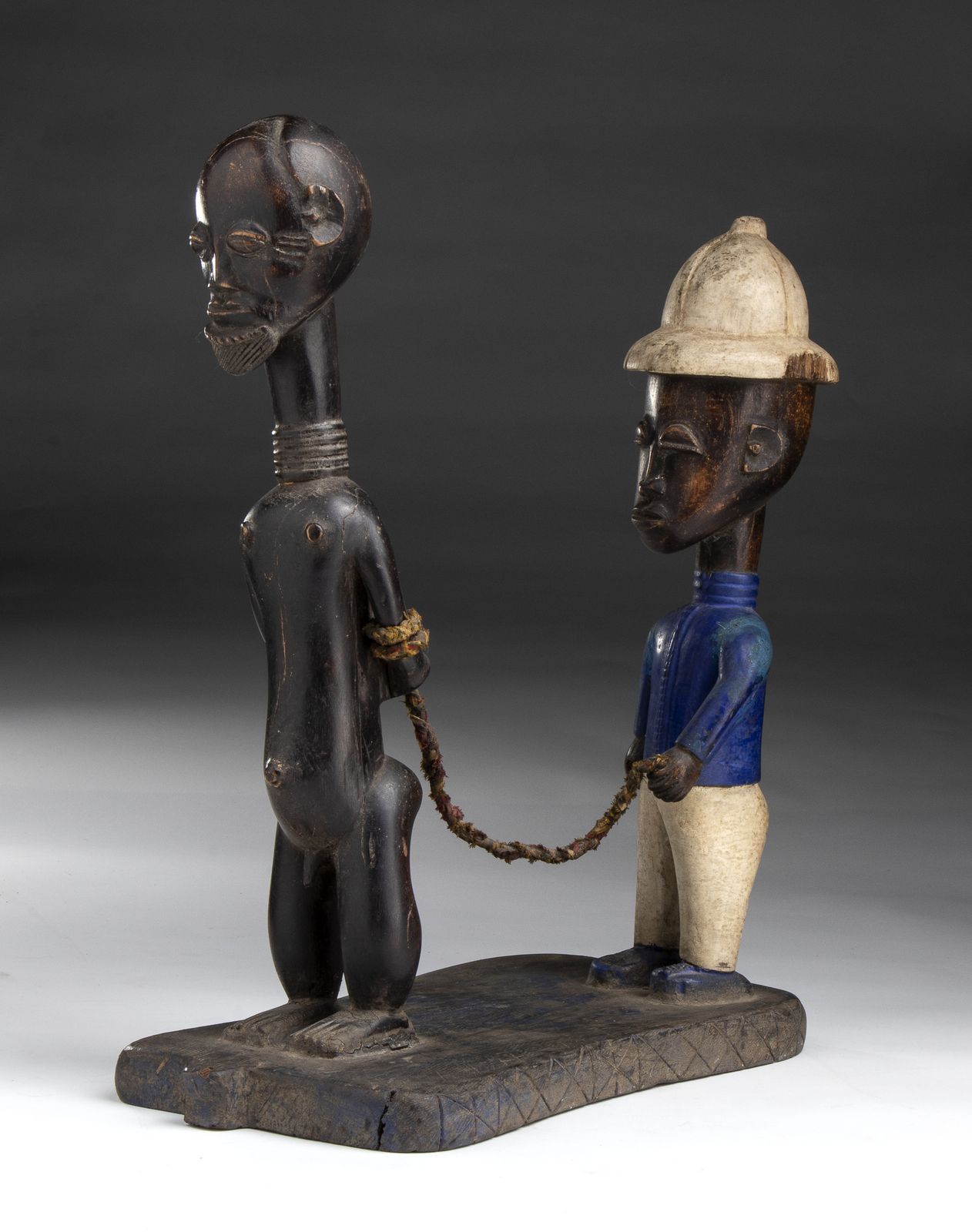 Rappresentante un uomo africano in vesti coloniali mentre trasporta tramite catene un altro uomo africano schiavizzato. Provenienza: Totem Gallery, Venezia. 1992. Presente certificato d'autenticità Totem Gallery.